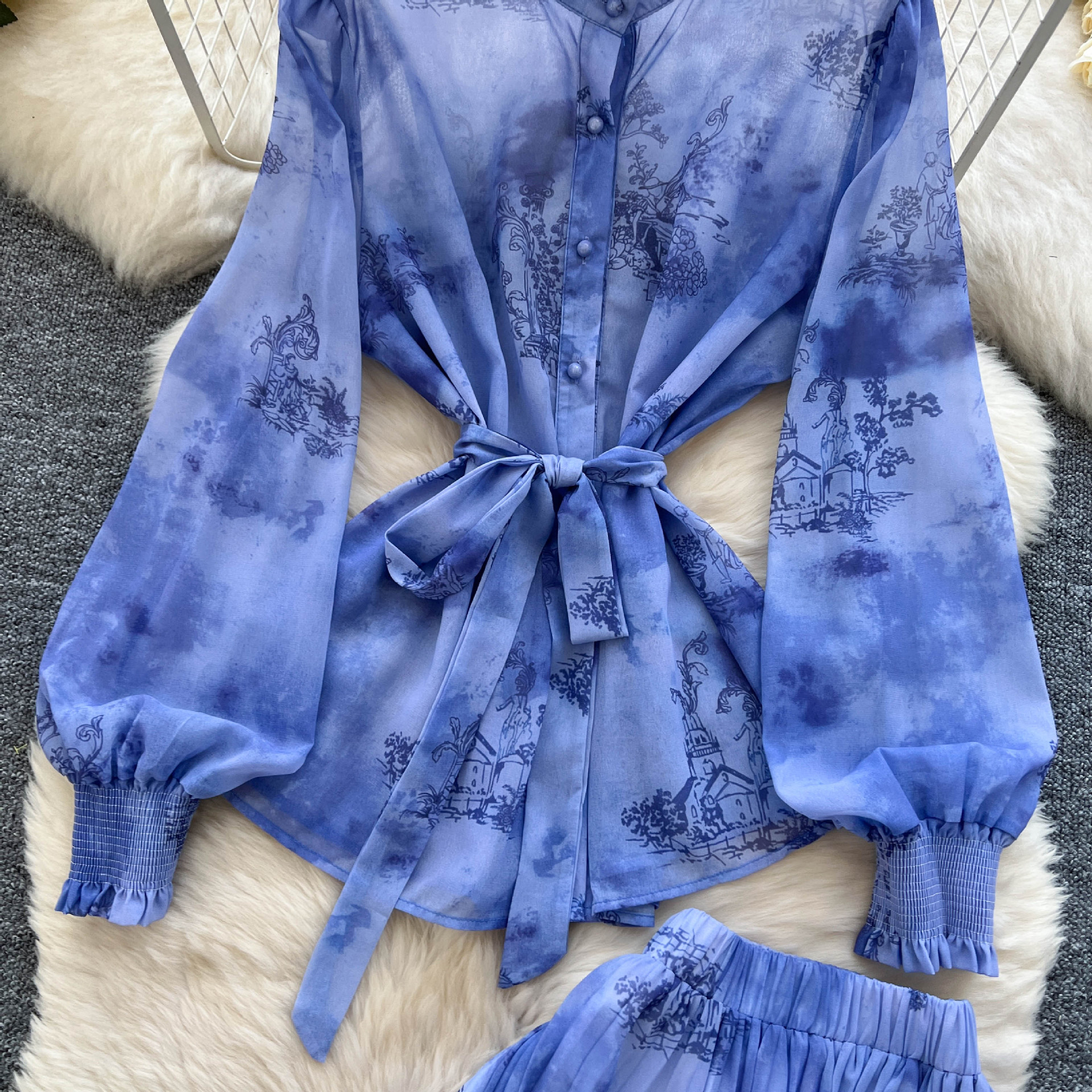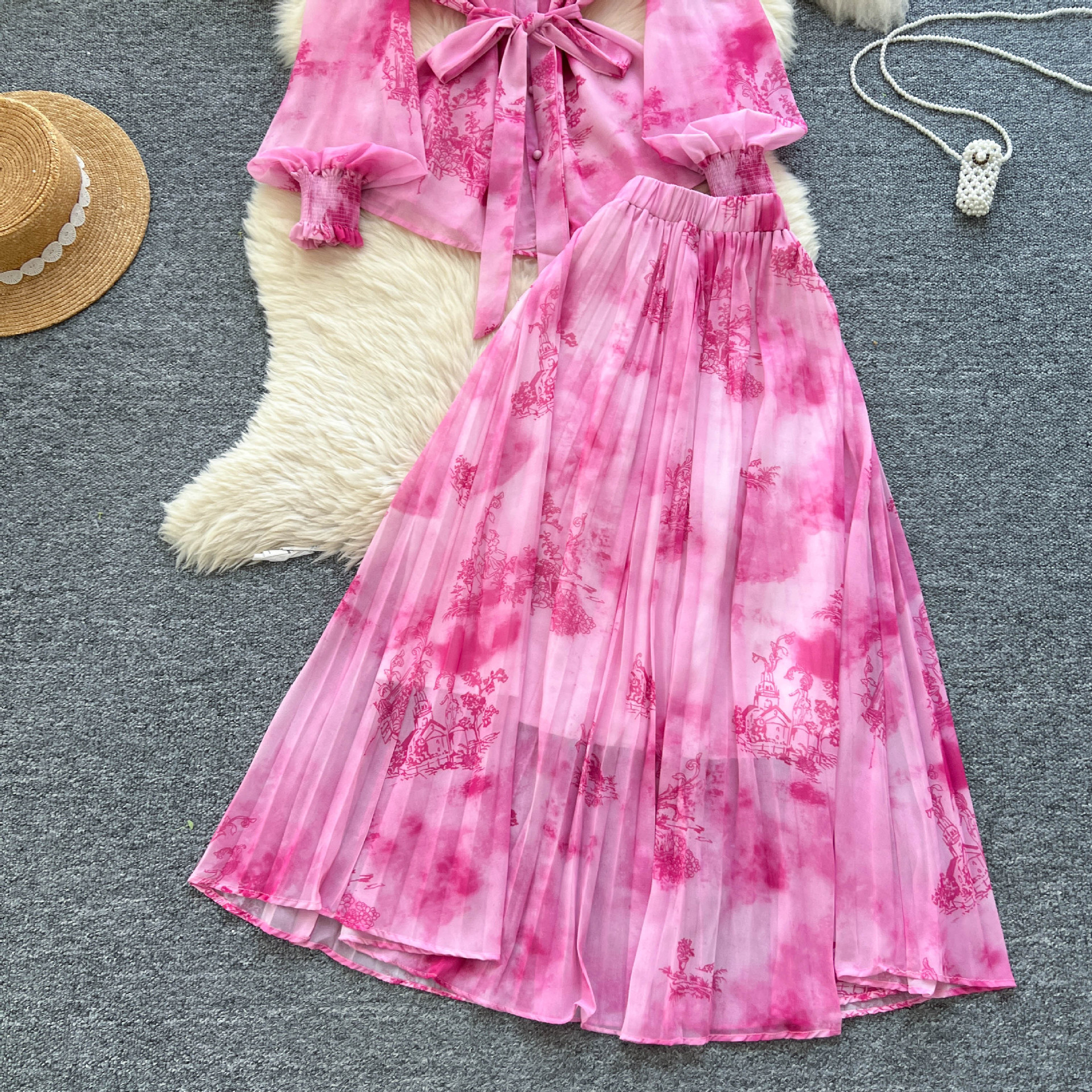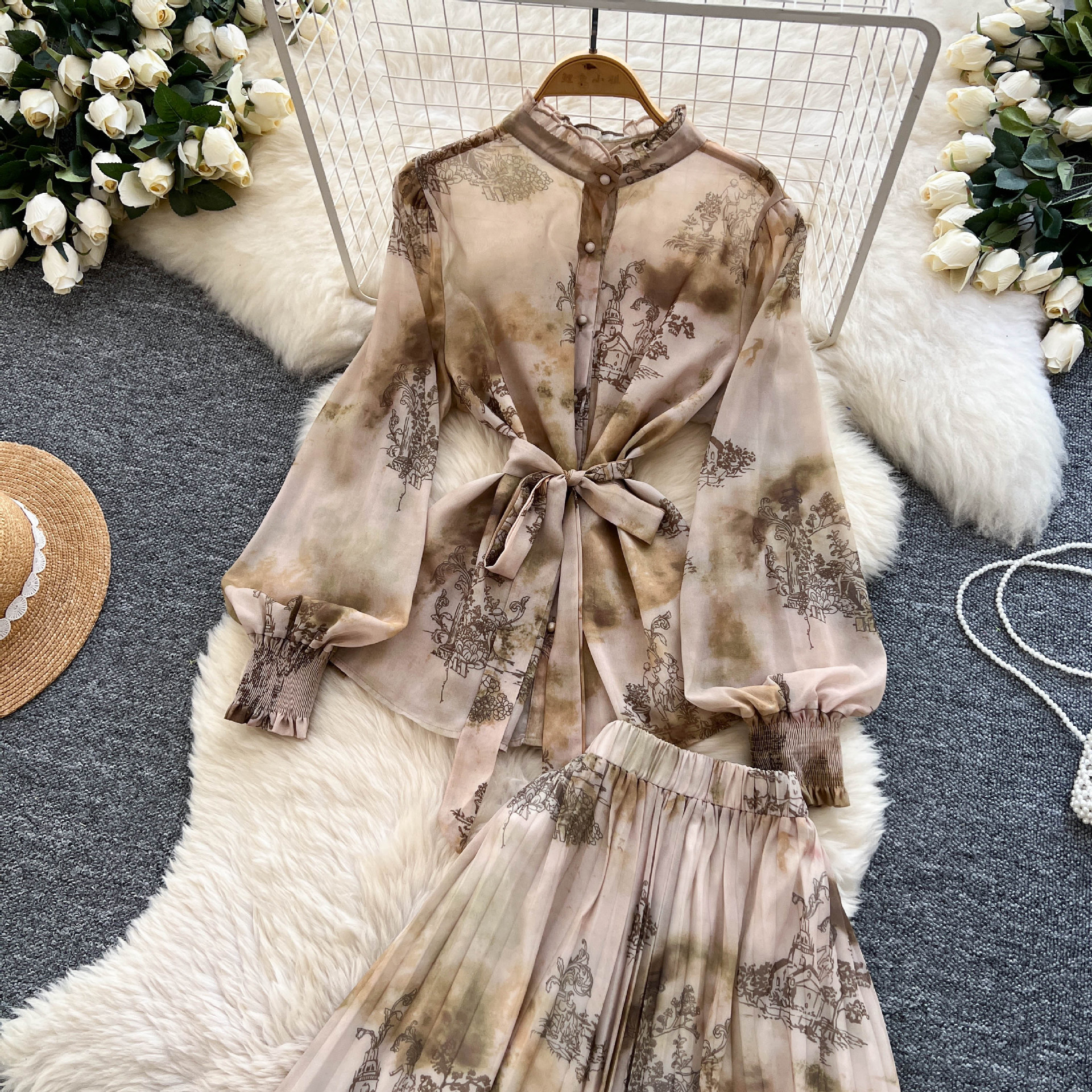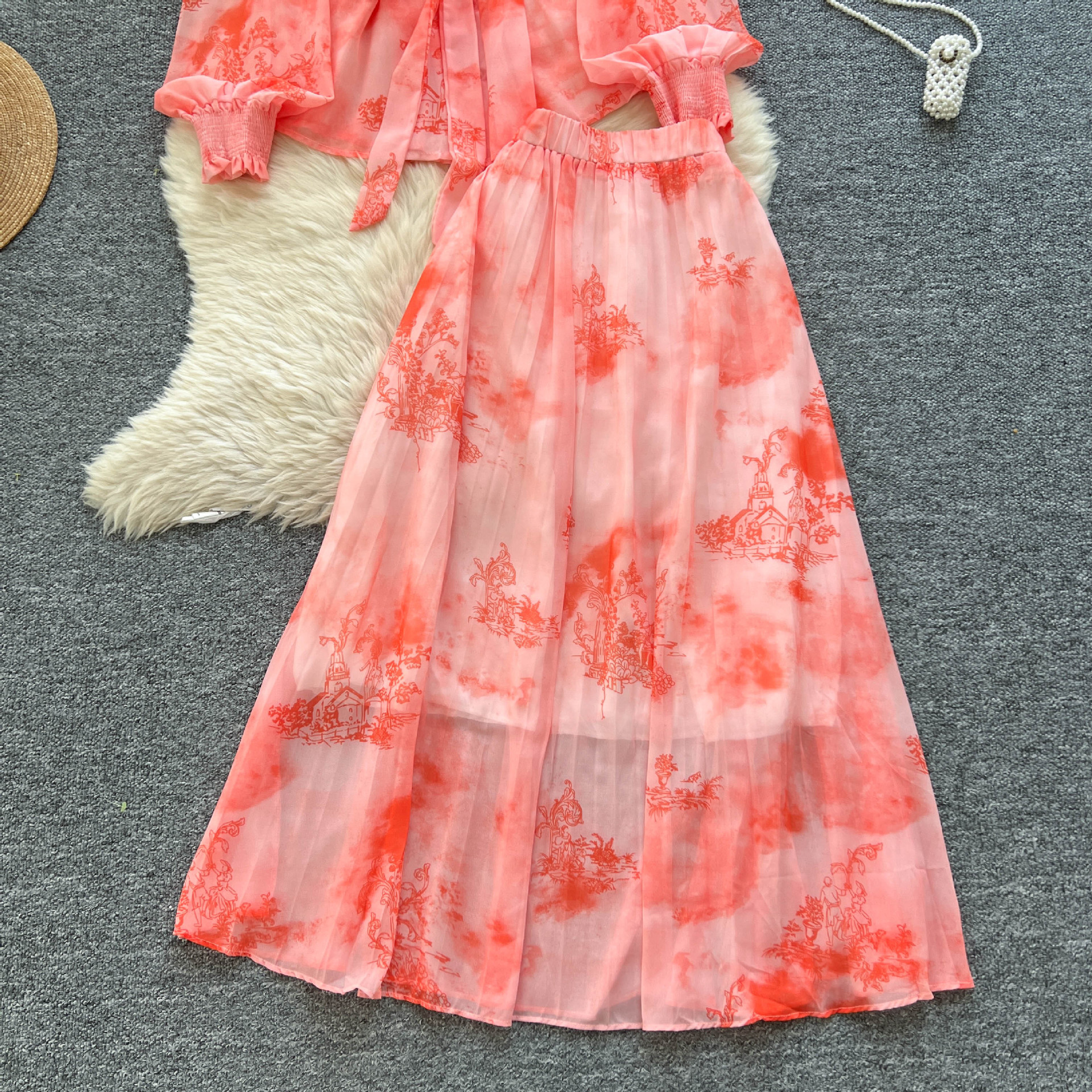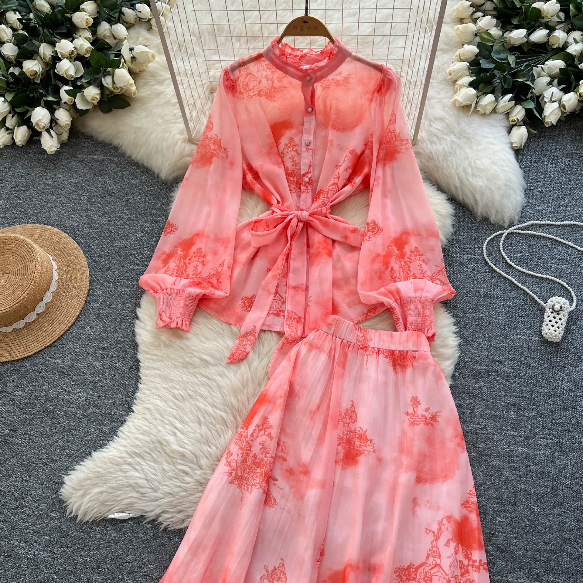 우아한 투피스 여성 프랑스 스타일 하이 엔드 스트랩 허리 랜턴 슬리브 프린트 쉬폰 탑 하이 허리 스커트