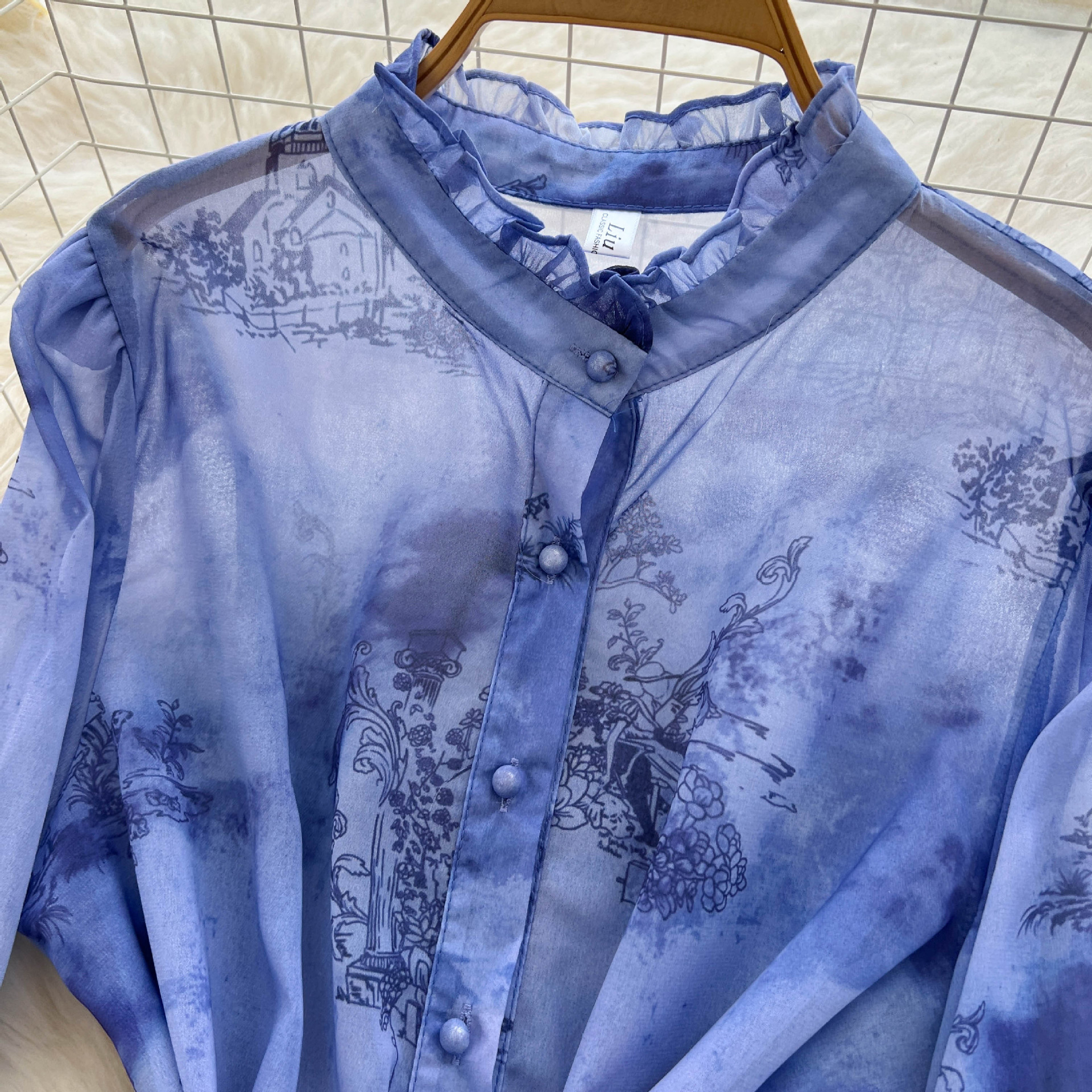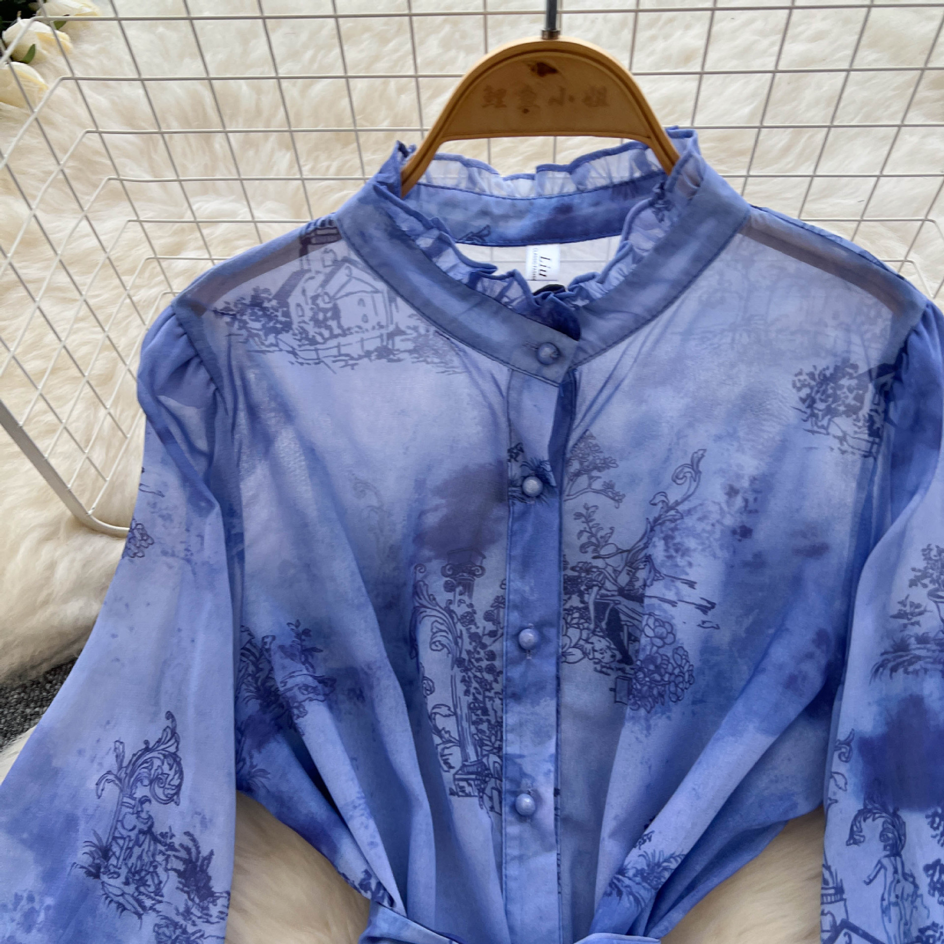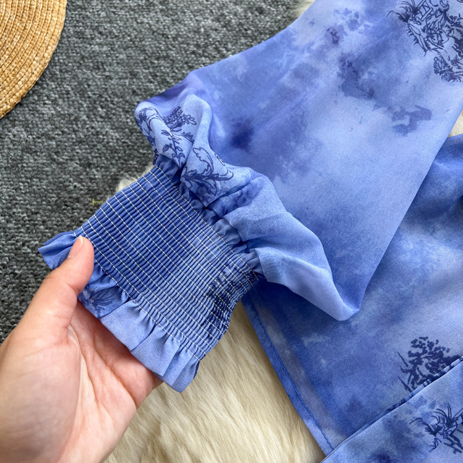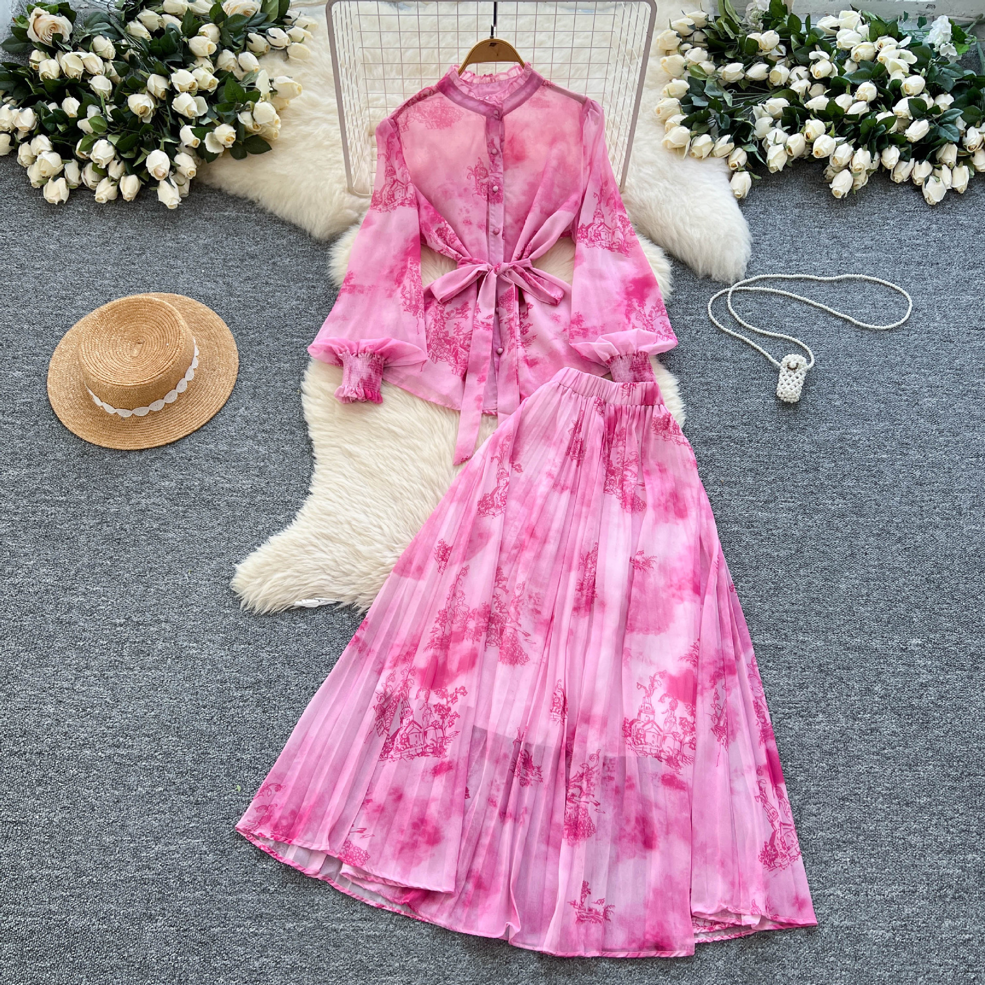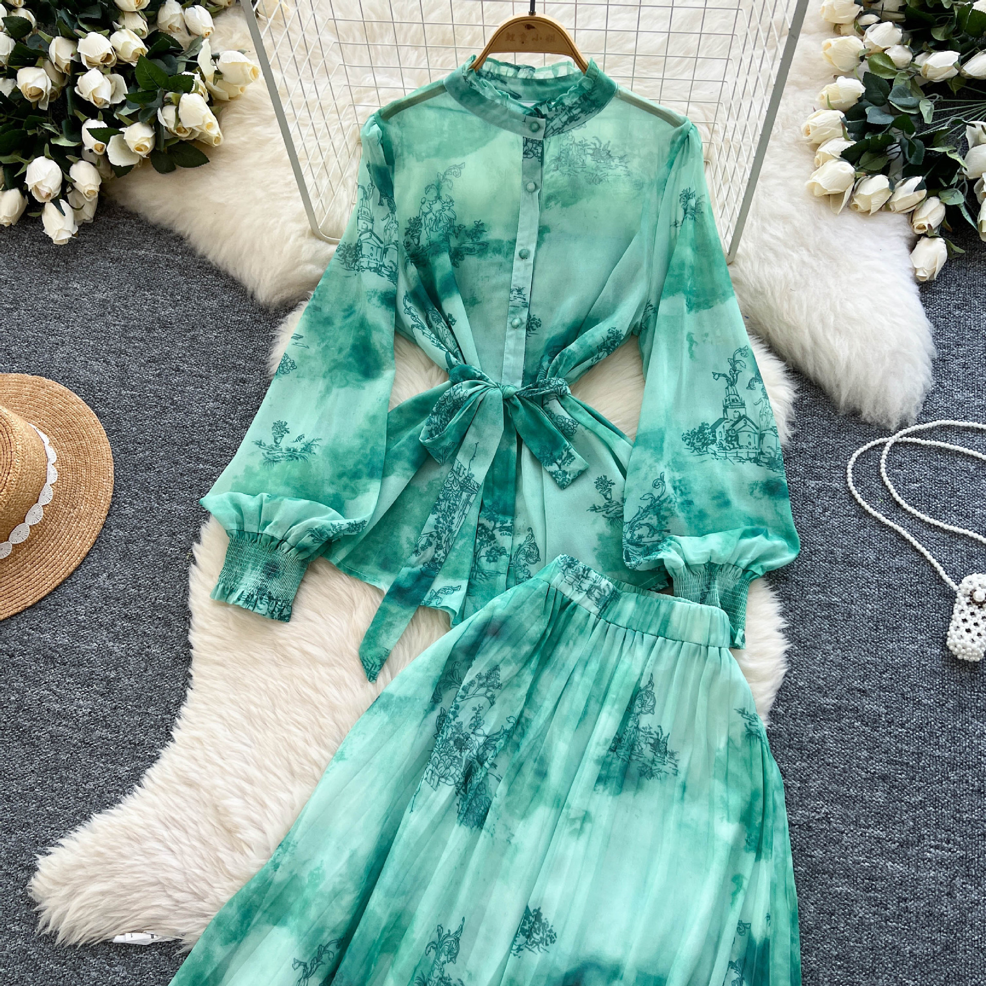우아한 투피스 여성 프랑스 스타일 하이 엔드 스트랩 허리 랜턴 슬리브 프린트 쉬폰 탑 하이 허리 스커트