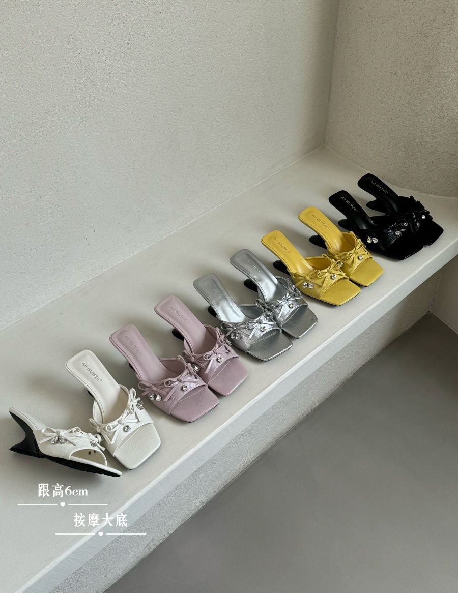 2025년 여름 신작 라인스톤 오픈토 보우 프렌치 스퀘어 토 여성용 미드힐 샌들