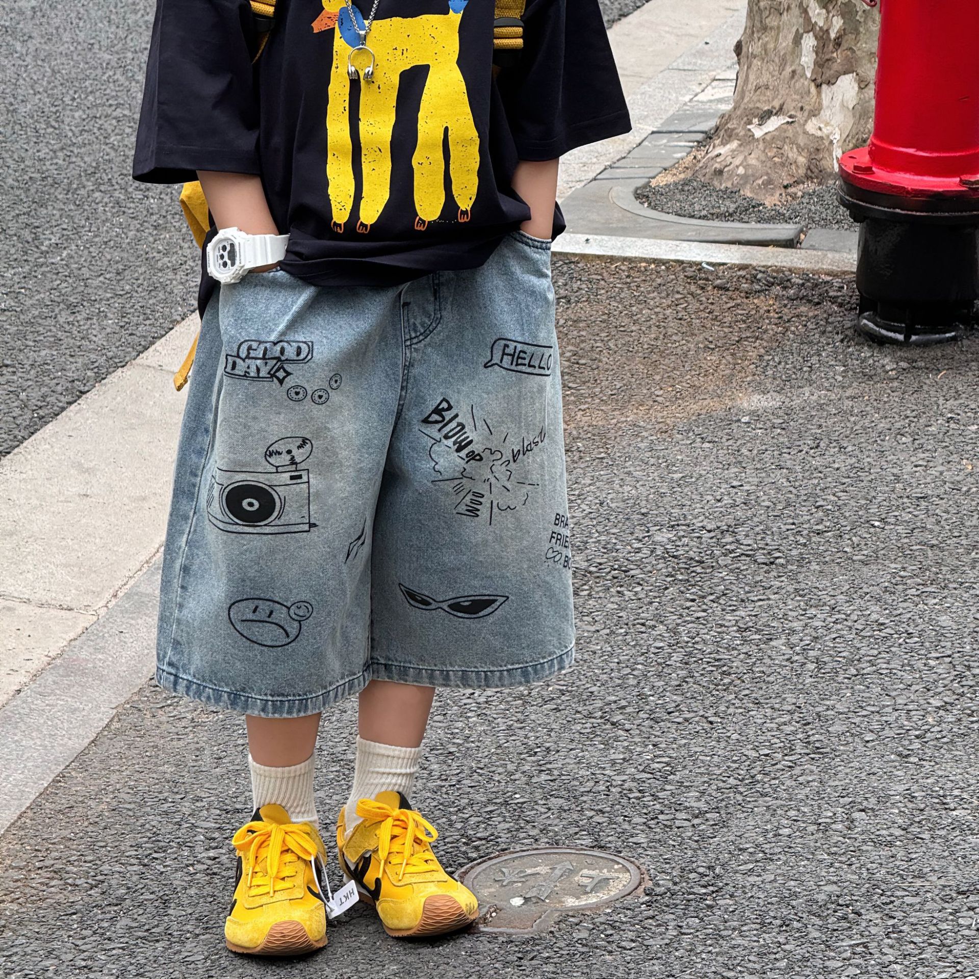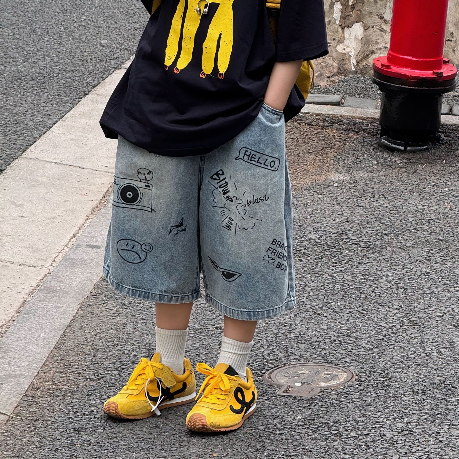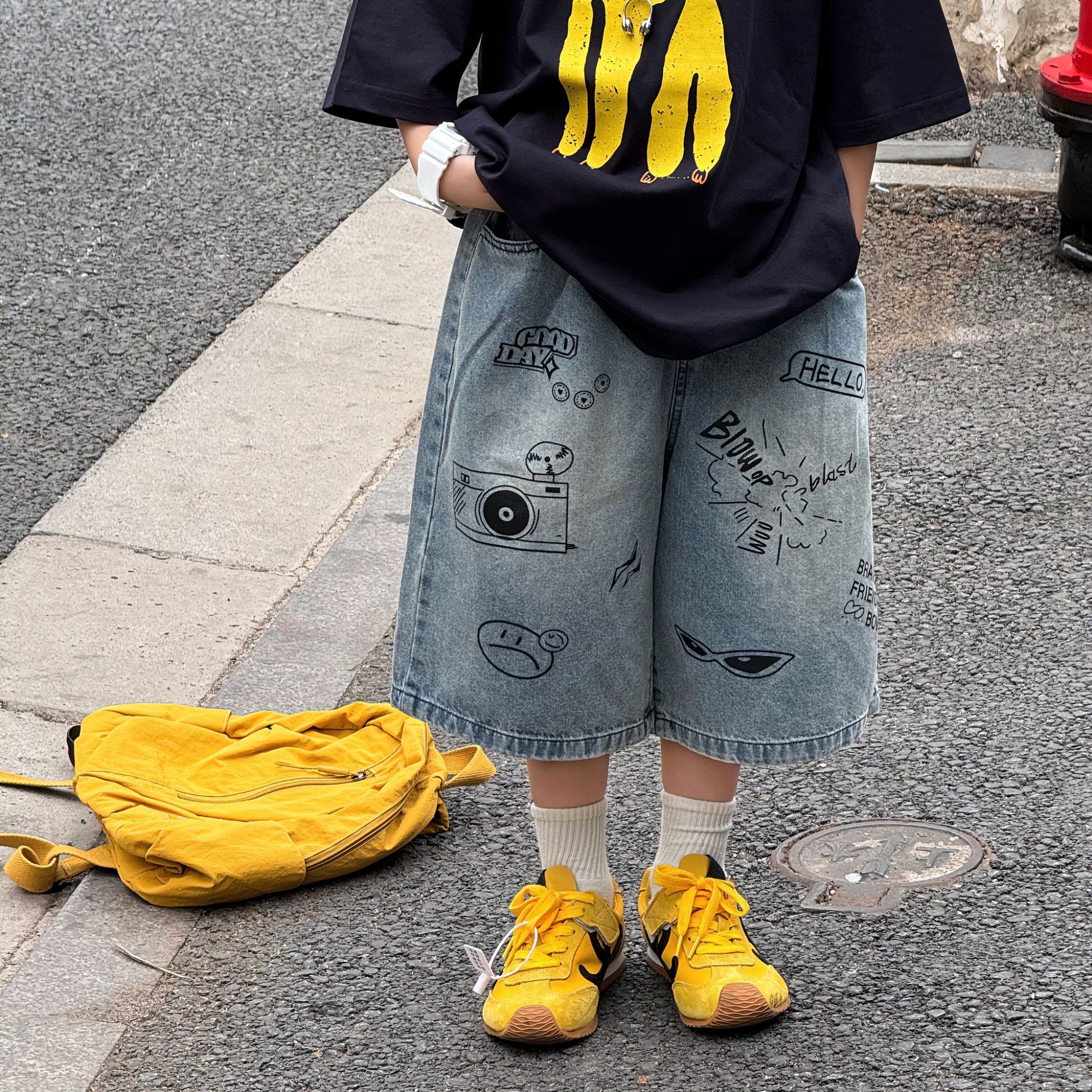 Tailu 2025 여름 새로운 도착 한국 스타일 소년 유행 올 매치 낙서 만화 청바지 어린이를위한 트렌디 한 반바지스토어 가기