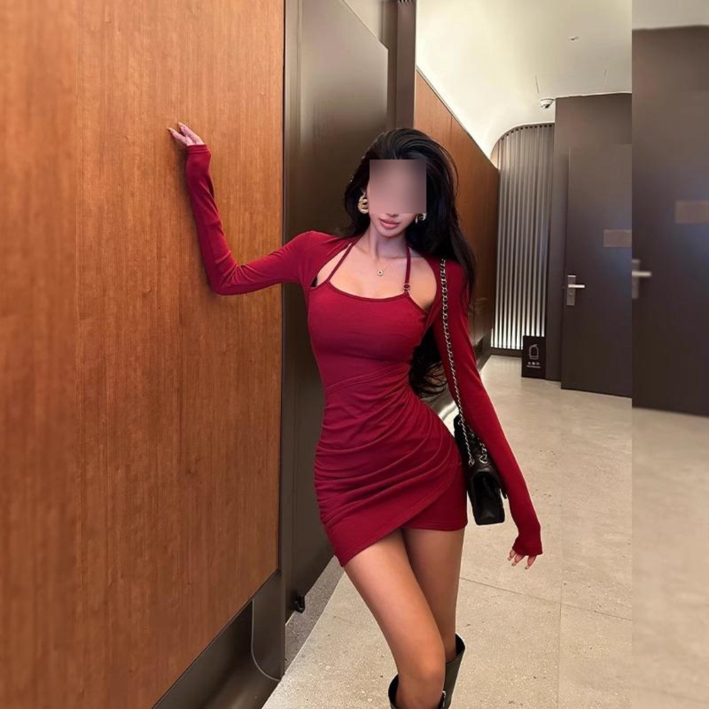 欧美复古长袖挂脖连衣裙女早秋新款包臀裙时尚紧身高级红色短裙子스토어 가기