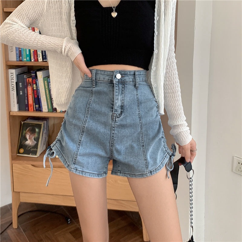 스트랩 데님 반바지 여성용 얇은 여름 Ins 슬림 핏 한국식 하이 웨이스트 스트레이트 스트레치 올 매치 와이드 레그 A 라인 핫 팬츠스토어 가기
