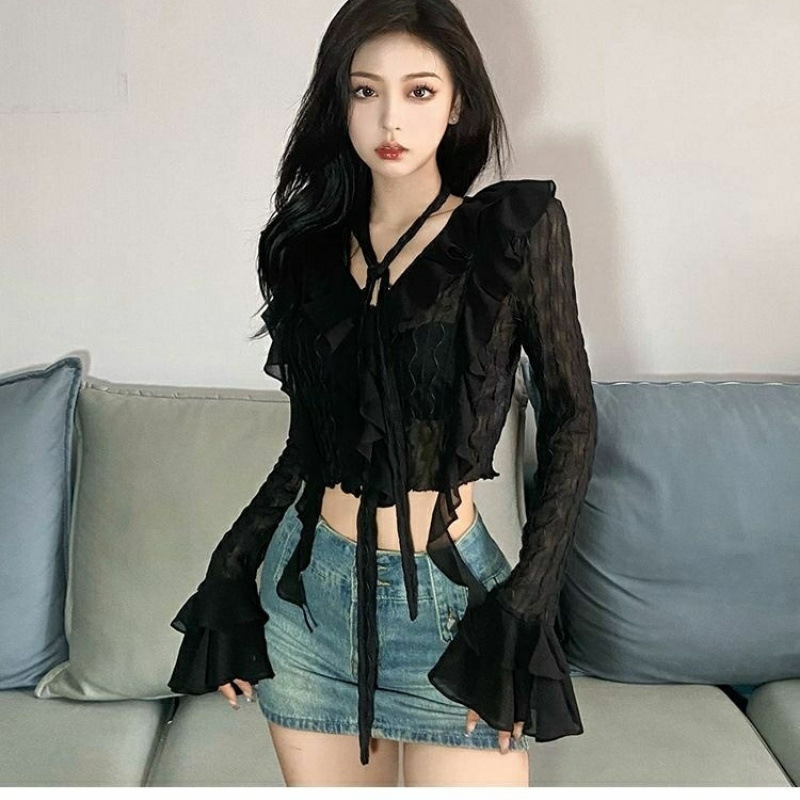 春夏季黑色修身v领网纱微透露脐长袖荷叶边短款喇叭袖衬衫上衣女