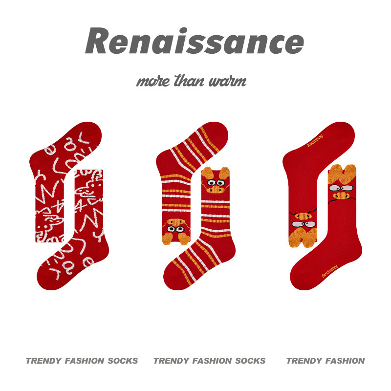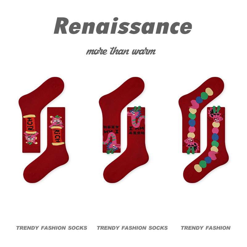 3 쌍-르네상스 오리지널 드래곤 레드 중간 튜브 양말 도매 새로운 트렌드 만화 뼈없는 여성 양말 레드 양말 여성스토어 가기