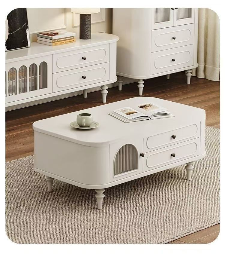프랑스 스타일 TV 캐비닛 고급 커피 테이블 조합 세트 크림 북유럽 스타일 거실 가정용 단단한 나무 바닥 복고풍 높은 캐비닛스토어 가기