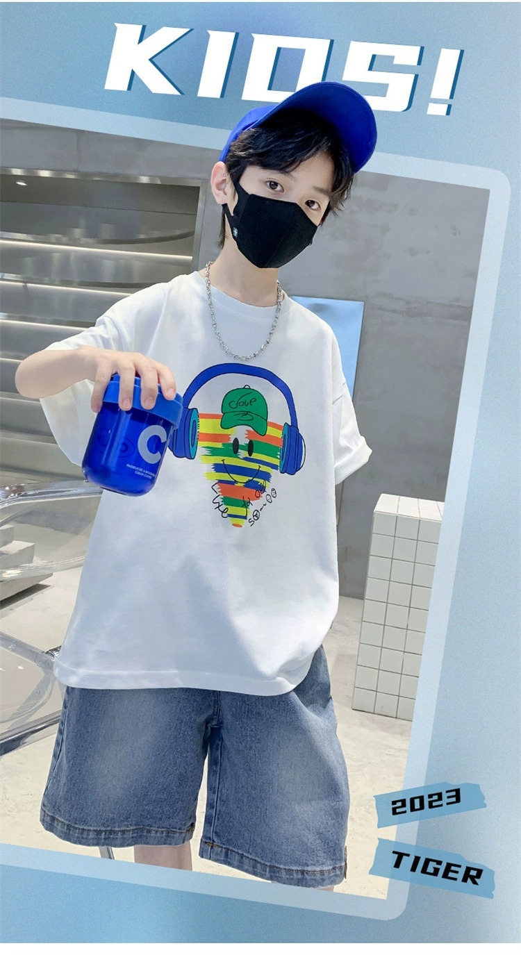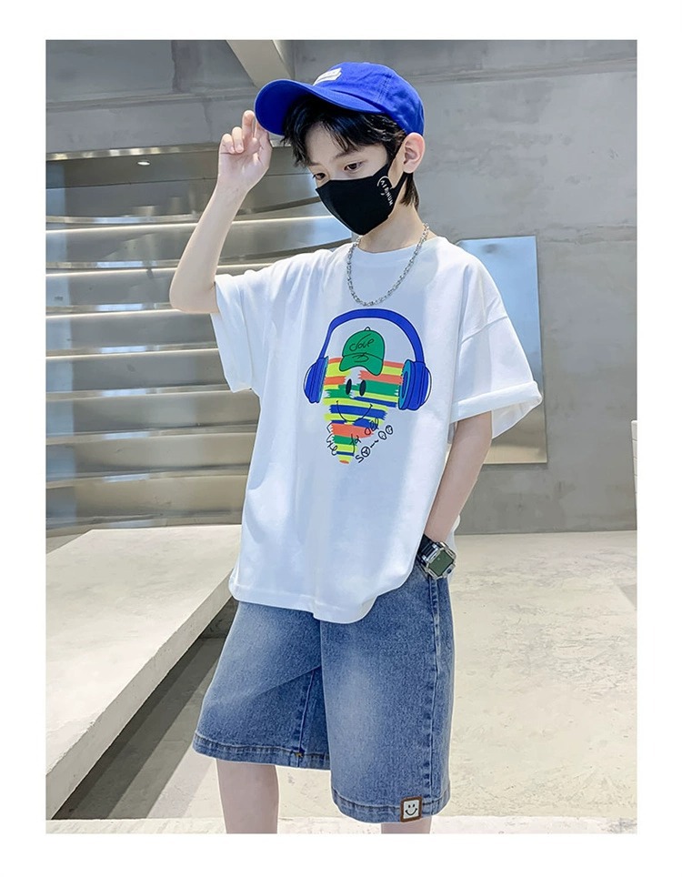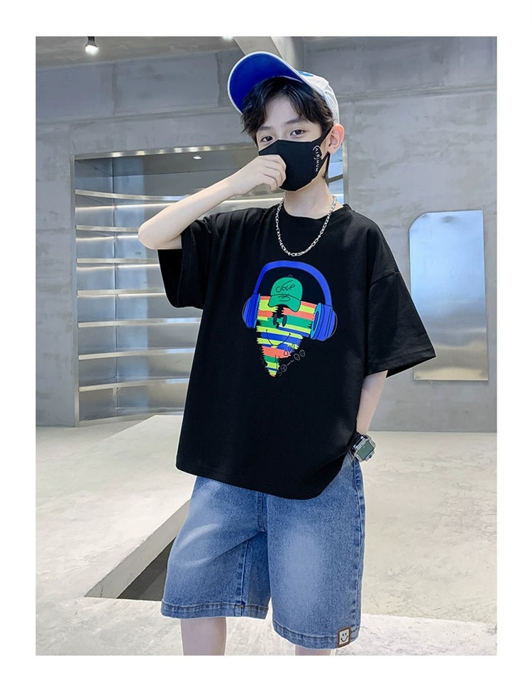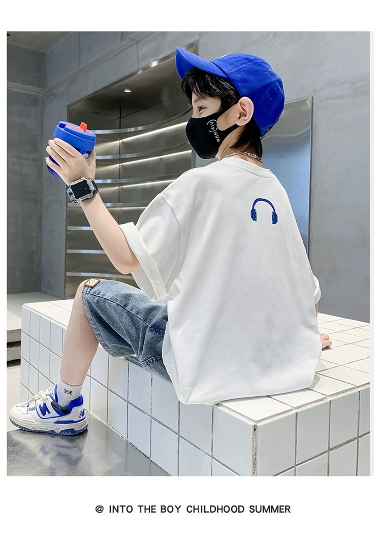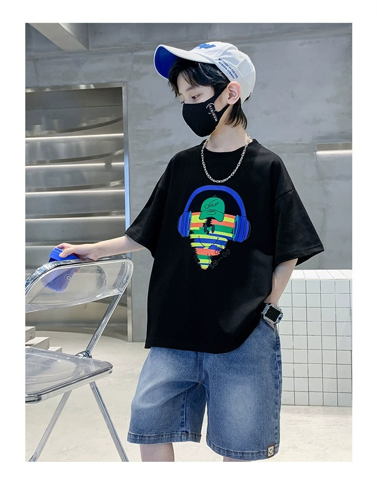 남학생 반소매 티셔츠 여름 2024 년 새 중대형 어린이 튀긴 거리 반소매 느슨한 서양식 어린이 여름 패션스토어 가기