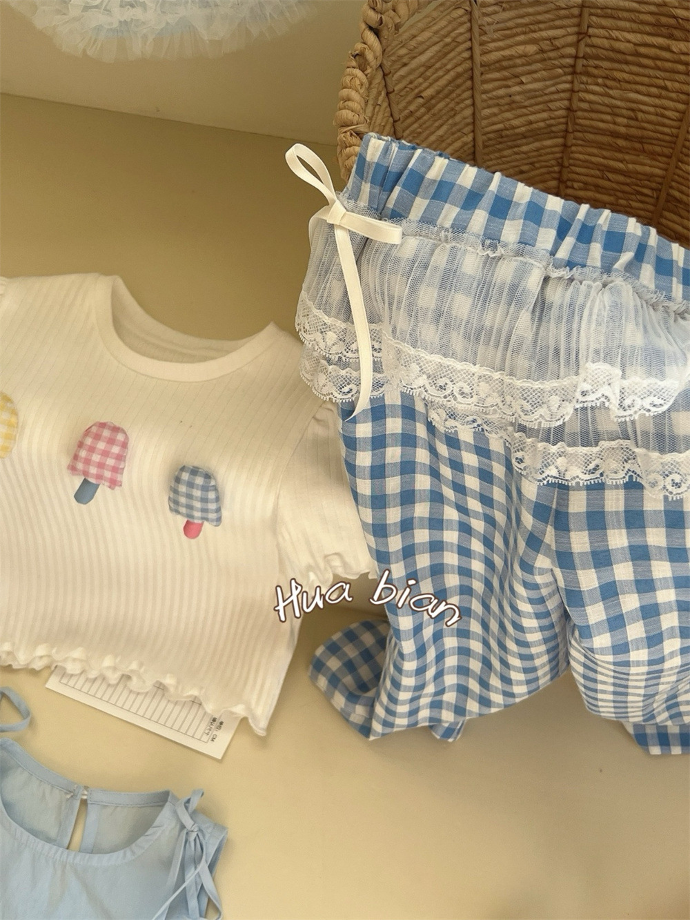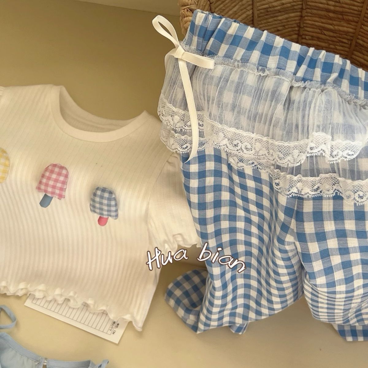 라임 아동복 2025 여름 새 여아 유아용 아이스크림 슬림 티셔츠 면 레이스 프리리스 바지스토어 가기