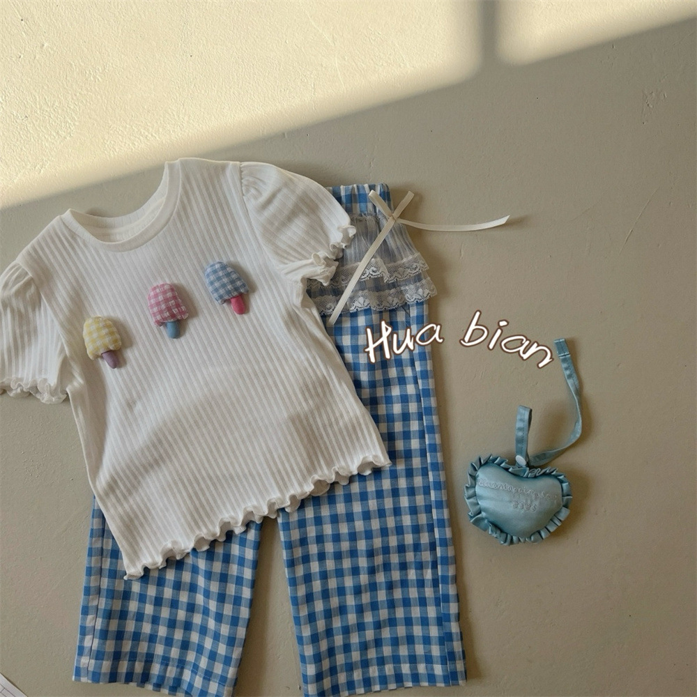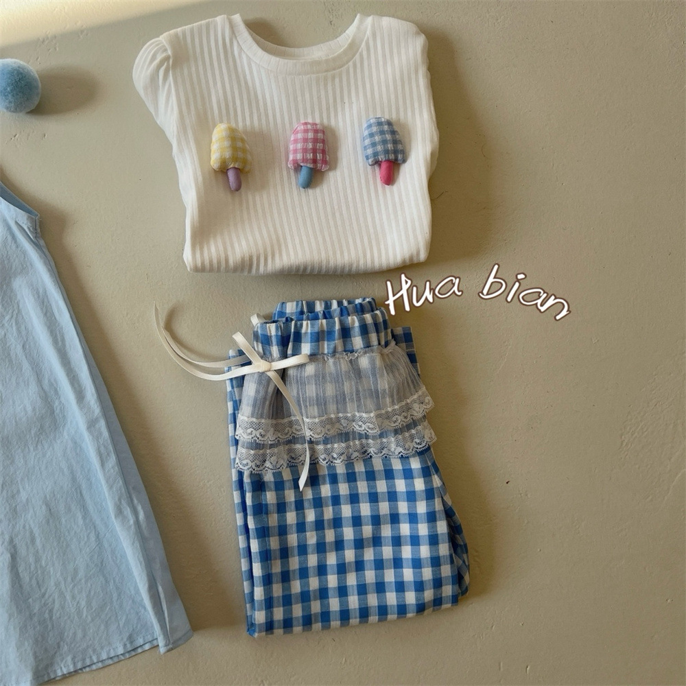 라임 아동복 2025 여름 새 여아 유아용 아이스크림 슬림 티셔츠 면 레이스 프리리스 바지