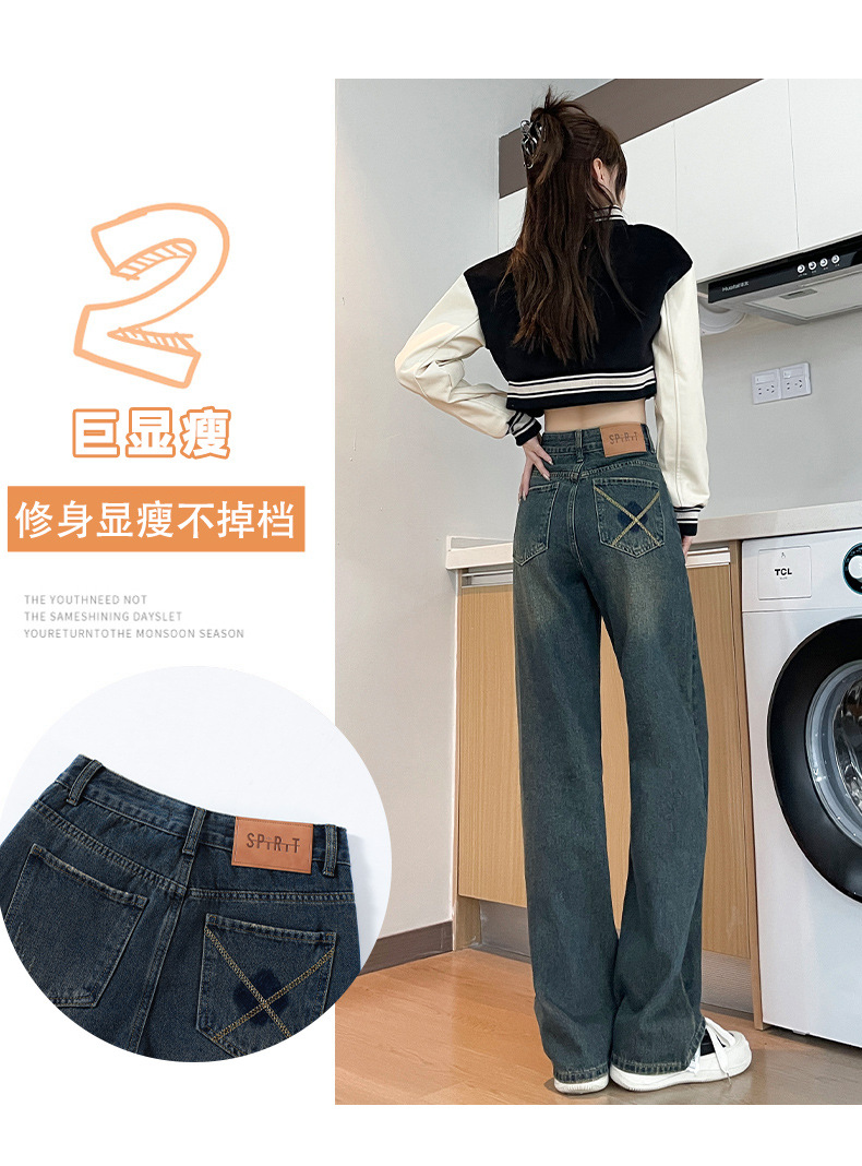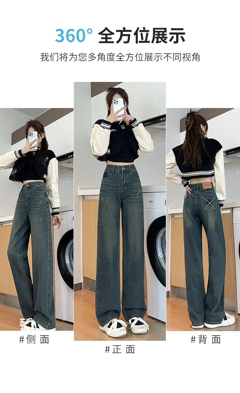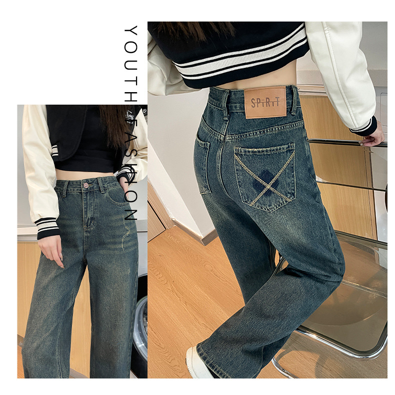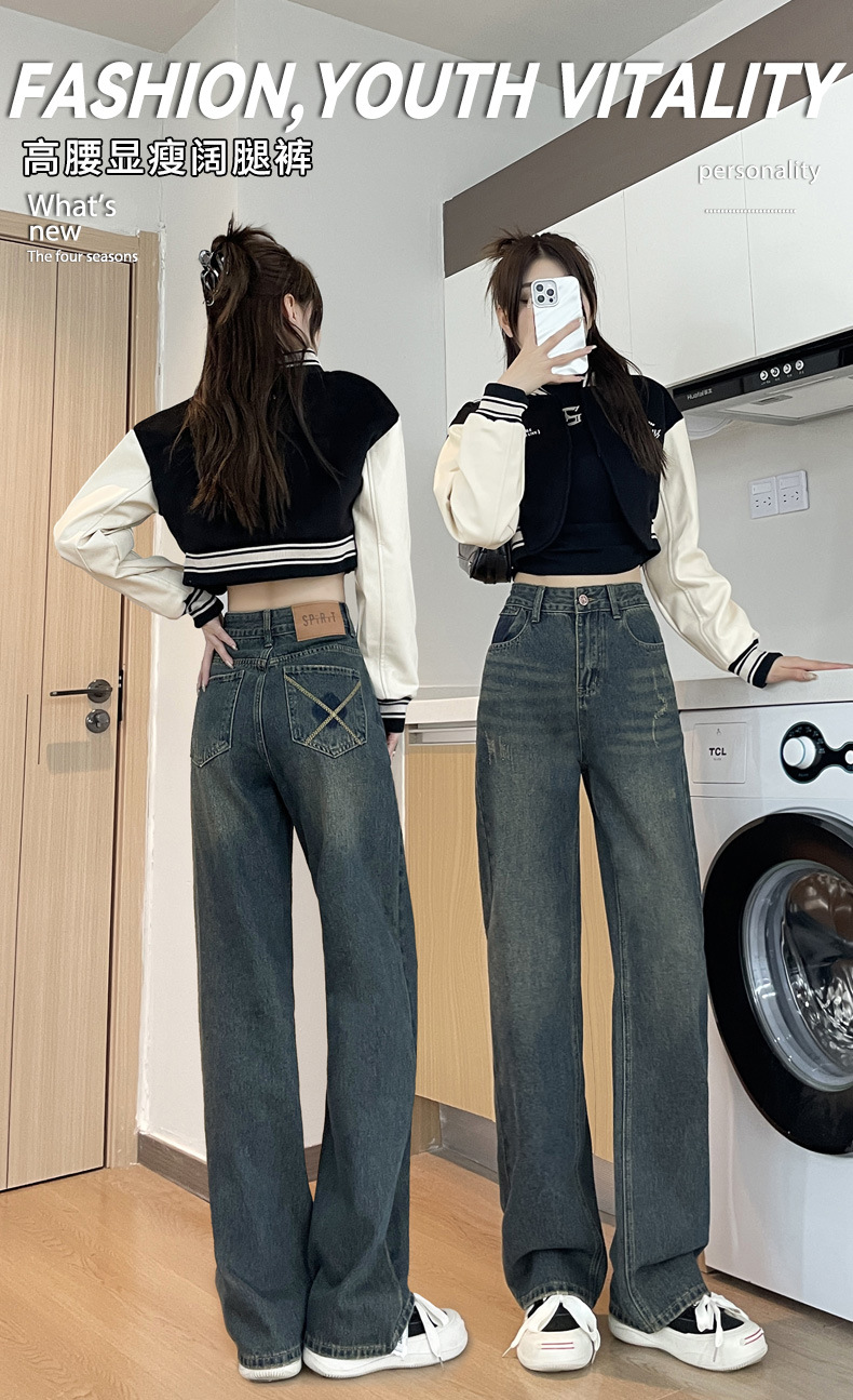 1516 여성용 와이드 레그 청바지 하이 웨이스트 가을 봄 백 포켓 크로스 자수 대비 컬러 와이드 레그 바닥 길이 바지