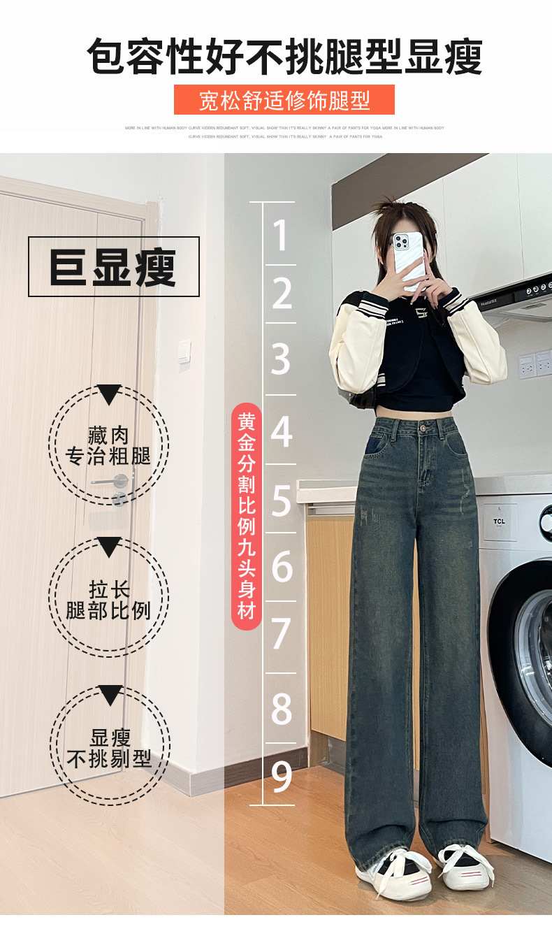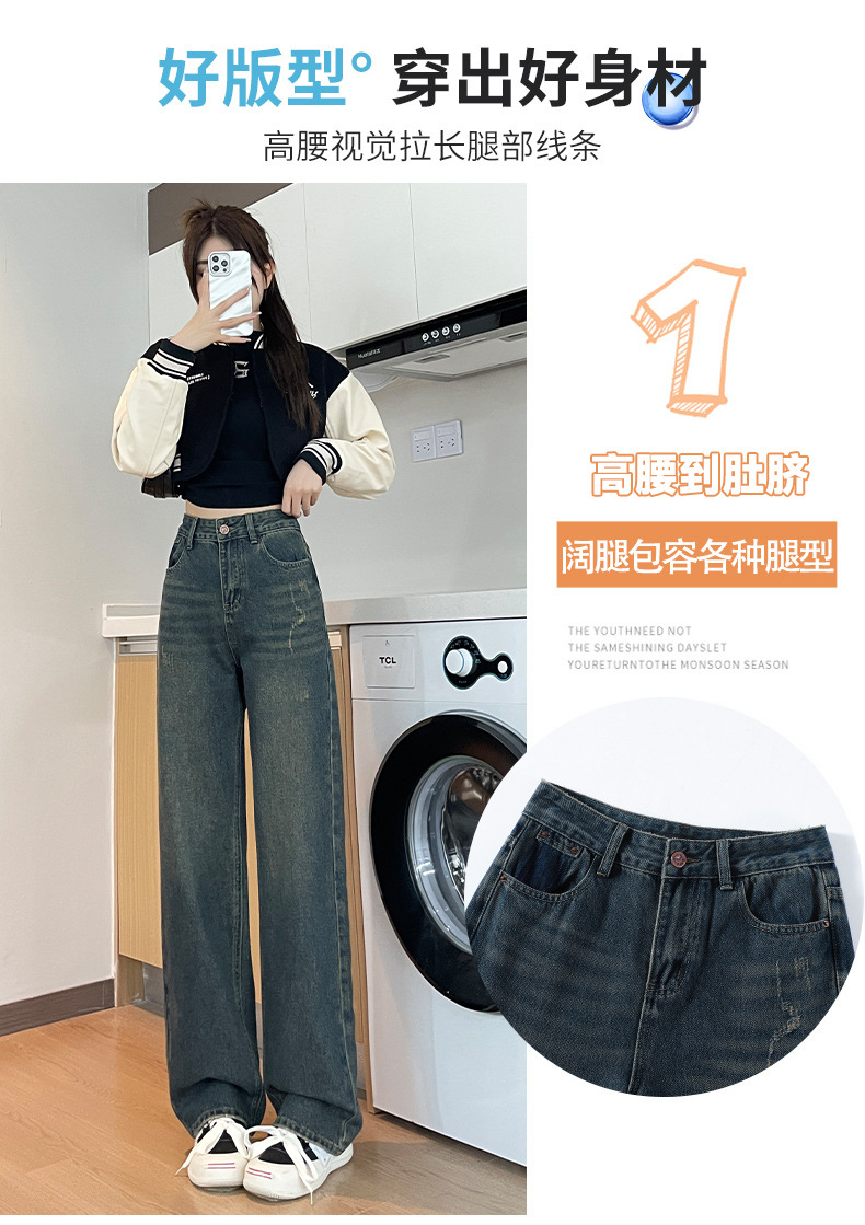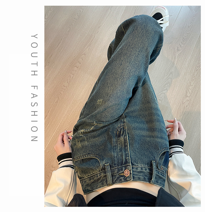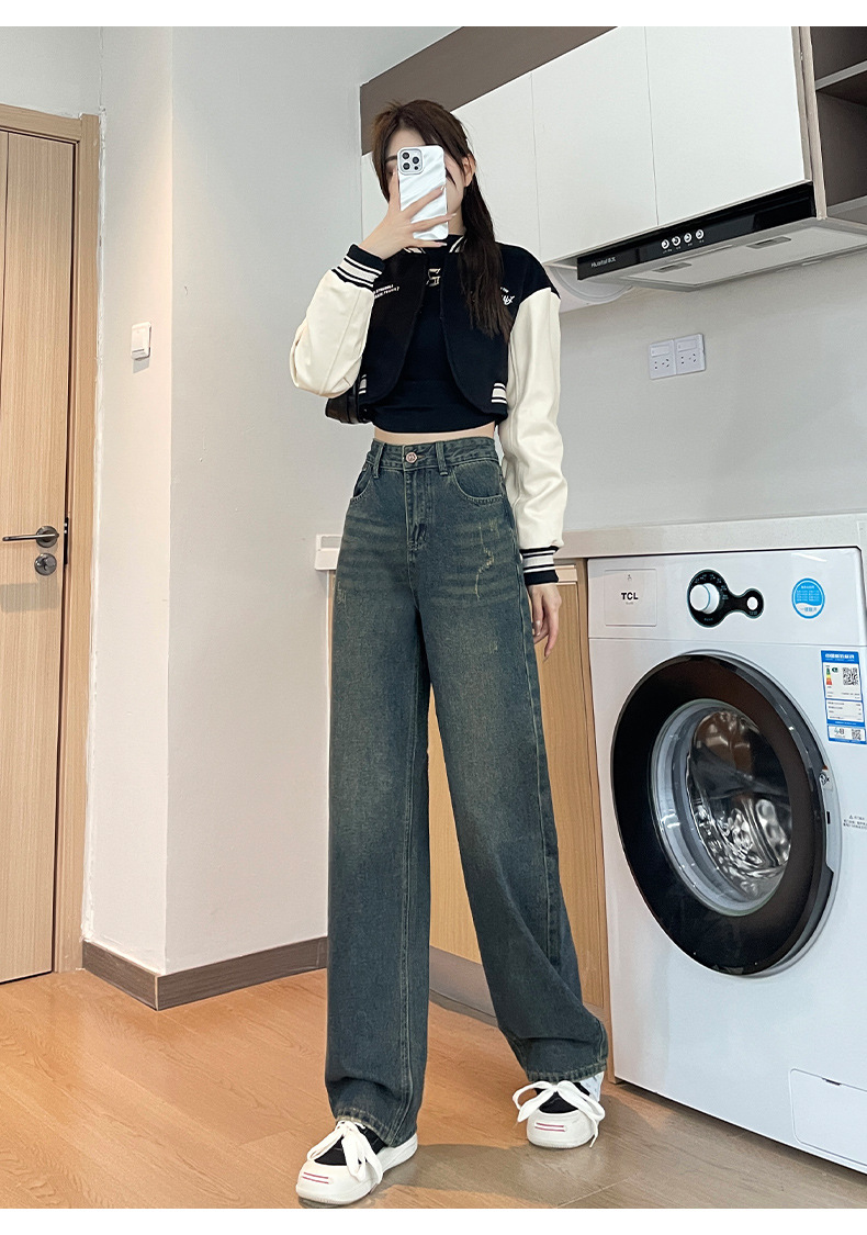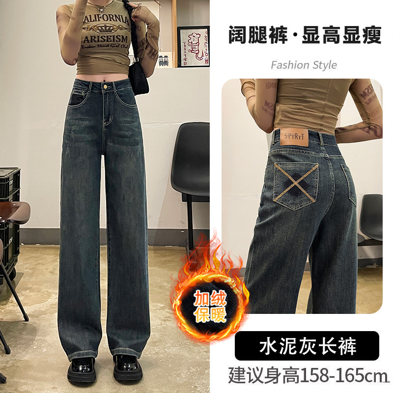 1516 여성용 와이드 레그 청바지 하이 웨이스트 가을 봄 백 포켓 크로스 자수 대비 컬러 와이드 레그 바닥 길이 바지