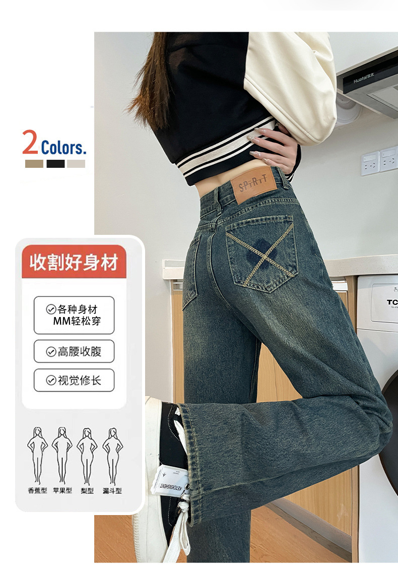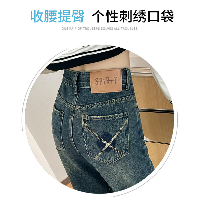 1516 여성용 와이드 레그 청바지 하이 웨이스트 가을 봄 백 포켓 크로스 자수 대비 컬러 와이드 레그 바닥 길이 바지스토어 가기
