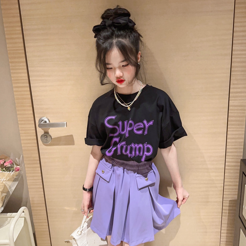 여아용 스커트, 반팔 여름옷, 중대형 아동복, 패셔너블한 플리츠 스커트, 컬리지 스타일, 서양식 여름 티셔츠 투피스 세트
