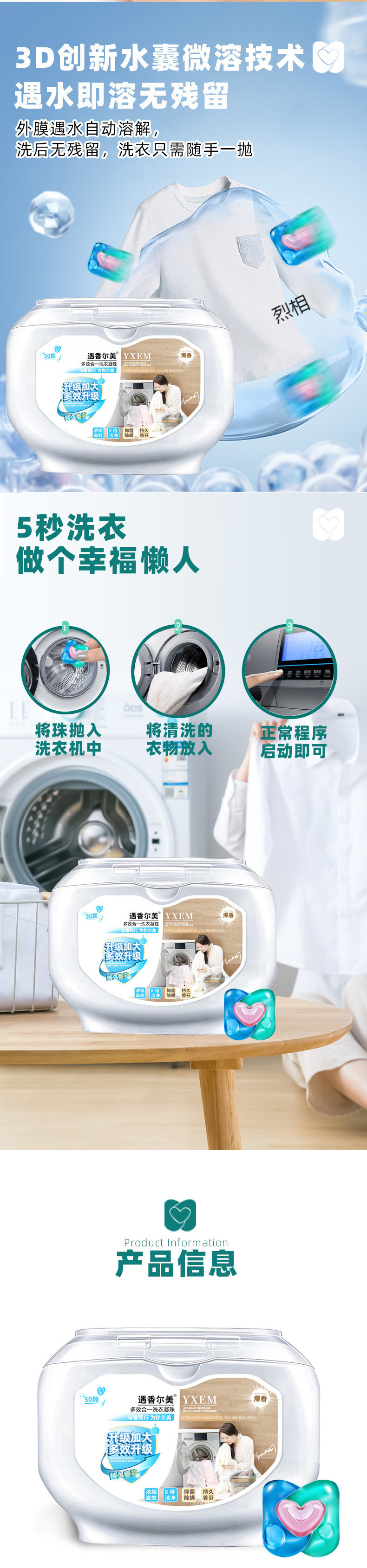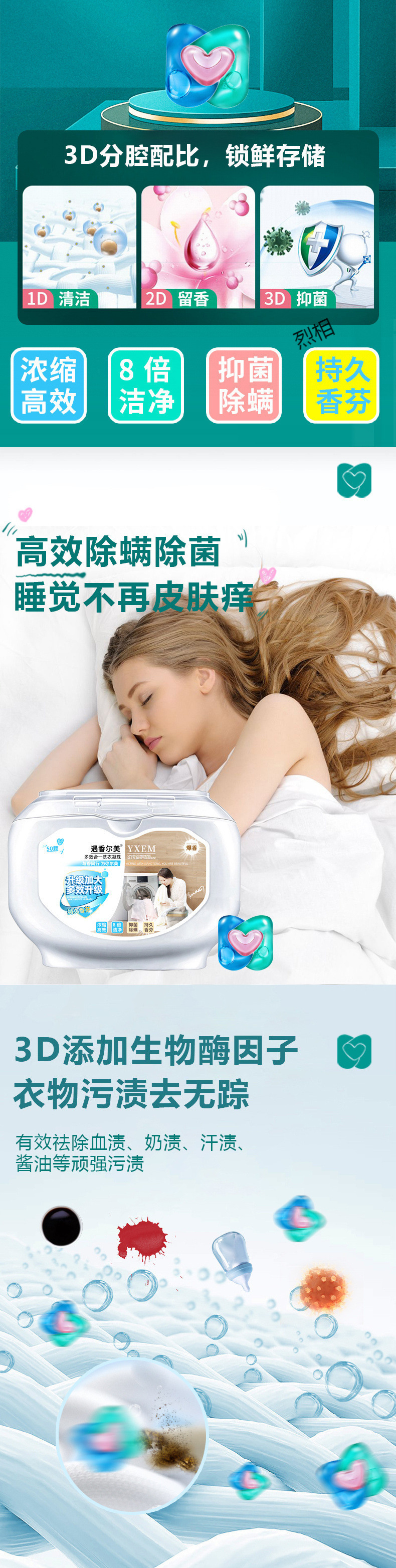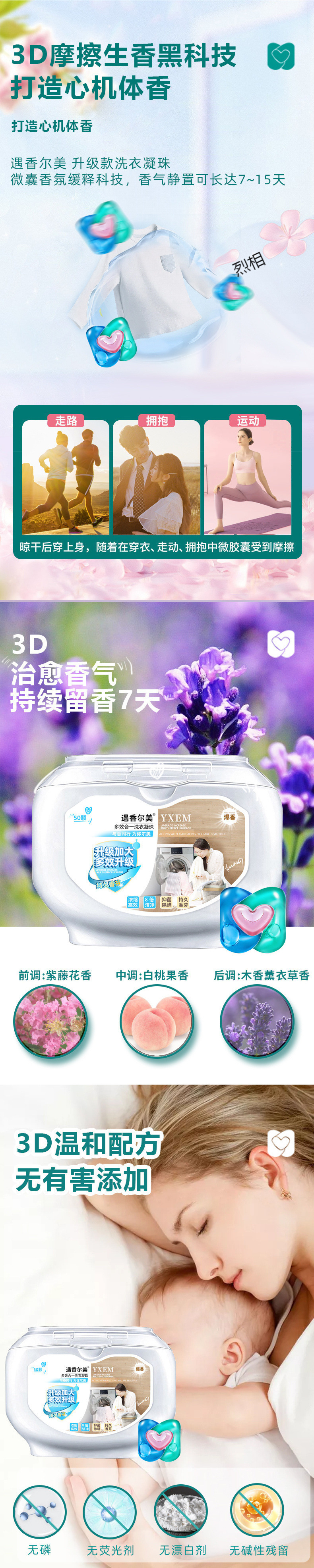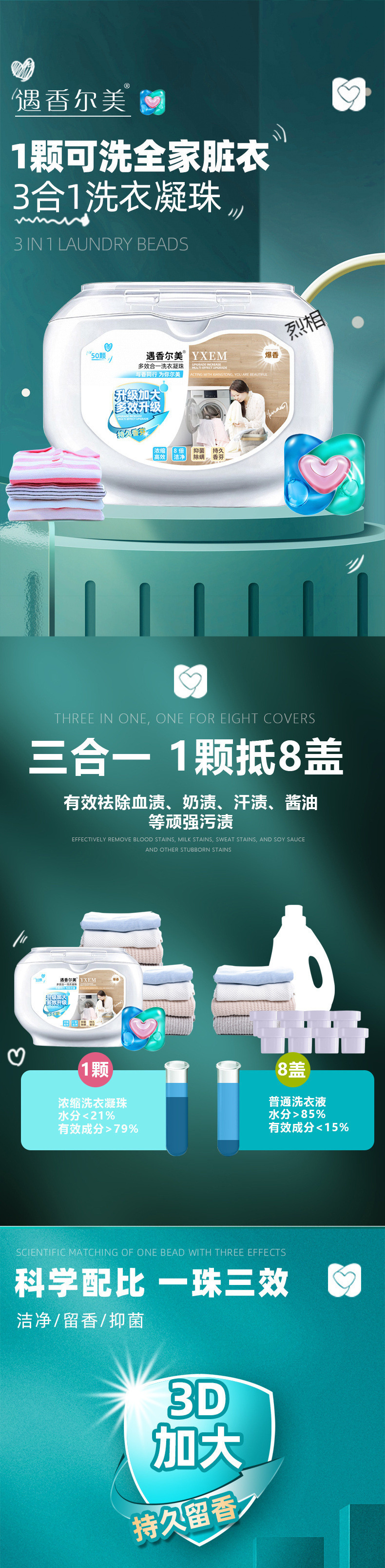 3D 3-in-1 세탁 비즈, 향기 비즈, 고농축 강력 얼룩 청소, 초향기