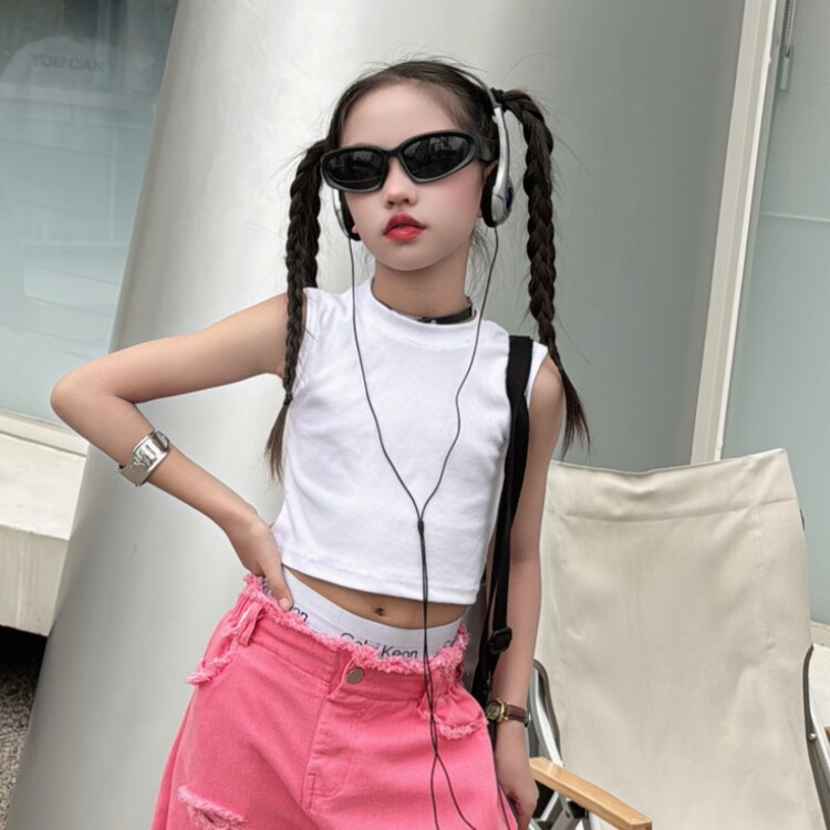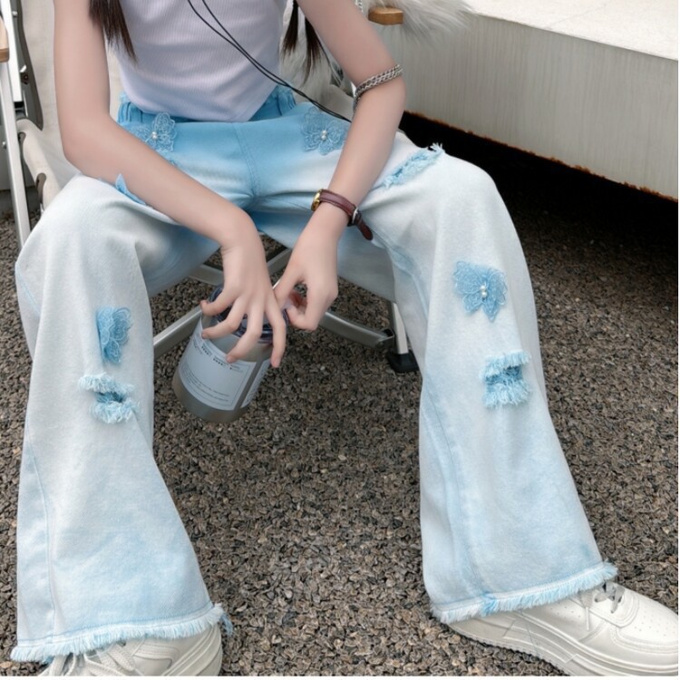 큰 어린이를위한 그라디언트 컬러 여름 투피스 세트 2024 조끼 소녀 청바지 새로운 와이드 레그 팬츠 찢어진 미국 스타일스토어 가기
