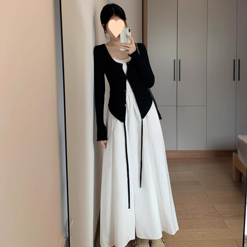 초가을 신상 화이트 서스펜더 드레스 여성 하이엔드 불규칙 니트 가디건 롱 스커트 투피스 세트