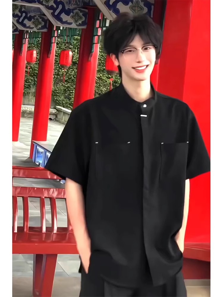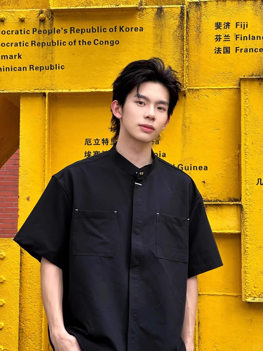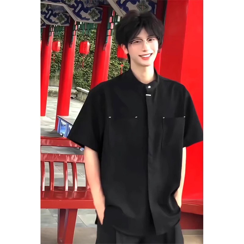 새로운 중국 스타일 수직 칼라 반팔 셔츠 남자의 여름 면허 약혼 착용 국가 스타일 숨겨진 버클 작업복 반소매 셔츠