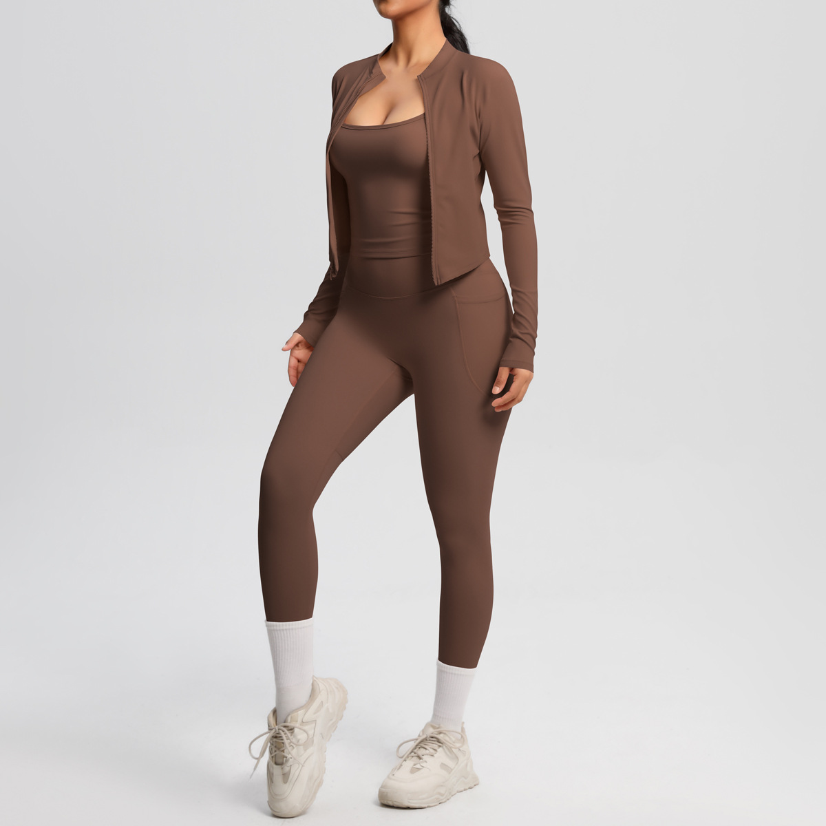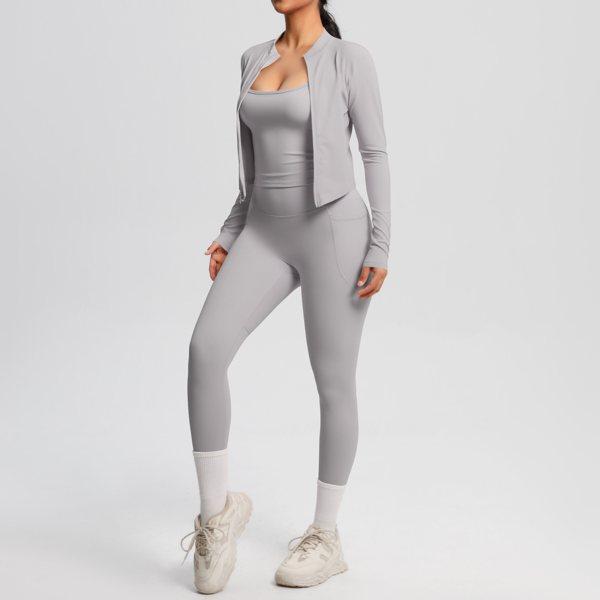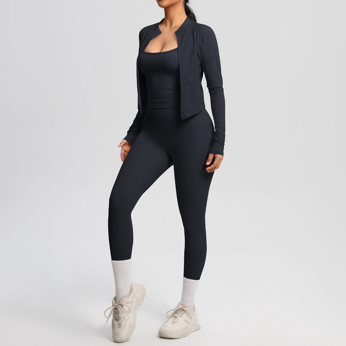 유럽과 미국의 단색 높은 허리 나이키드 카미 솔 스포츠 지퍼 긴 소매 재킷 포켓 요가 바지 피트니스 의류 세트