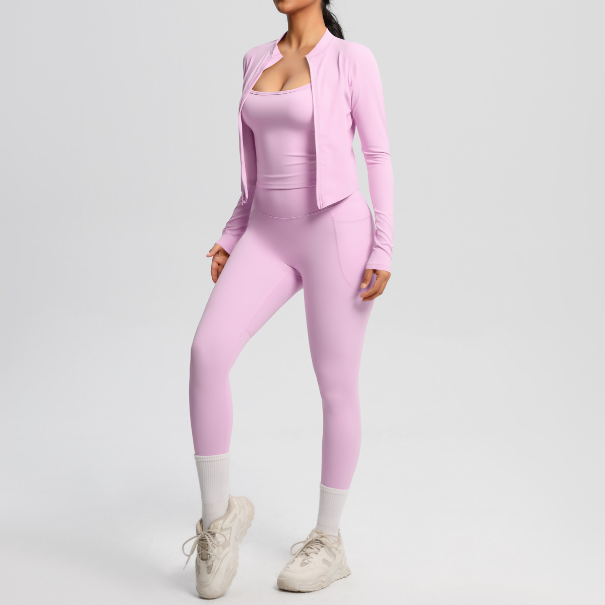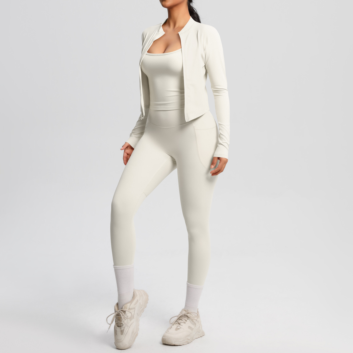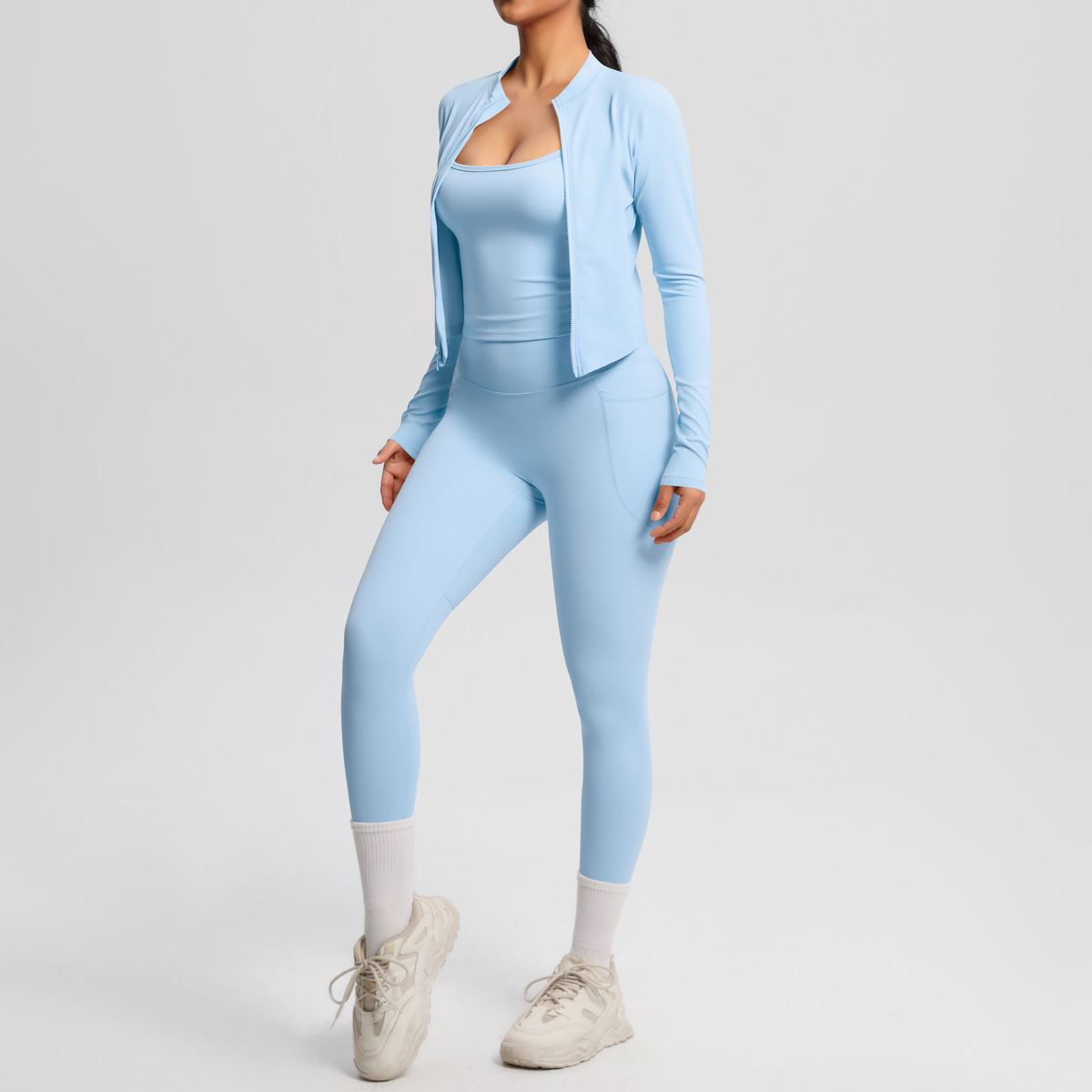 유럽과 미국의 단색 높은 허리 나이키드 카미 솔 스포츠 지퍼 긴 소매 재킷 포켓 요가 바지 피트니스 의류 세트
