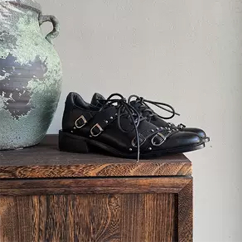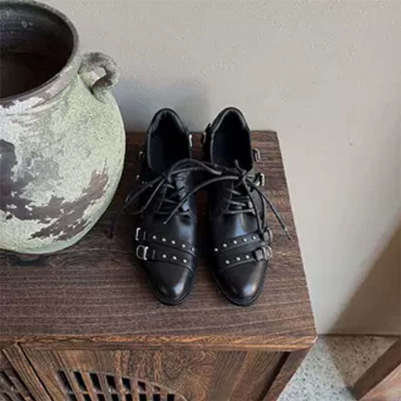 Cowhide Edition ~ 두꺼운 하단 빅 헤드 메탈 벨트 올 매치 로퍼 여성 영국 스타일 작은 높이 증가 레이스 업 작은 가죽 신발스토어 가기
