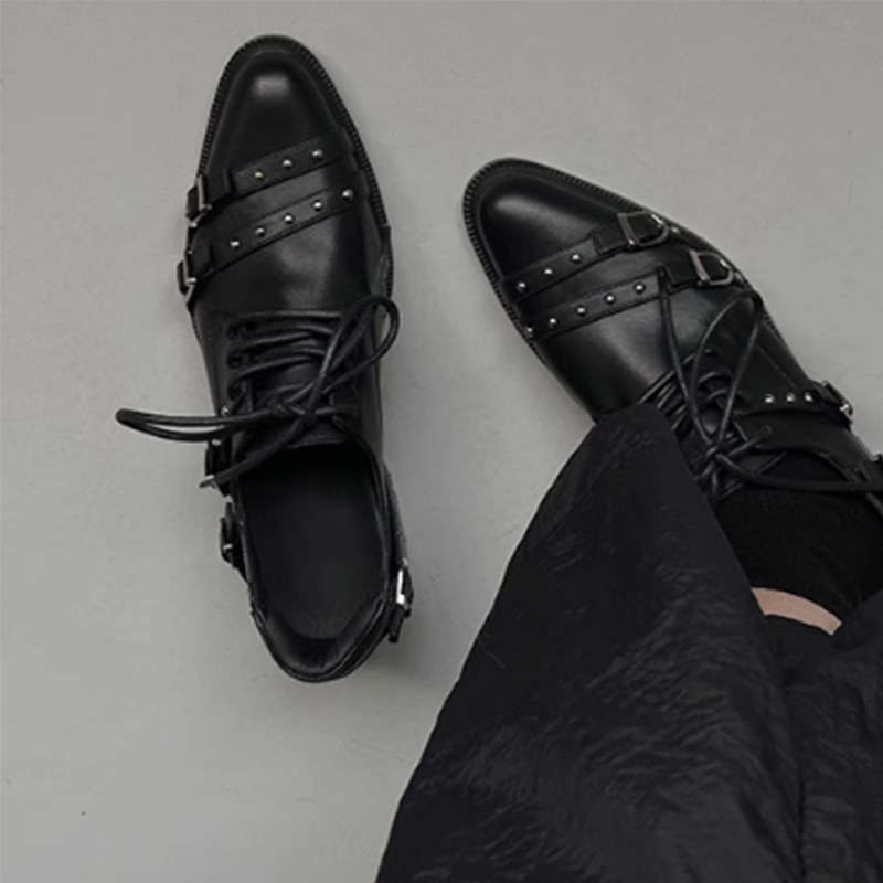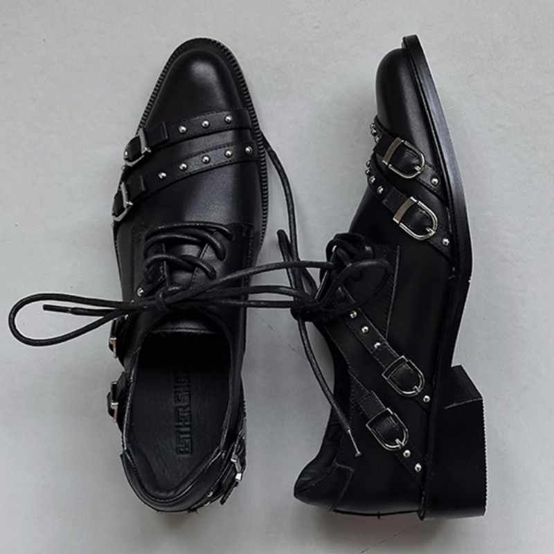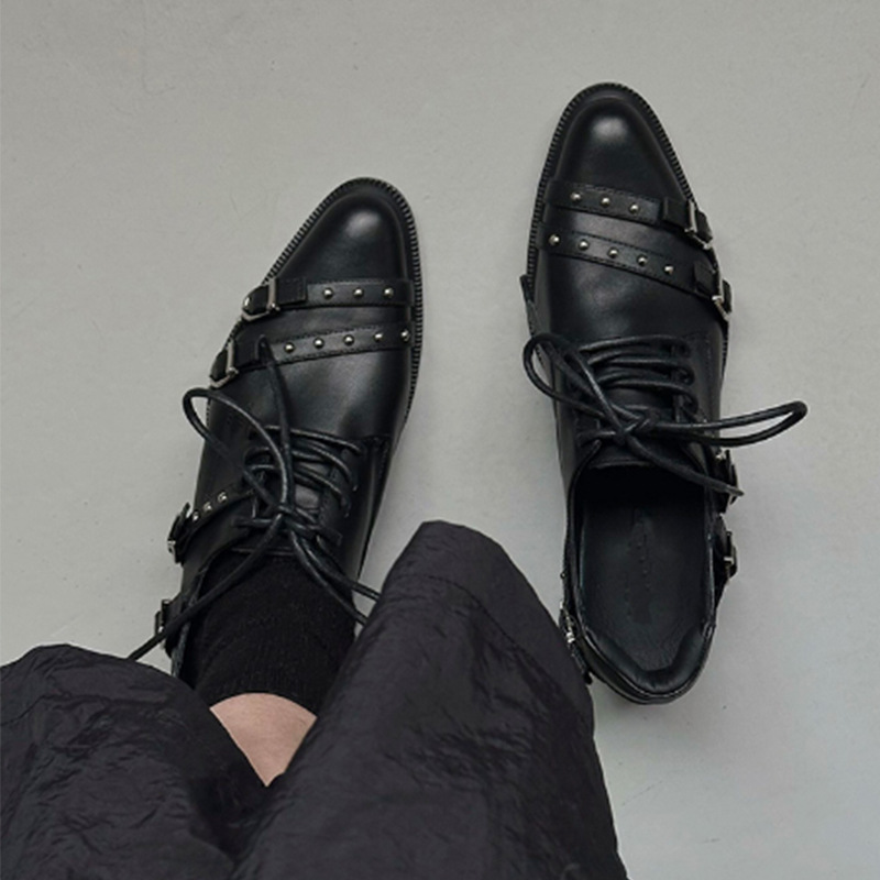 Cowhide Edition ~ 두꺼운 하단 빅 헤드 메탈 벨트 올 매치 로퍼 여성 영국 스타일 작은 높이 증가 레이스 업 작은 가죽 신발