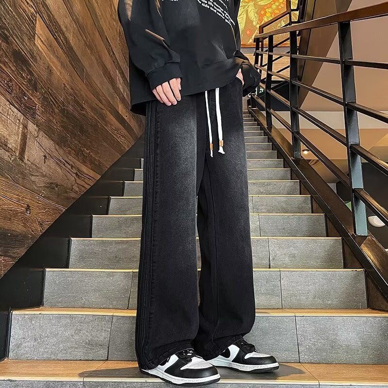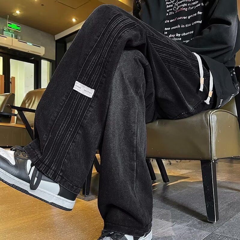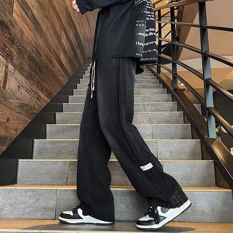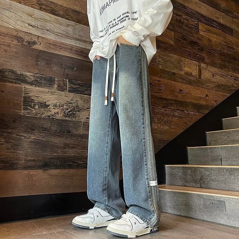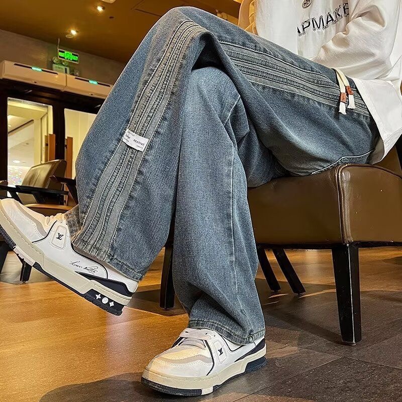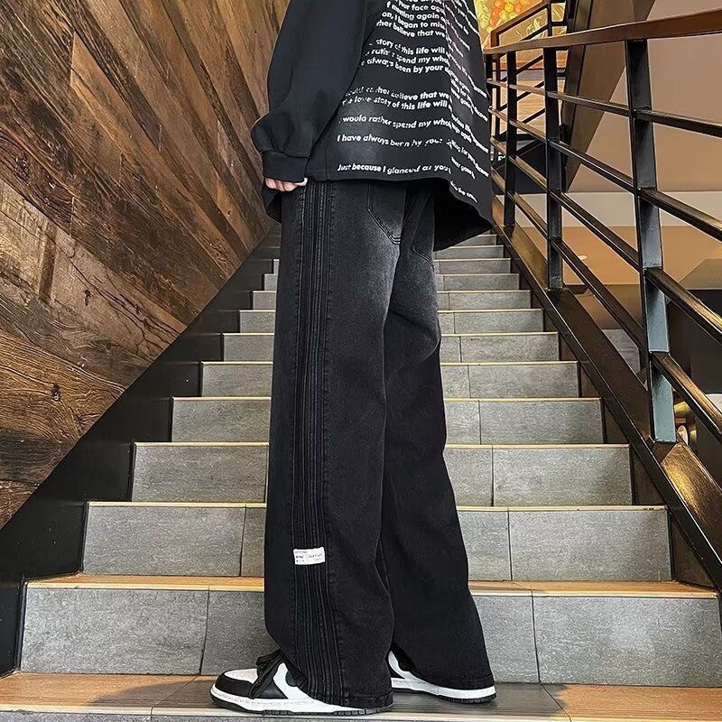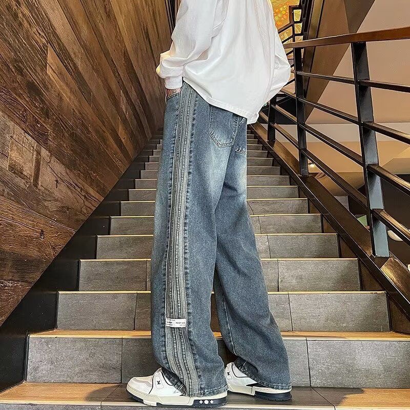 아메리칸 스타일 사이드 스트라이프 데님 바지 남자 봄과 가을 새로운 하이 엔드 센스 루즈 패셔너블 올 매치 캐주얼 스트레이트 바지