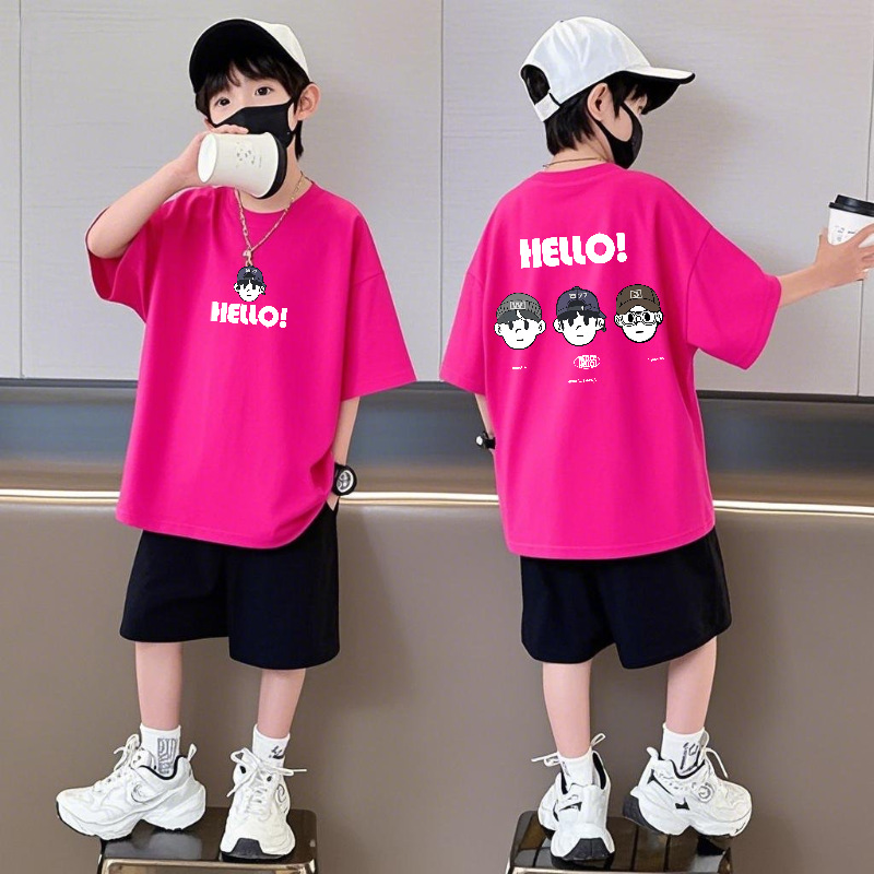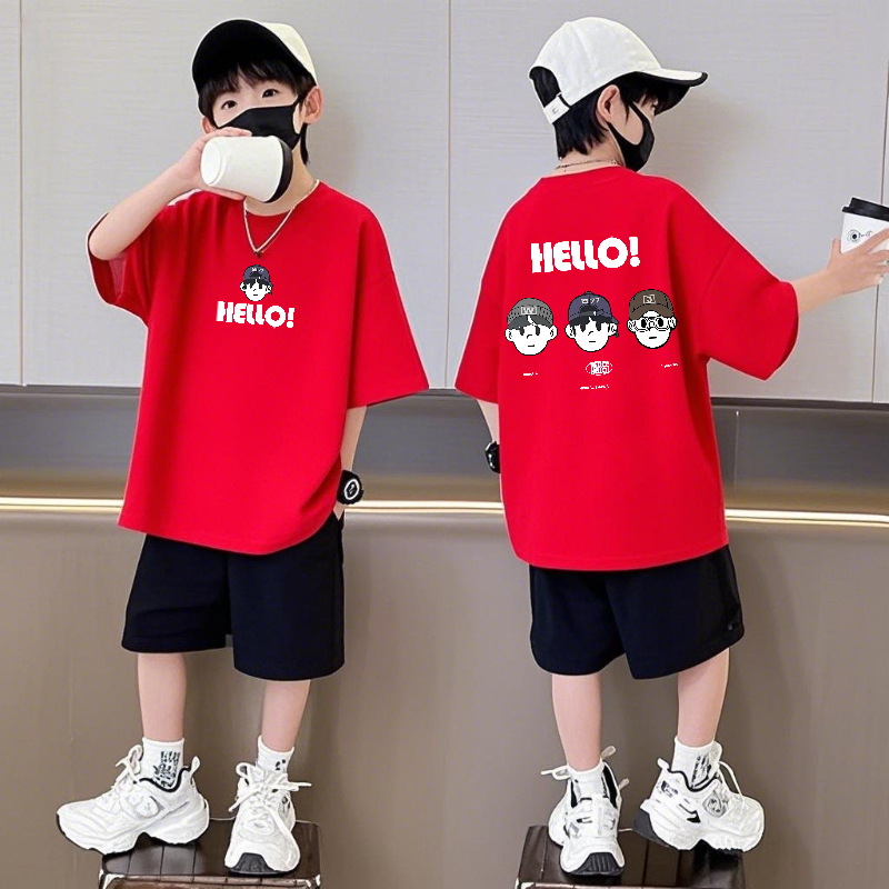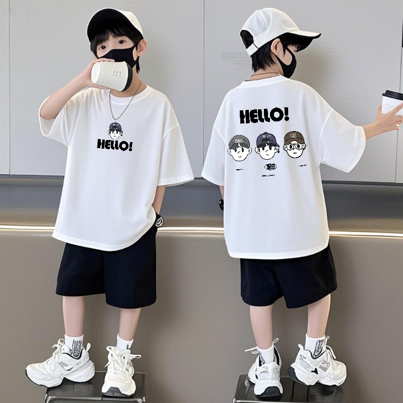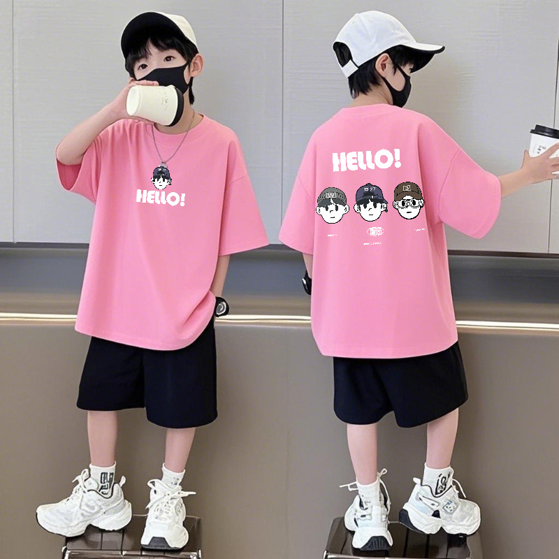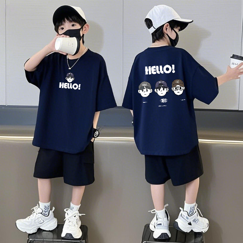 순수 코튼 반팔 반바지 소년 정장 여름 새로운 느슨한 라운드 넥 반팔 소년과 어린이 캐주얼 투피스 세트 유행