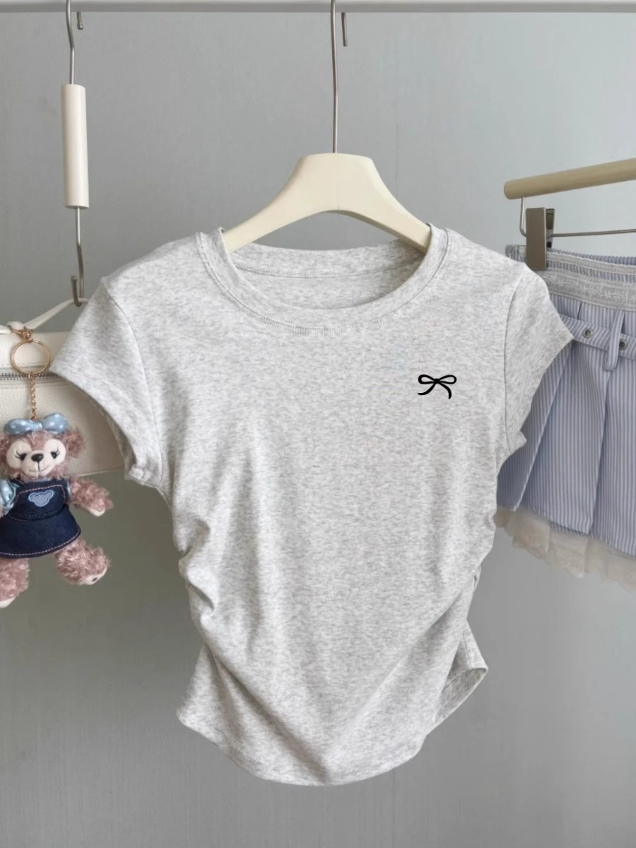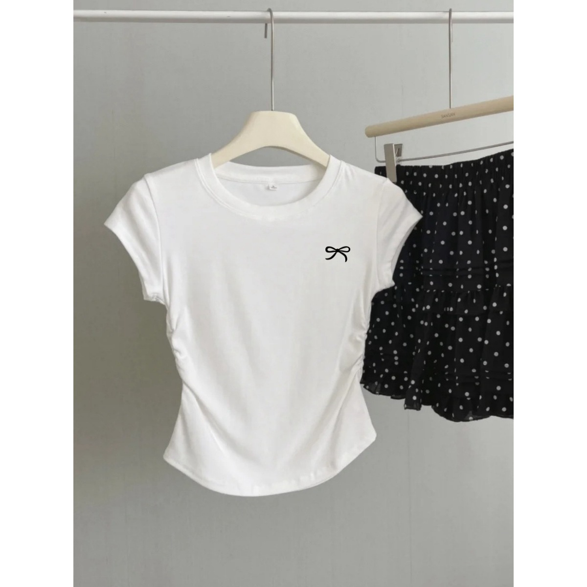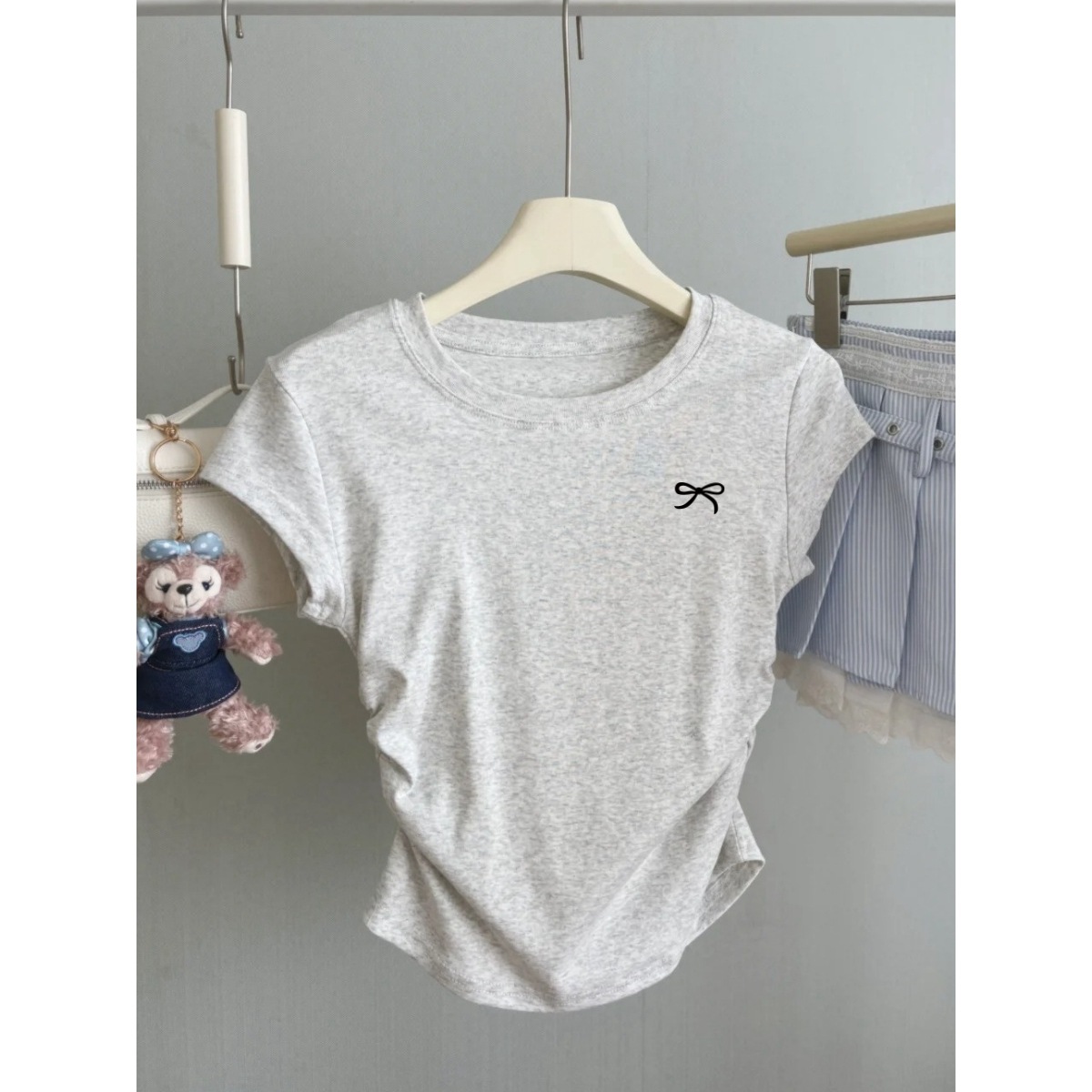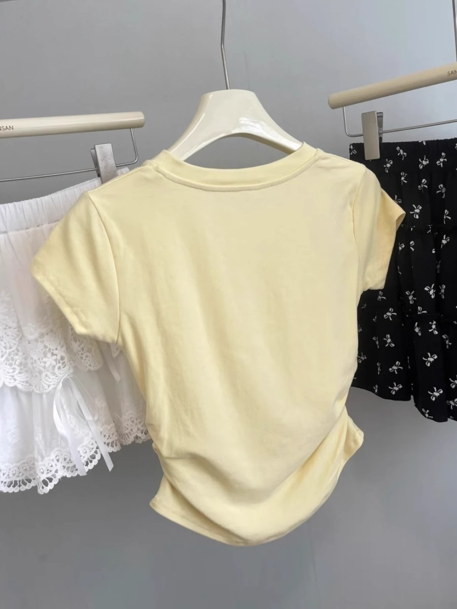 아메리칸 숄더 라운드 넥 우아한 반팔 코튼 티셔츠 여성용 여름 불규칙한 헴 디자인 센스 슬림 핏 이너 탑