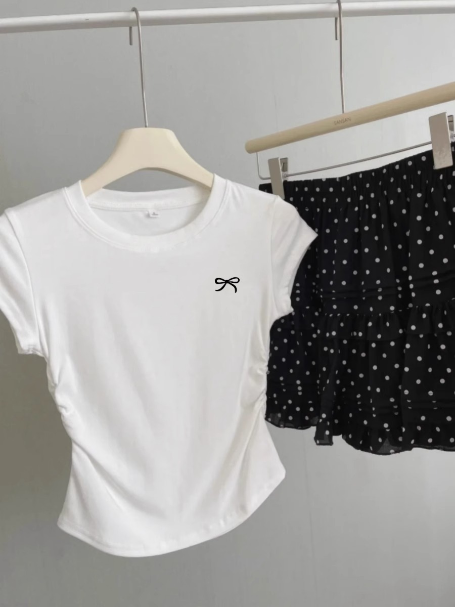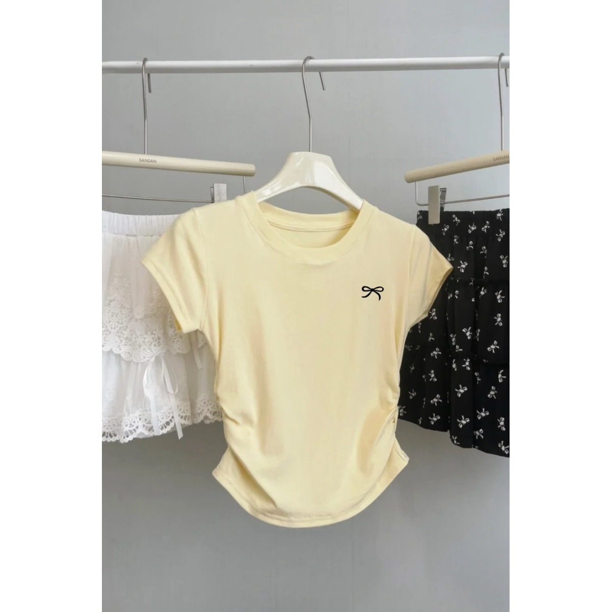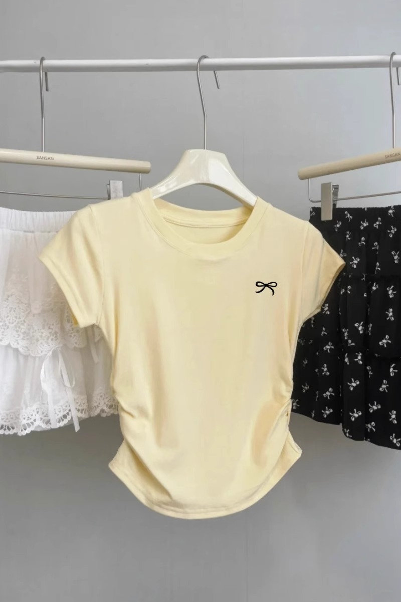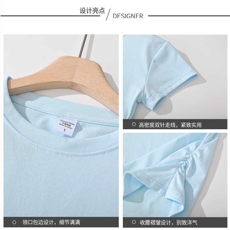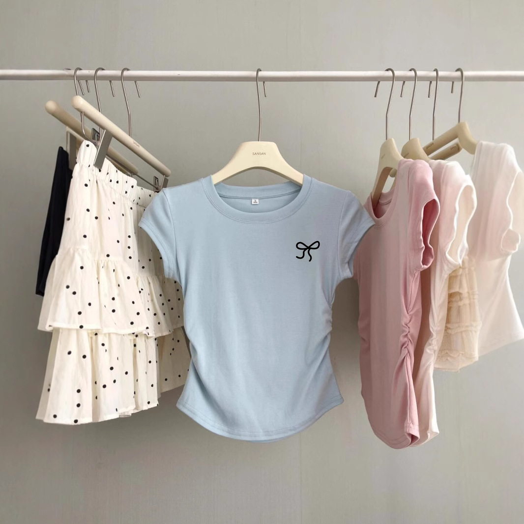 아메리칸 숄더 라운드 넥 우아한 반팔 코튼 티셔츠 여성용 여름 불규칙한 헴 디자인 센스 슬림 핏 이너 탑