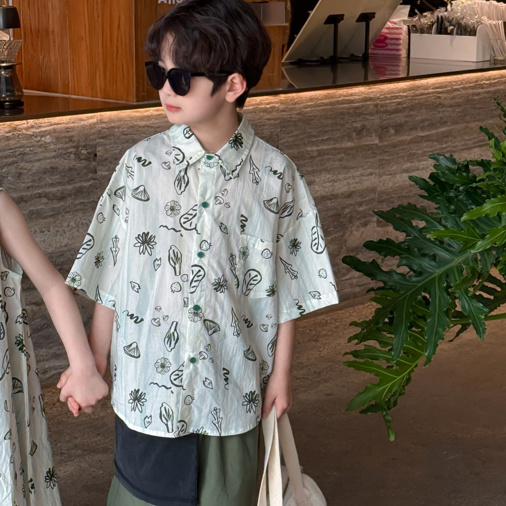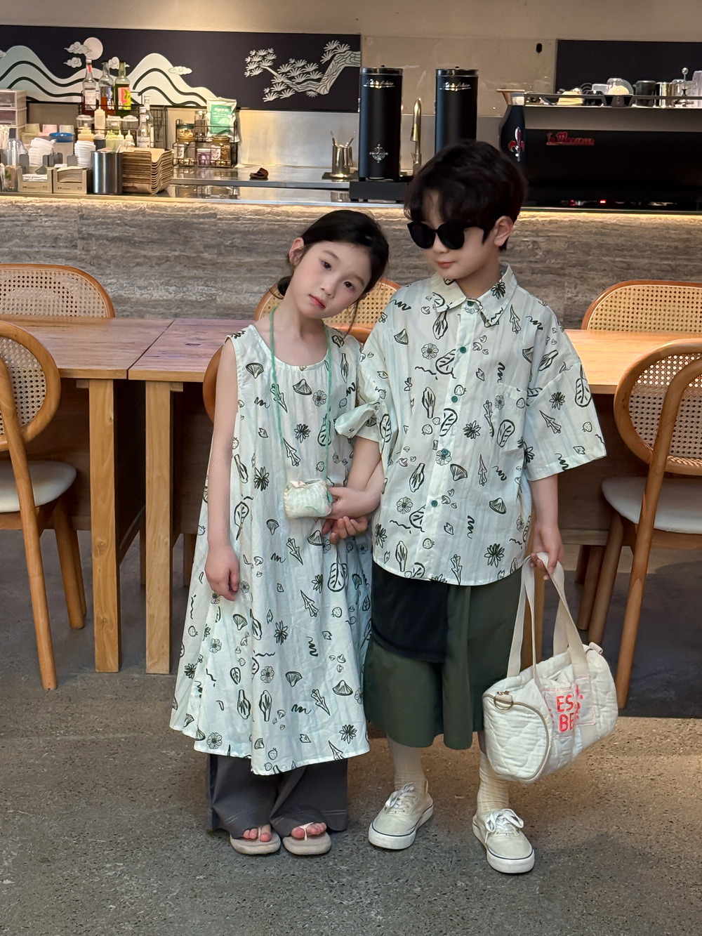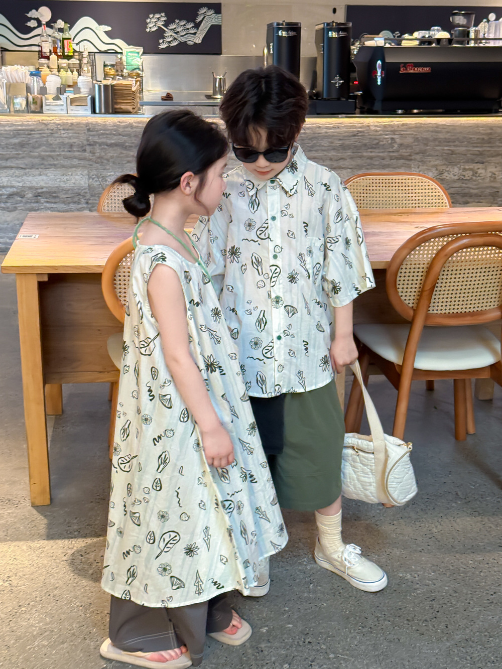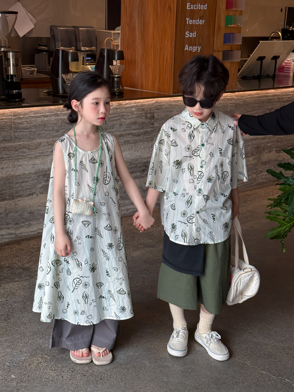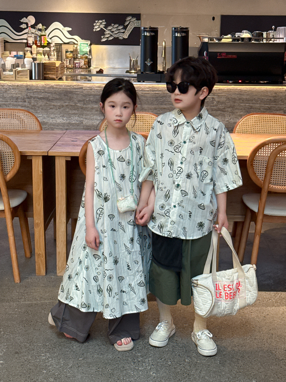 아동용 셔츠 2026 여름 한국 스타일 남아 여아용 풀 프린트 반팔 셔츠 아동용 루즈핏 캐주얼 조끼 스커트 형제자매룩