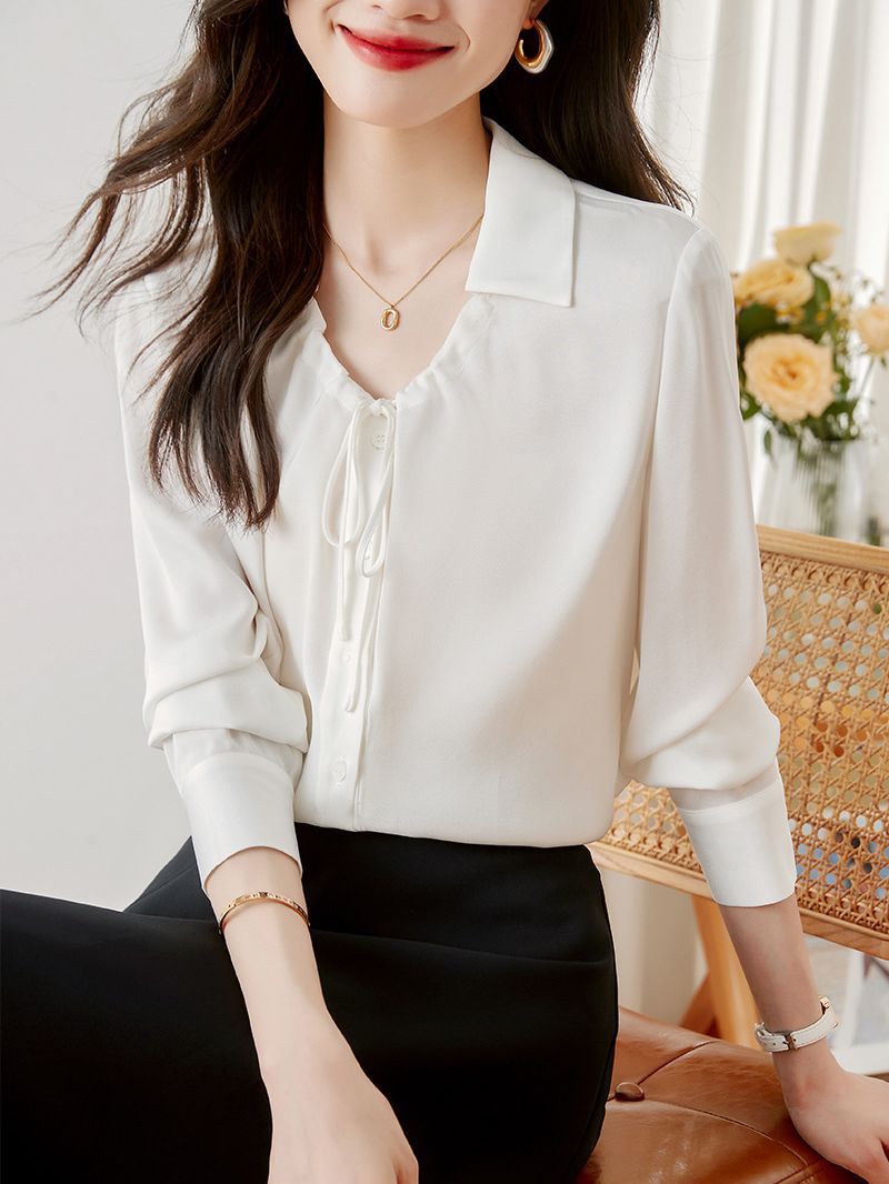 2023 디자인 센스 드로우 스트링 긴팔 셔츠 여성의 가을 새로운 느슨한 올 매치 웨스턴 스타일 레이스 업 보우 탑스토어 가기
