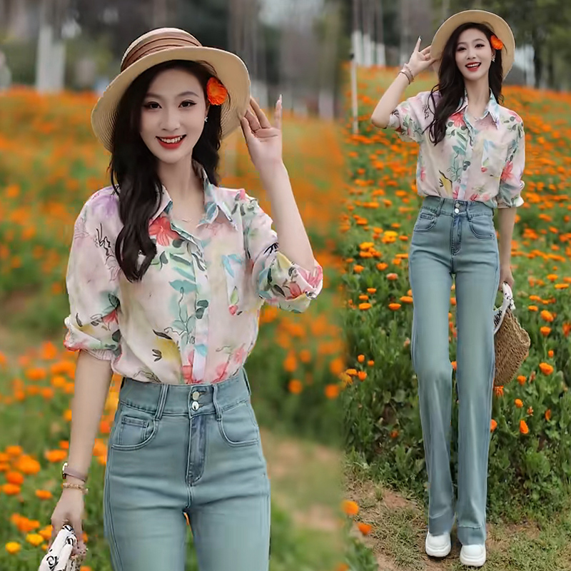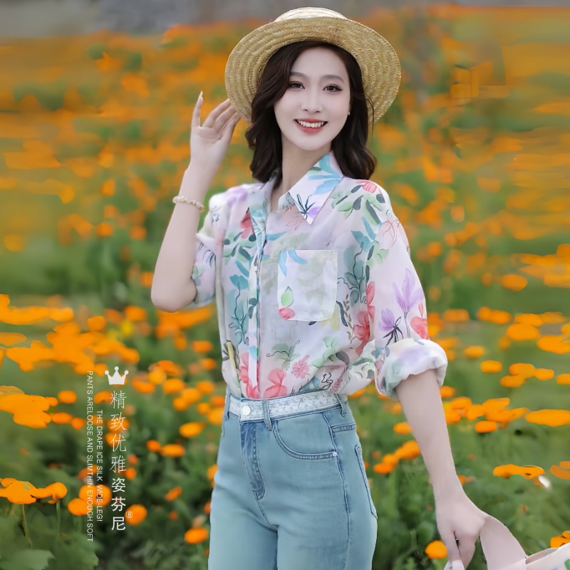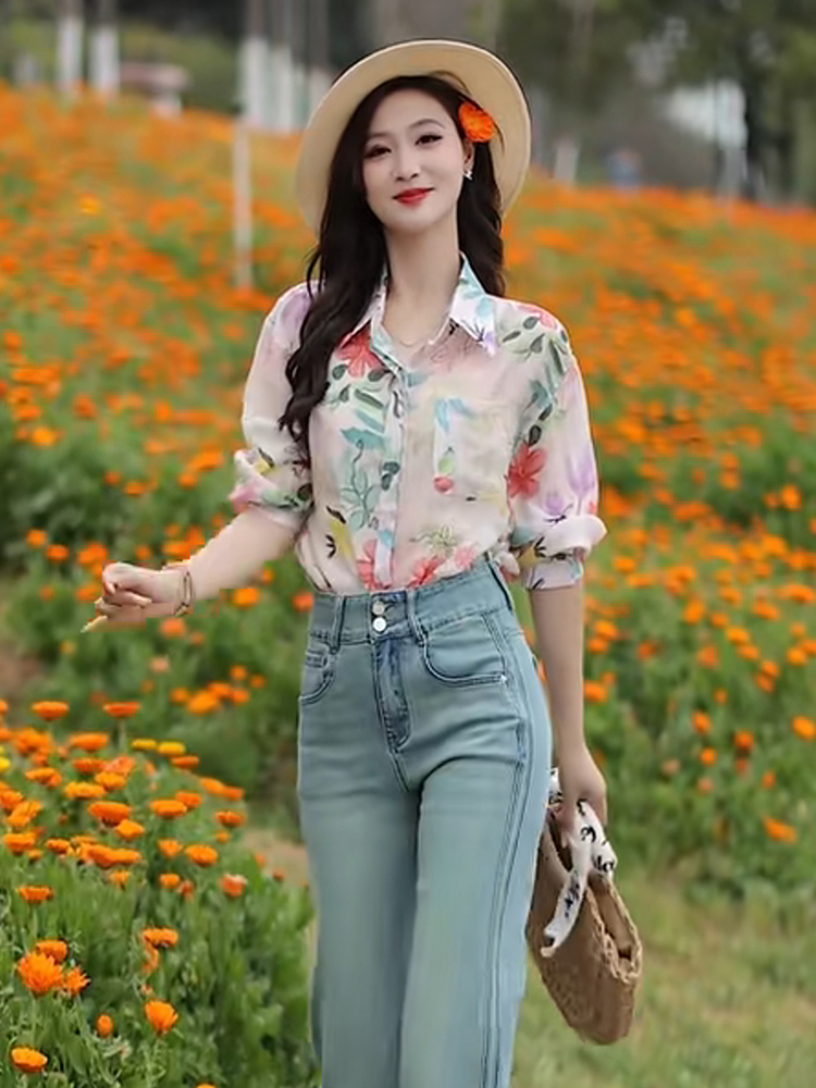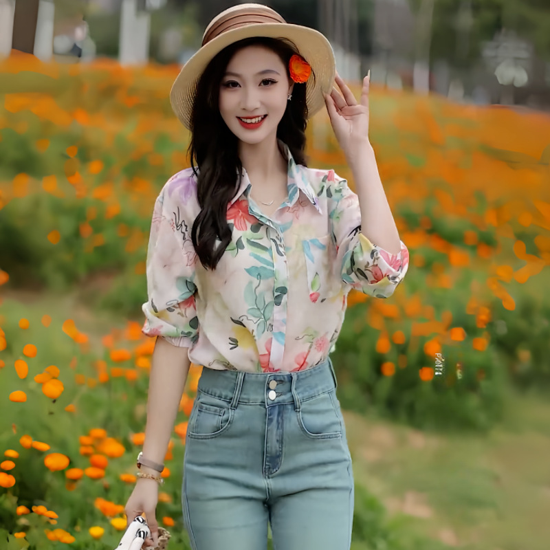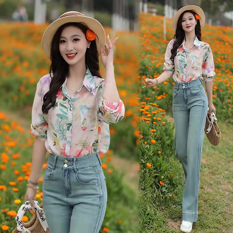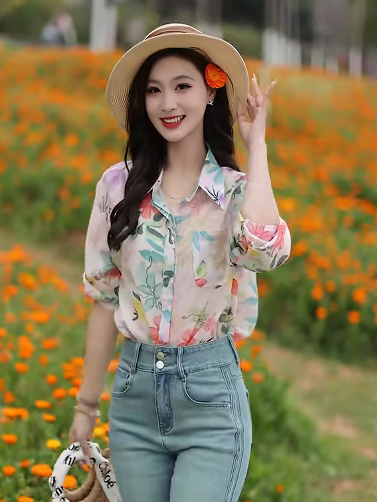 패션 꽃 셔츠 여성의 여름 새로운 도착 세련된 긴 소매 선 스크린 탑 작은 텐셀 인쇄 얇은 셔츠스토어 가기