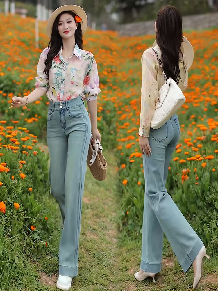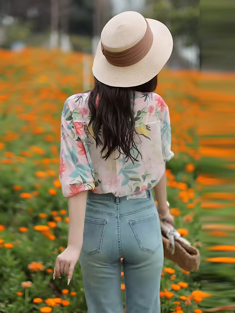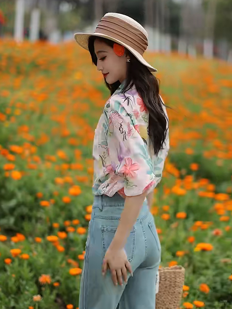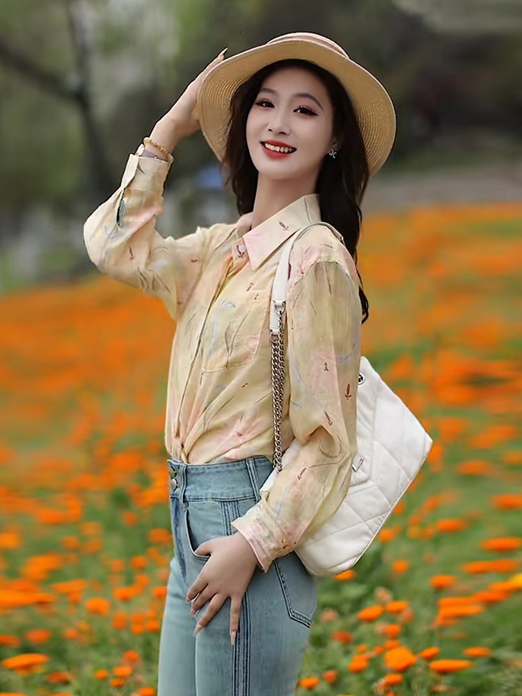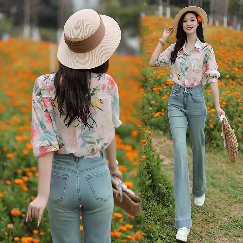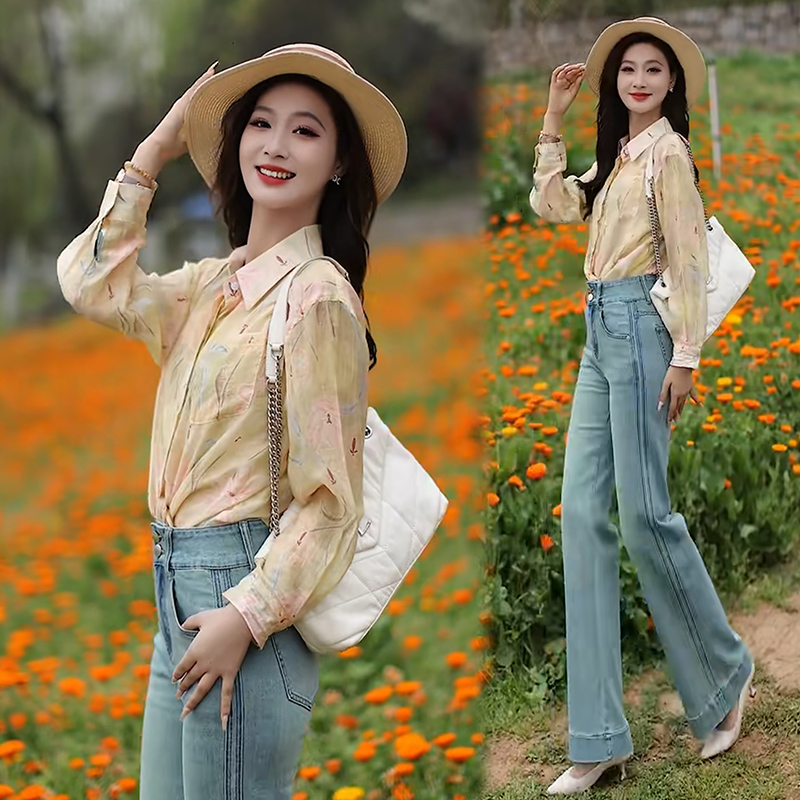 패션 꽃 셔츠 여성의 여름 새로운 도착 세련된 긴 소매 선 스크린 탑 작은 텐셀 인쇄 얇은 셔츠스토어 가기
