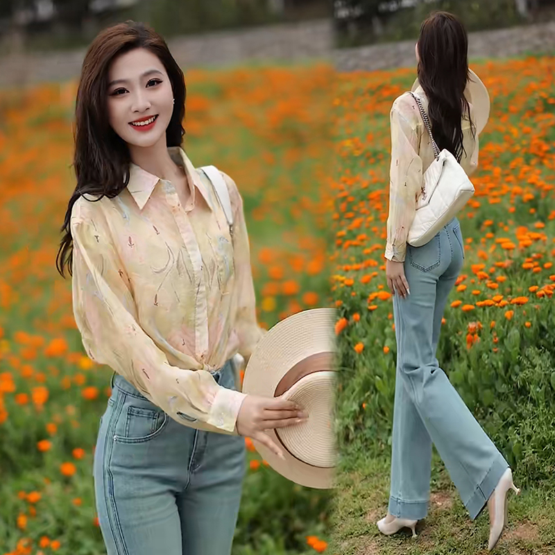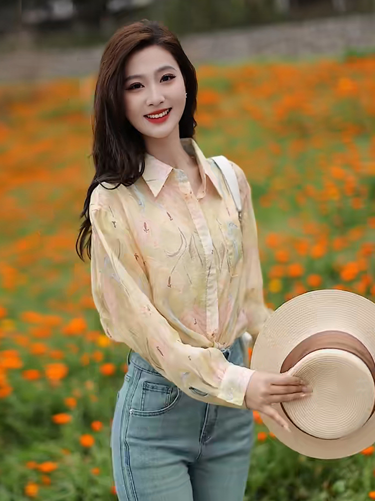 패션 꽃 셔츠 여성의 여름 새로운 도착 세련된 긴 소매 선 스크린 탑 작은 텐셀 인쇄 얇은 셔츠