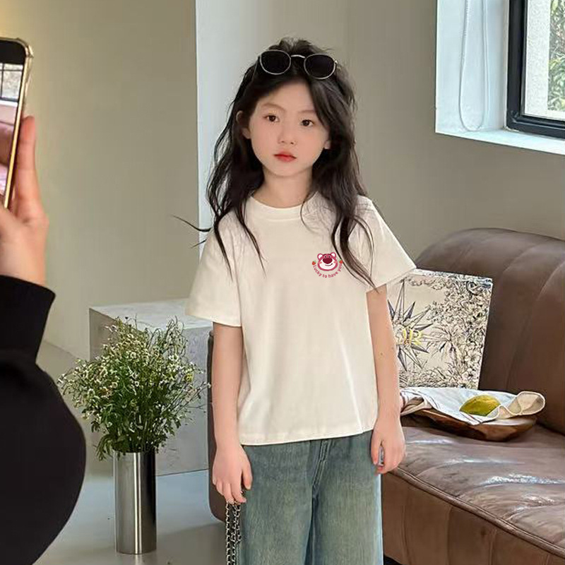 소녀면 반소매 티셔츠 2025 새 여름 어린이 얼음 도자기 면 걸즈 라운드 넥 반소매 티셔츠