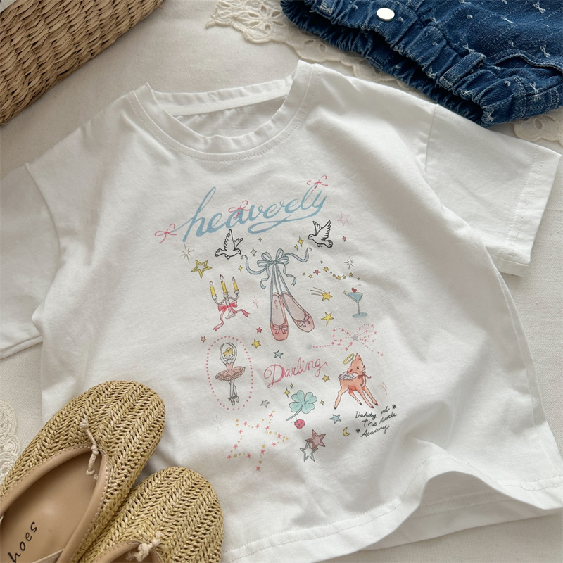 Xifan 25 여름 새로운 어린이 한국 인쇄 단색 반팔 소녀 아기 발레 크루 넥 티셔츠 탑
