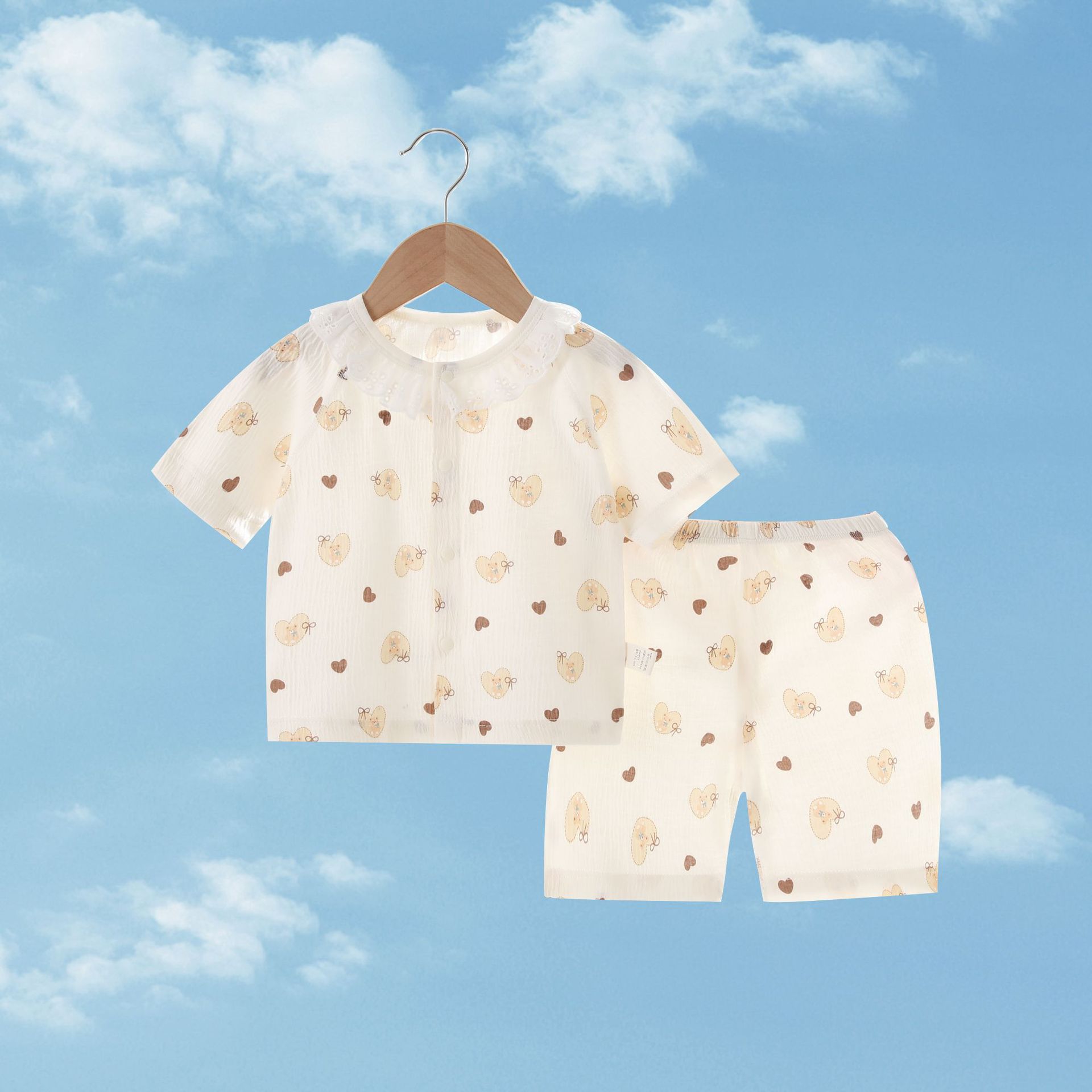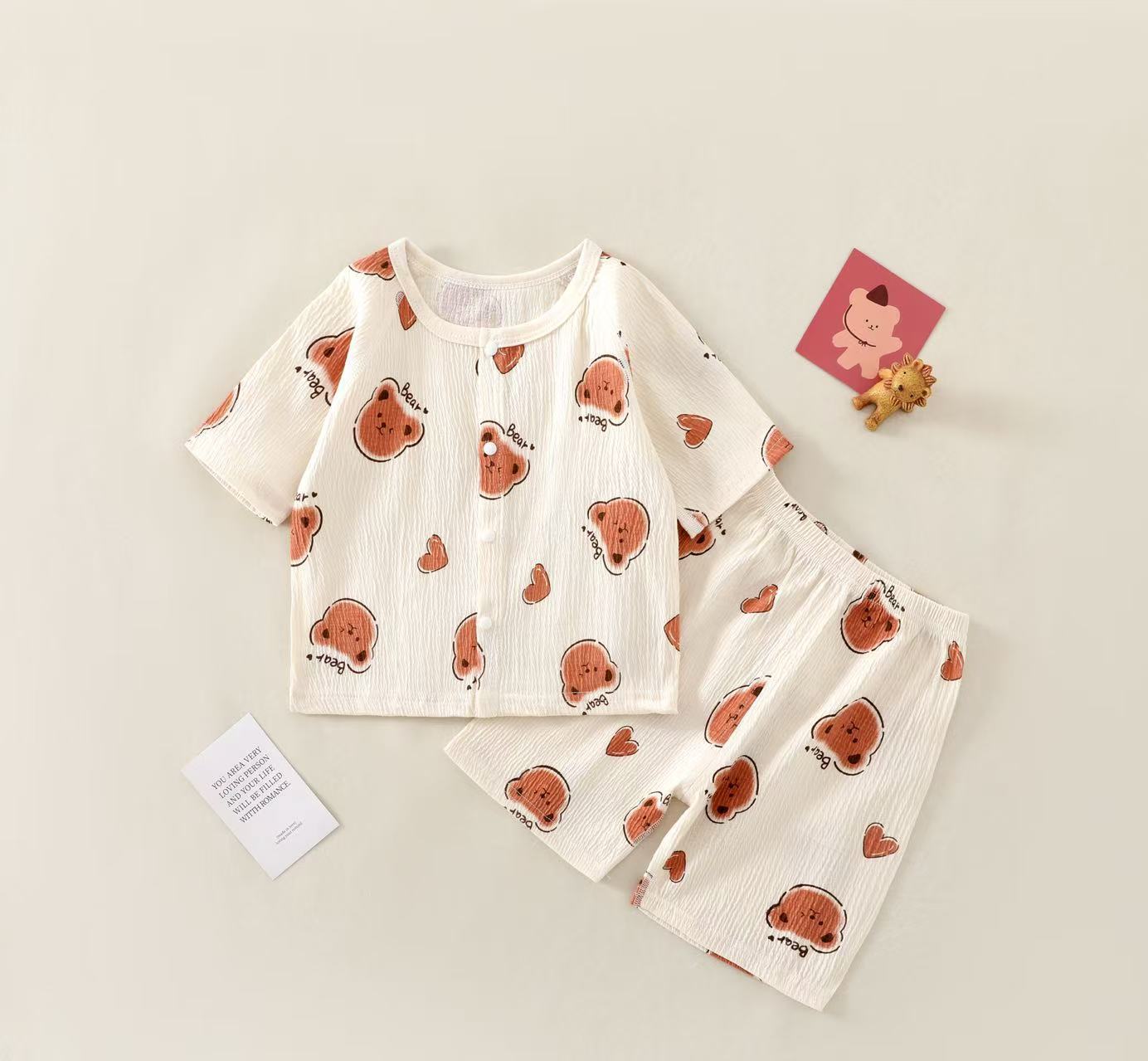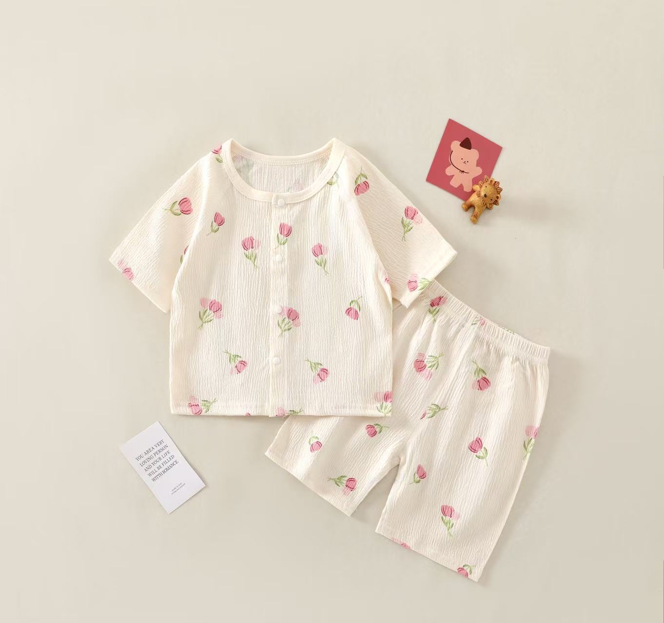 여름 새 클래스 A 베이비 홈 의류 세트 소년 소녀 아기 반팔 카디건 반바지 주름진 코튼 얇은 파자마