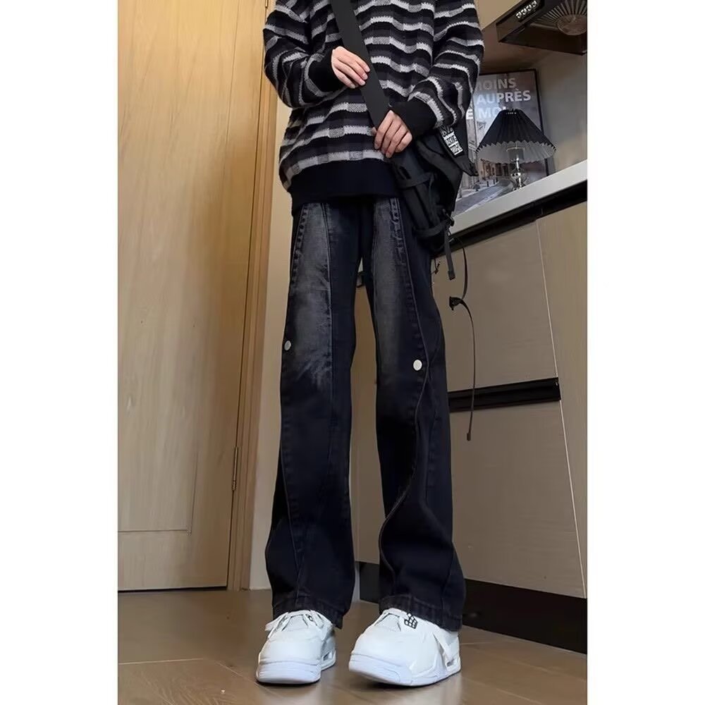 봄, 가을 남성용 그라데이션 블랙 청바지 아메리칸 하이 스트리트 바이브 마이크로 플레어 팬츠 스플라이스 디자인 스트레이트 청바지스토어 가기