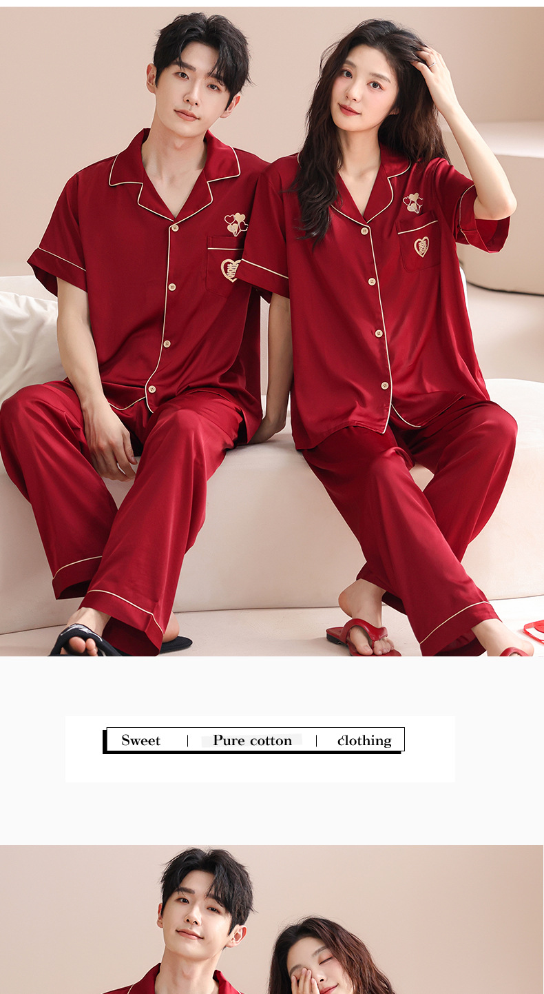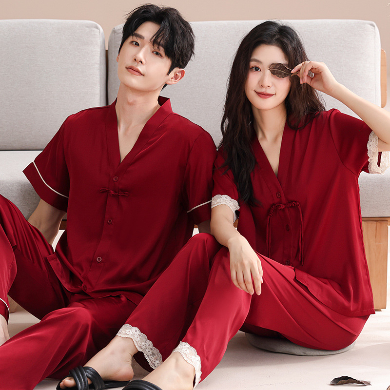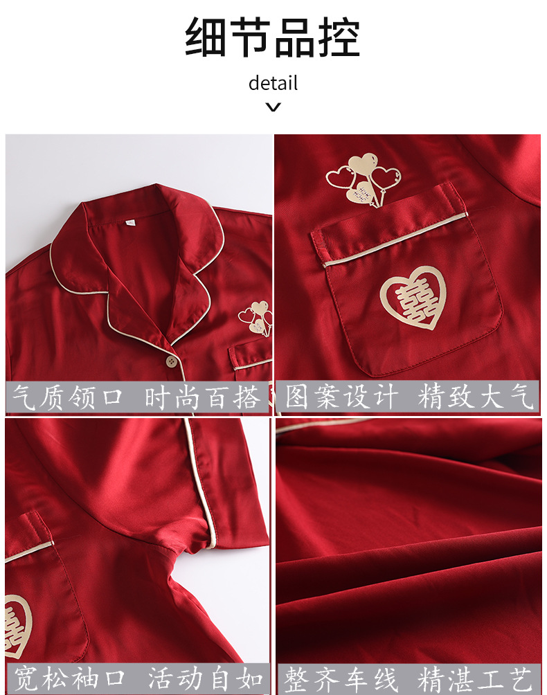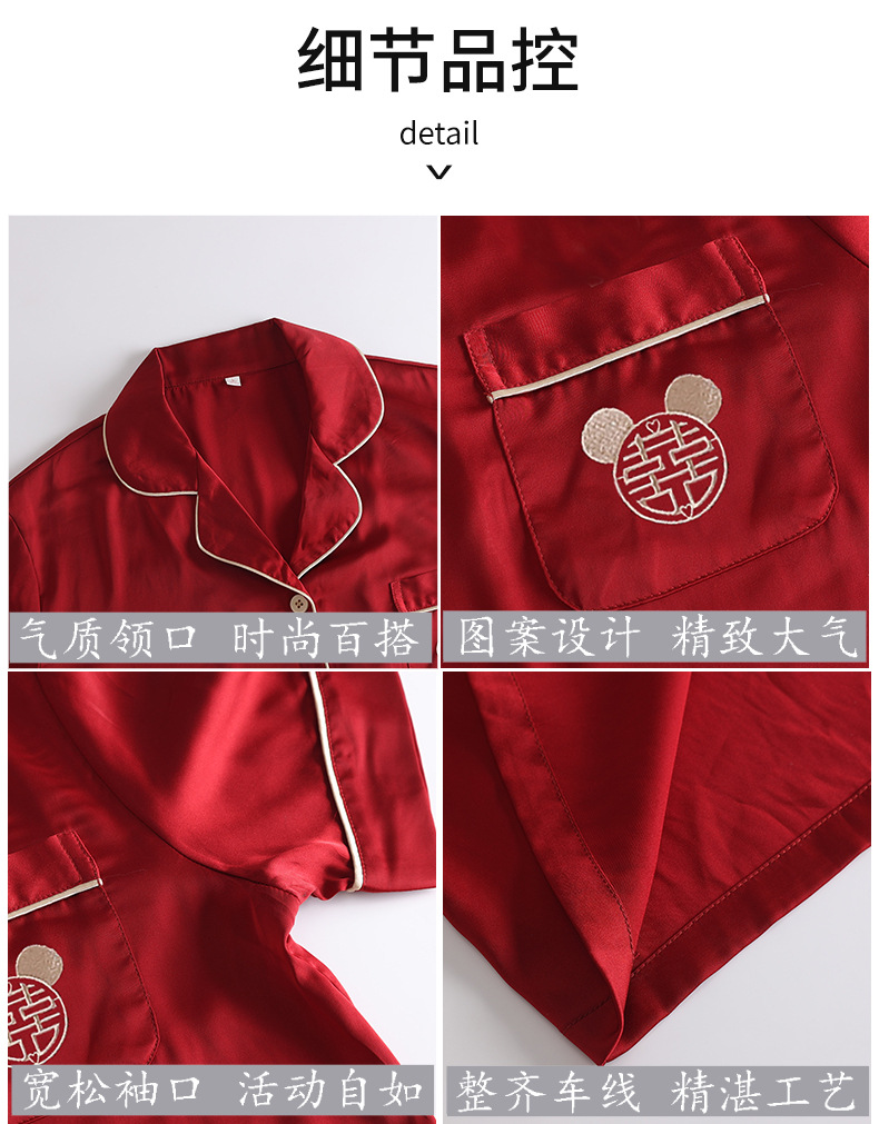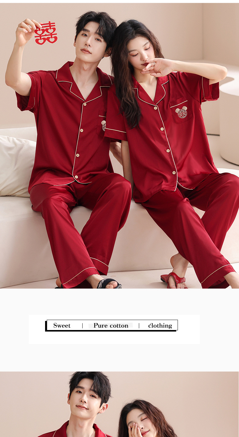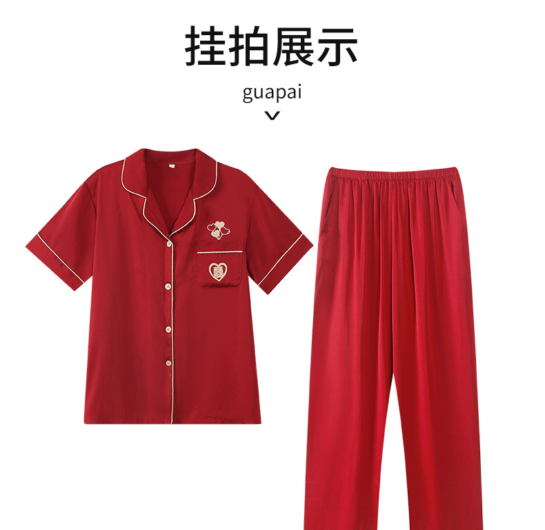 레드 웨딩 커플 잠옷 아이스 실크 반팔 바지 여름 하이 엔드 웨딩 남녀 축제 홈 옷스토어 가기