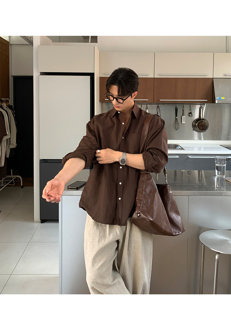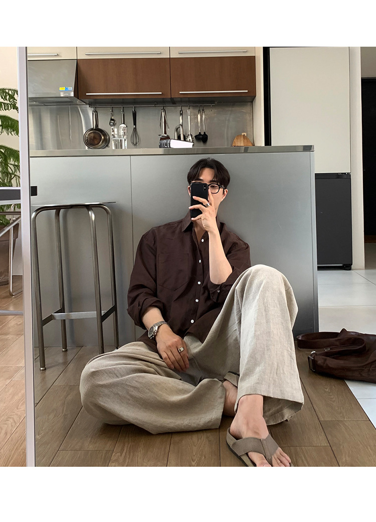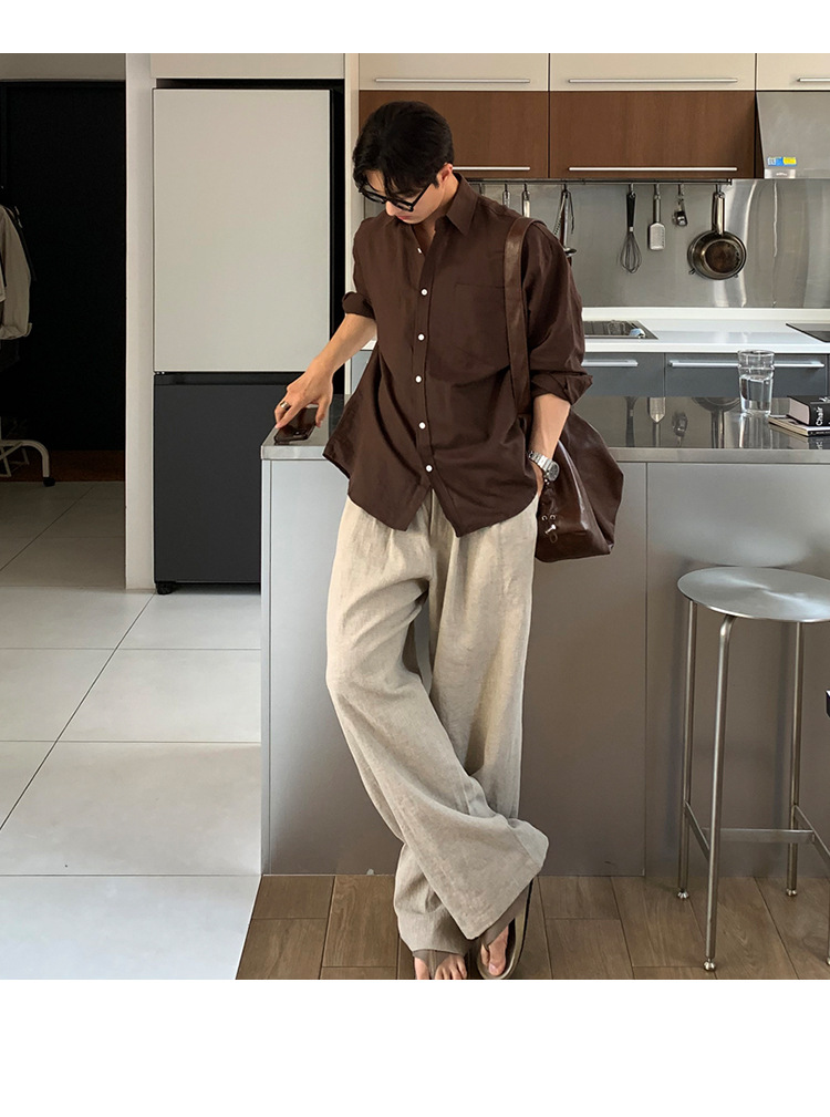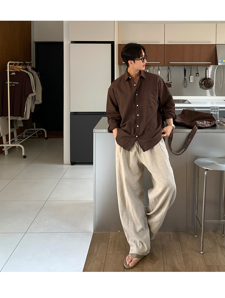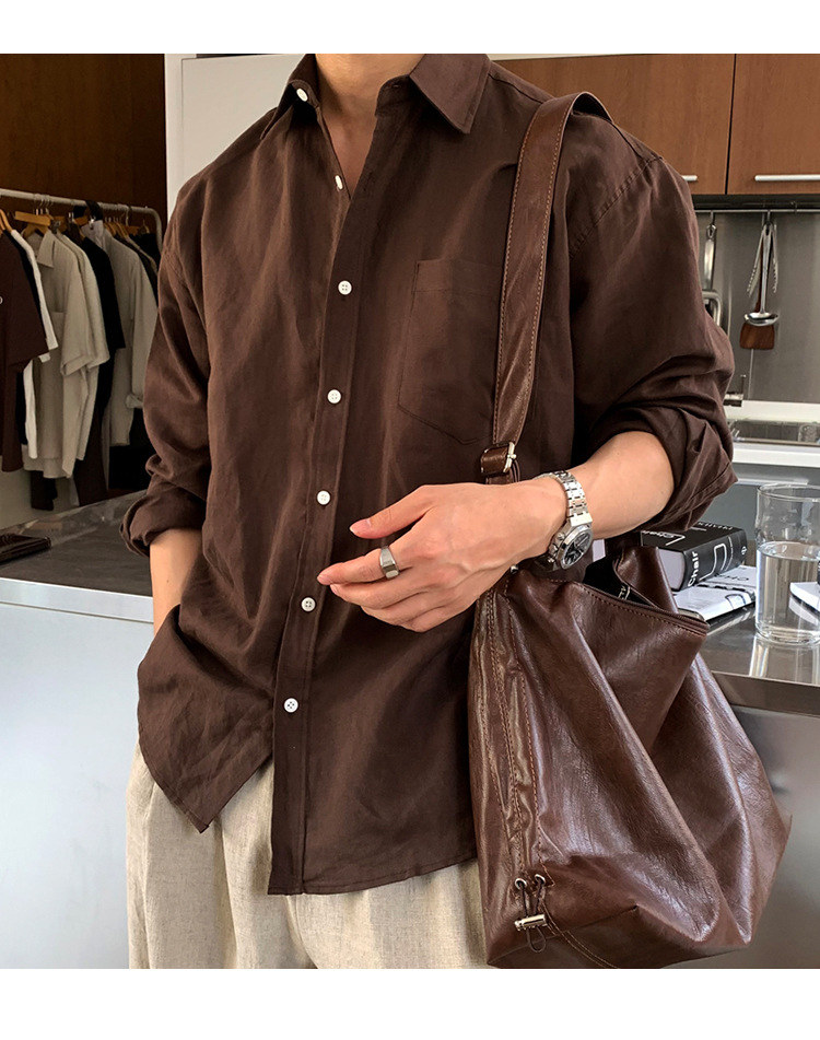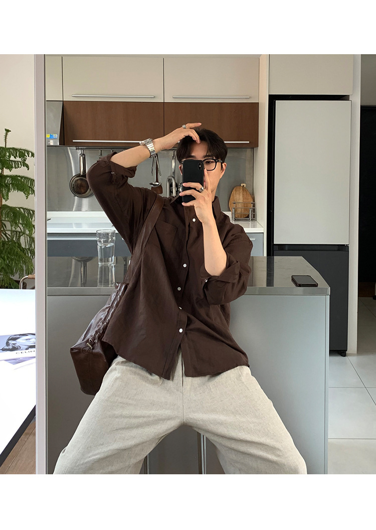 면화와 리넨 긴팔 셔츠 남자 봄 가을 한국 스타일 유행 잘 생긴 올매치 솔리드 컬러 재킷 마일라드 다크 브라운 인 셔츠스토어 가기