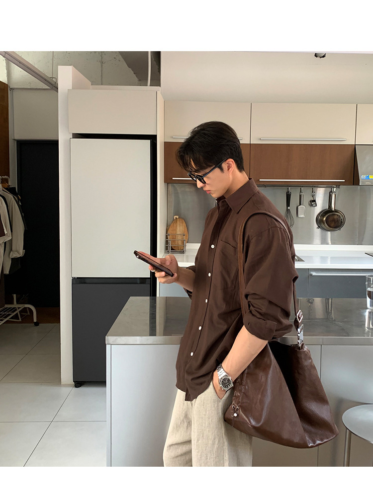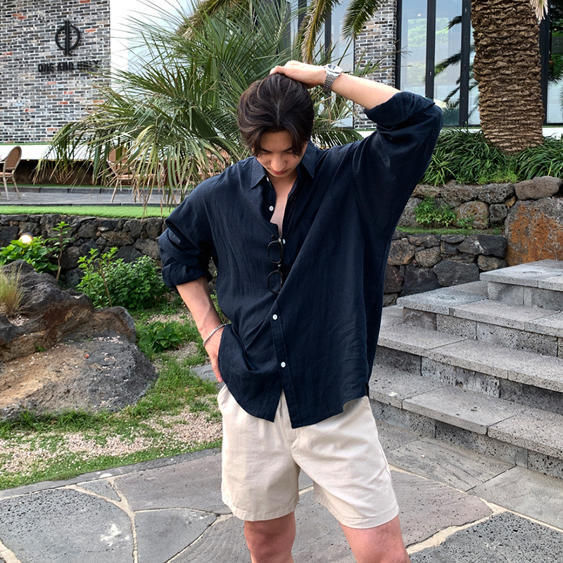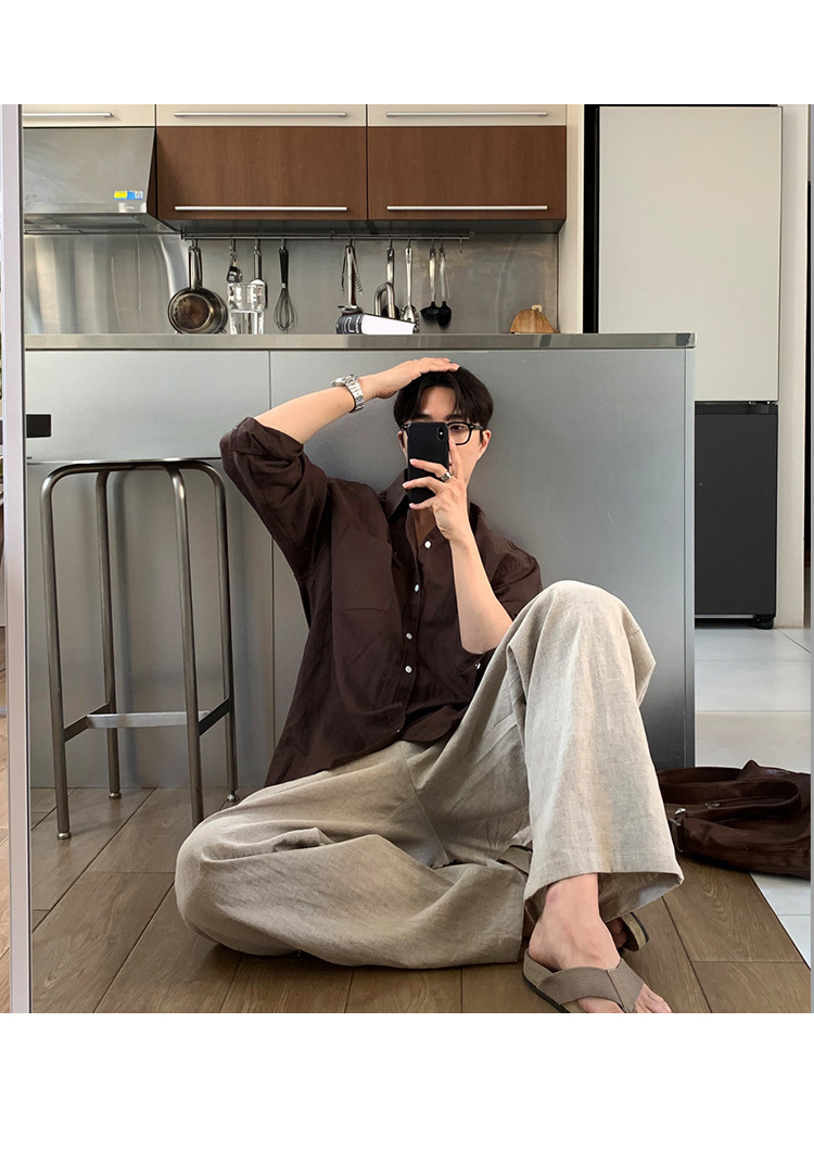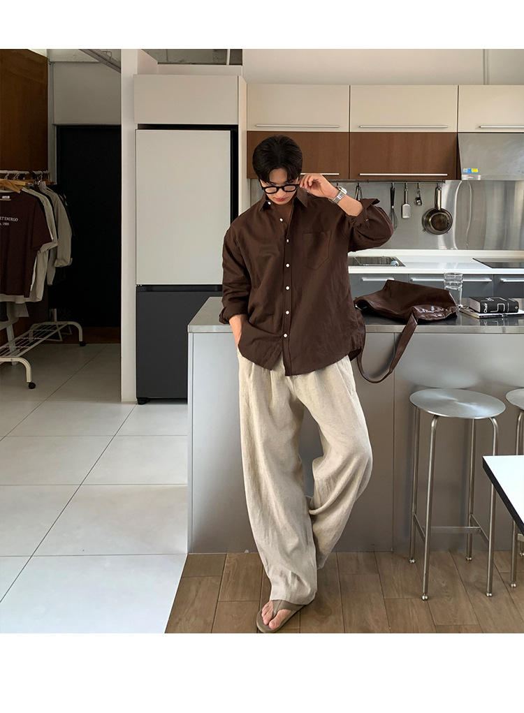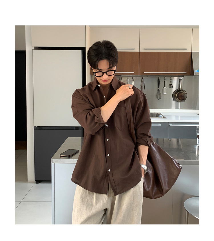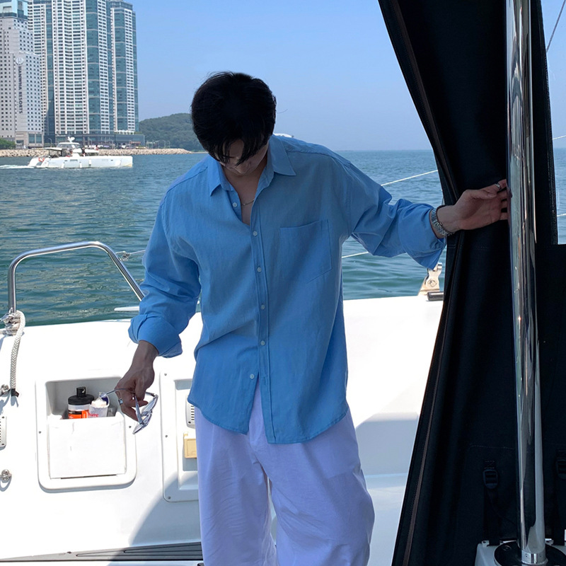 면화와 리넨 긴팔 셔츠 남자 봄 가을 한국 스타일 유행 잘 생긴 올매치 솔리드 컬러 재킷 마일라드 다크 브라운 인 셔츠스토어 가기