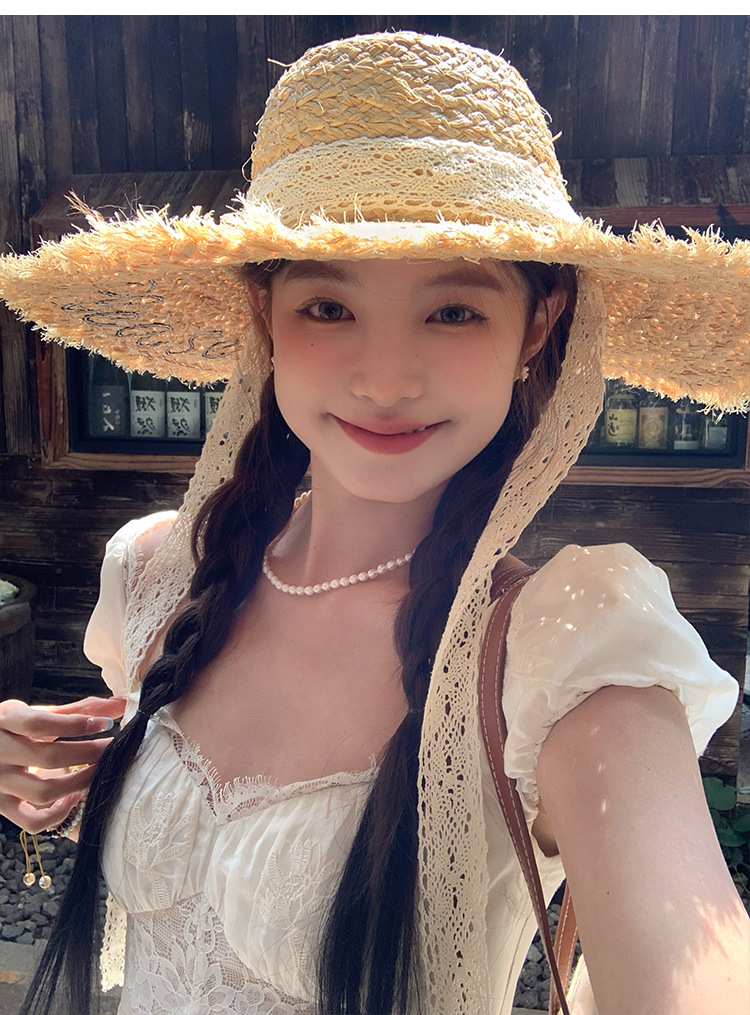 "라피 잔디" 스트랩 밀짚 모자 여성의 여름 큰 브림 양산 모자 해변 휴가 짠 모자