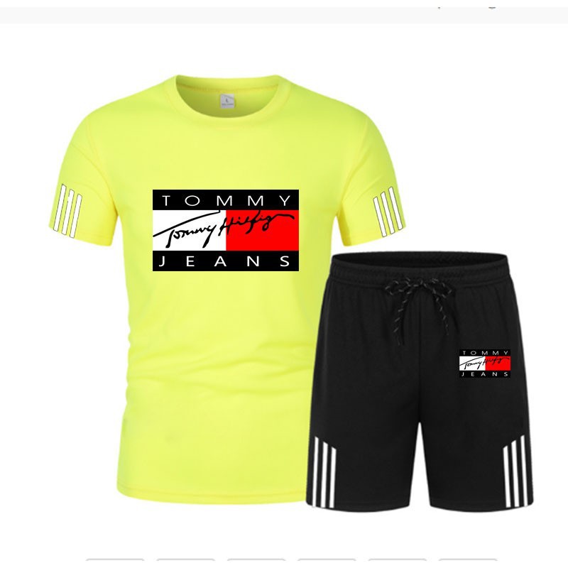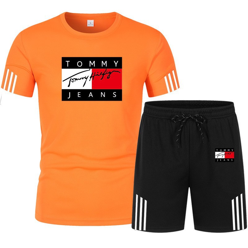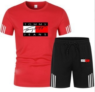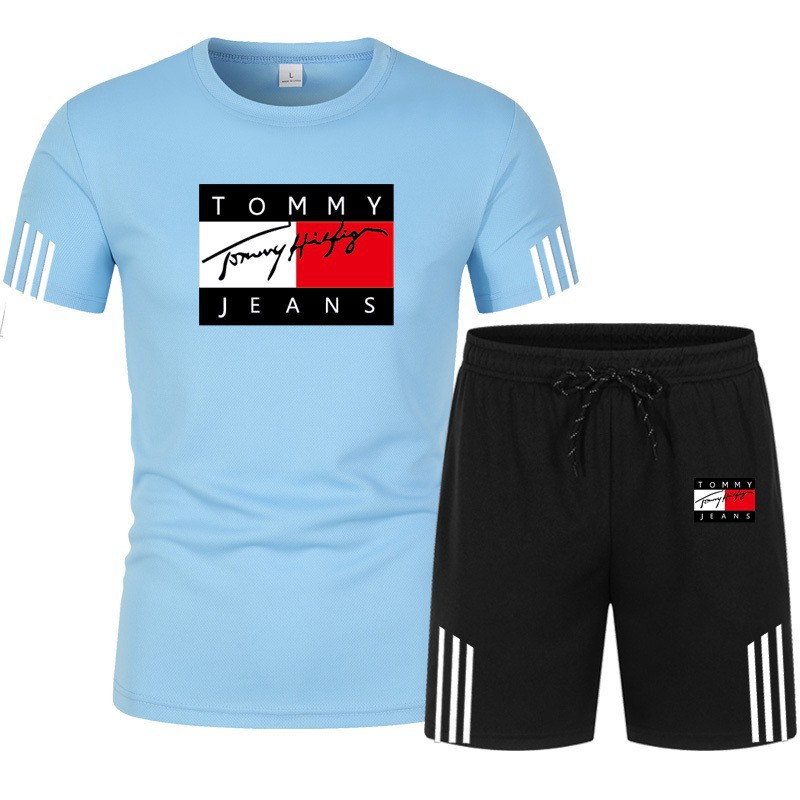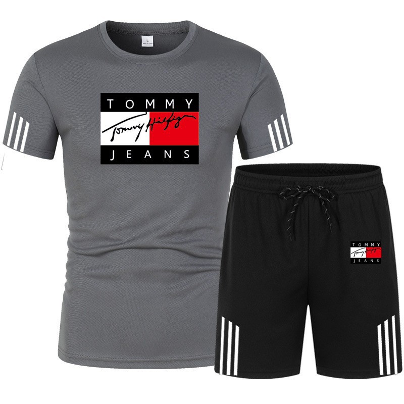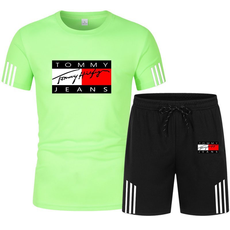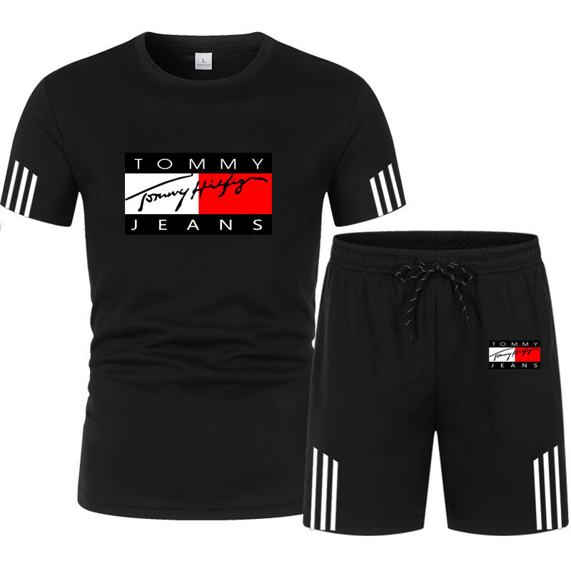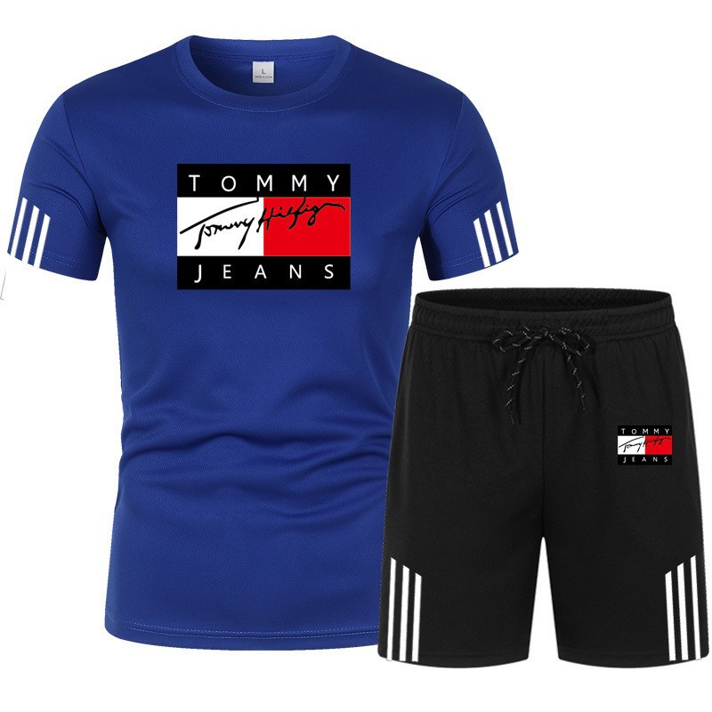 여름 신작 세 줄무늬 반팔 플러스 5점 반바지 투피스 캐주얼 스포츠 슈트 남성용 반팔 티셔츠스토어 가기