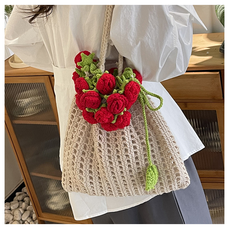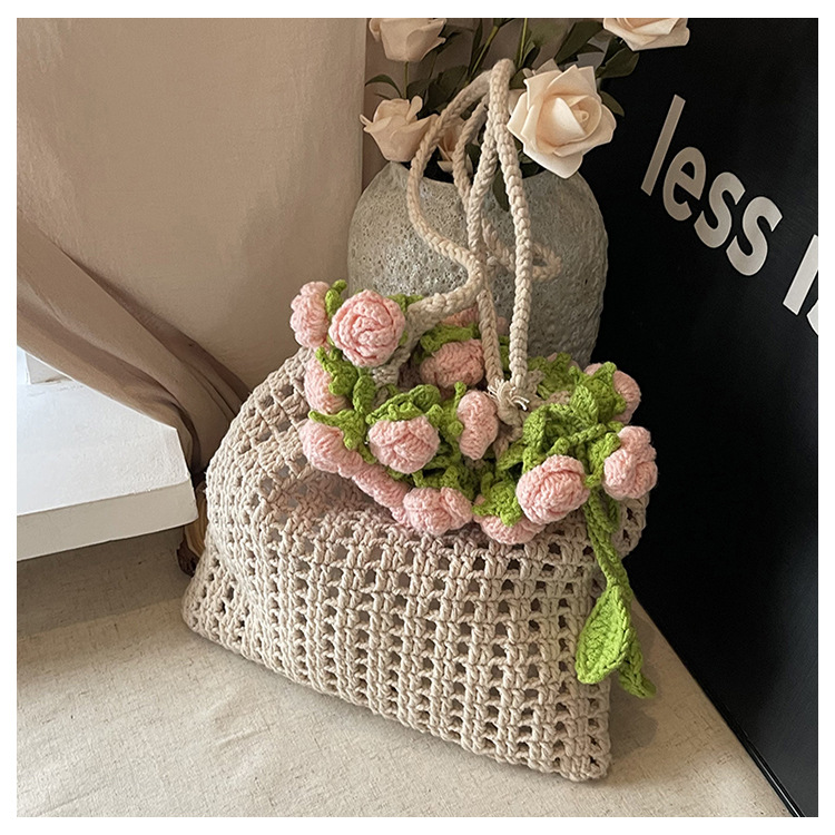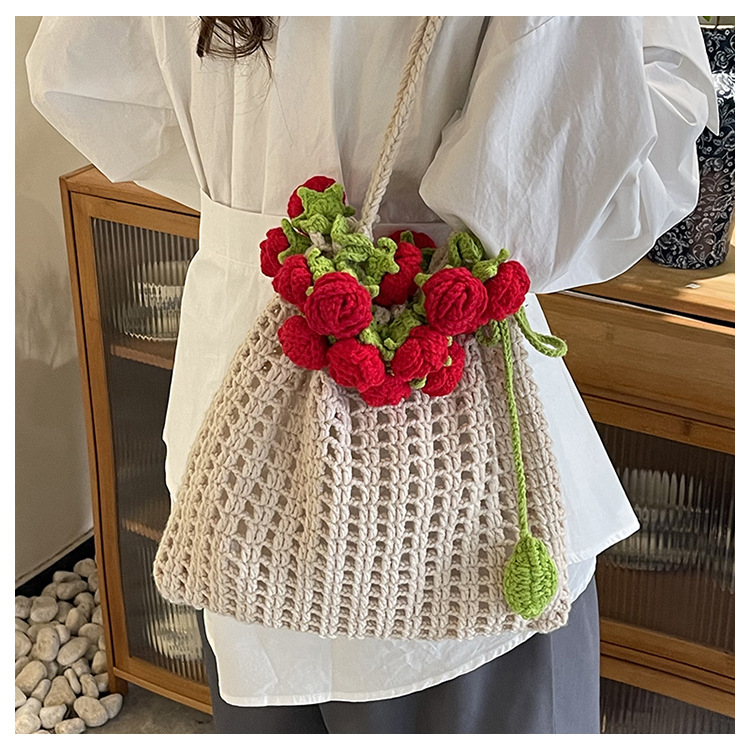아름다운 수제 크로 셰 뜨개질 양모 가방 목가적 인 스타일 로맨틱 로즈 버킷 가방 할로우 짠 달콤한 어깨 가방