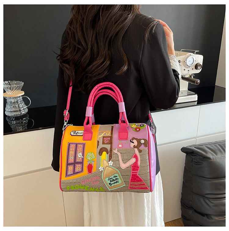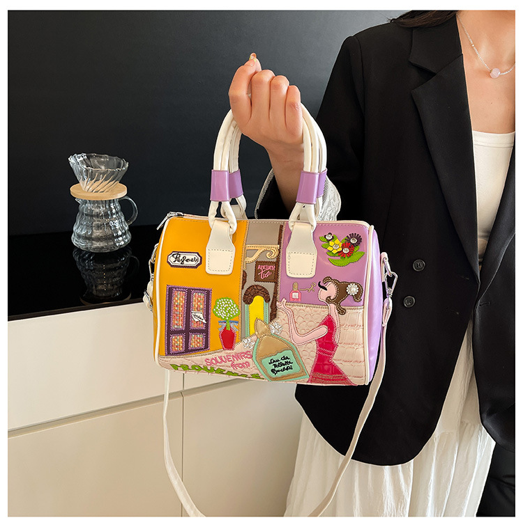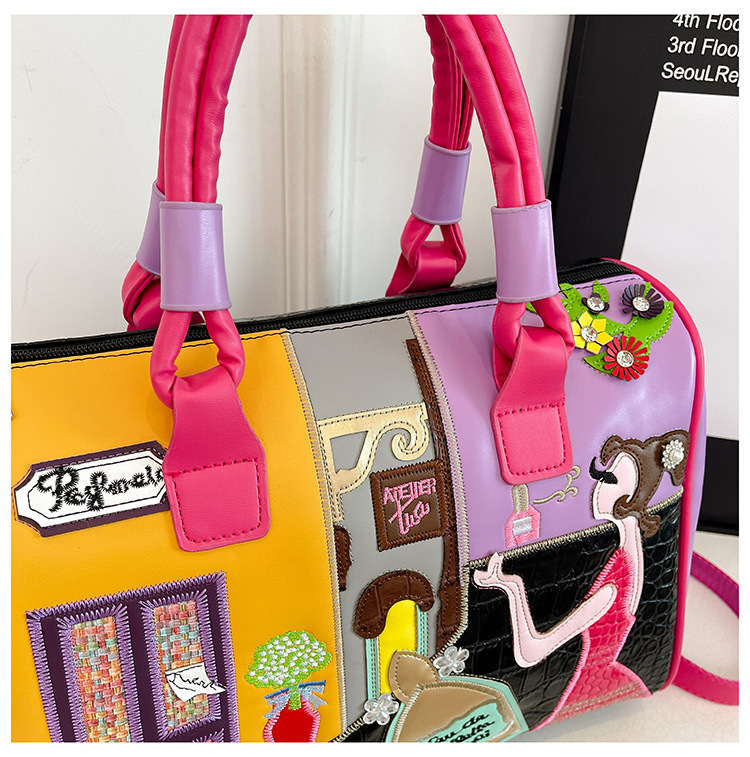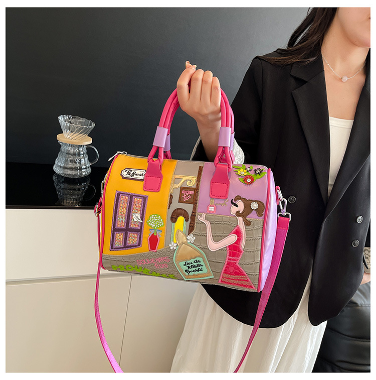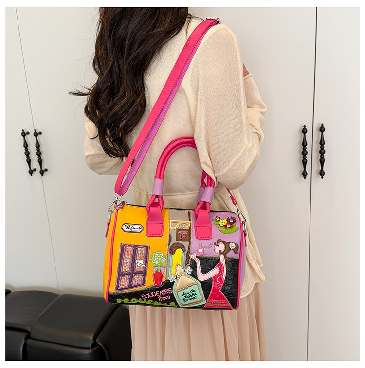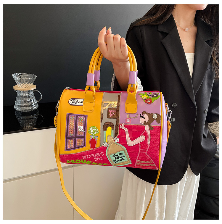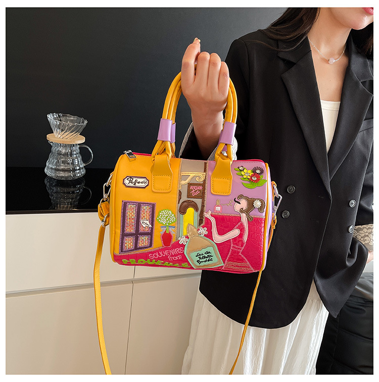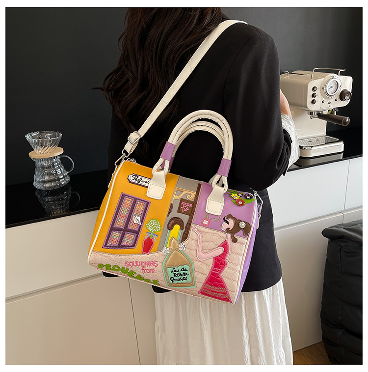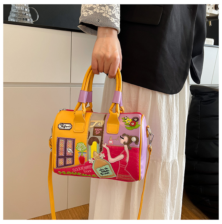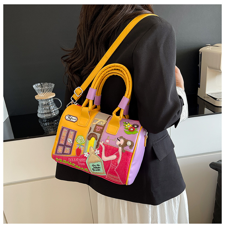 유럽과 미국의 레트로 대용량 휴대용 보스턴 가방 2025 새로운 틈새 자수 테이프 통근 어깨 크로스 바디 백