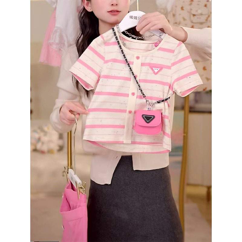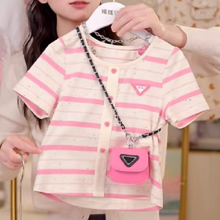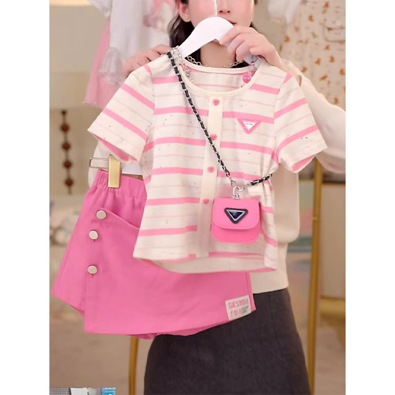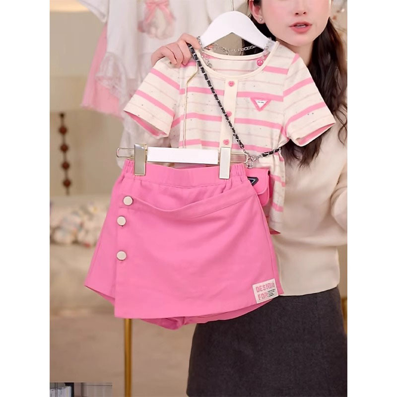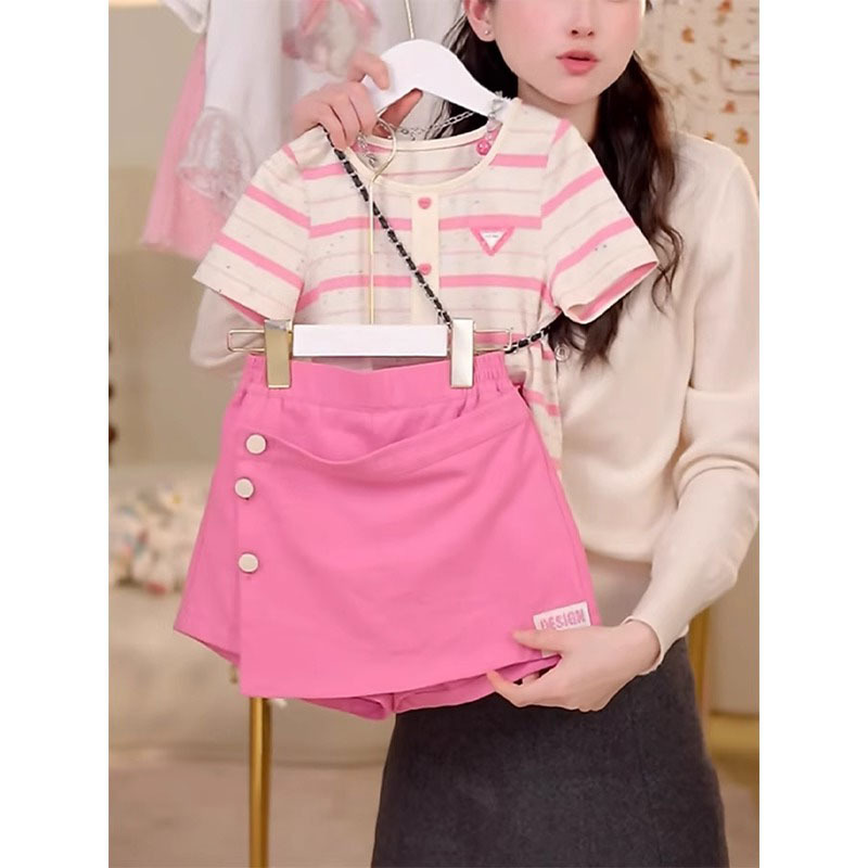 국경 간 소녀 정장 여름 2025 새로운 어린이 반팔 티셔츠 데님 짧은 치마 바지 한국 스타일 투피스 세트