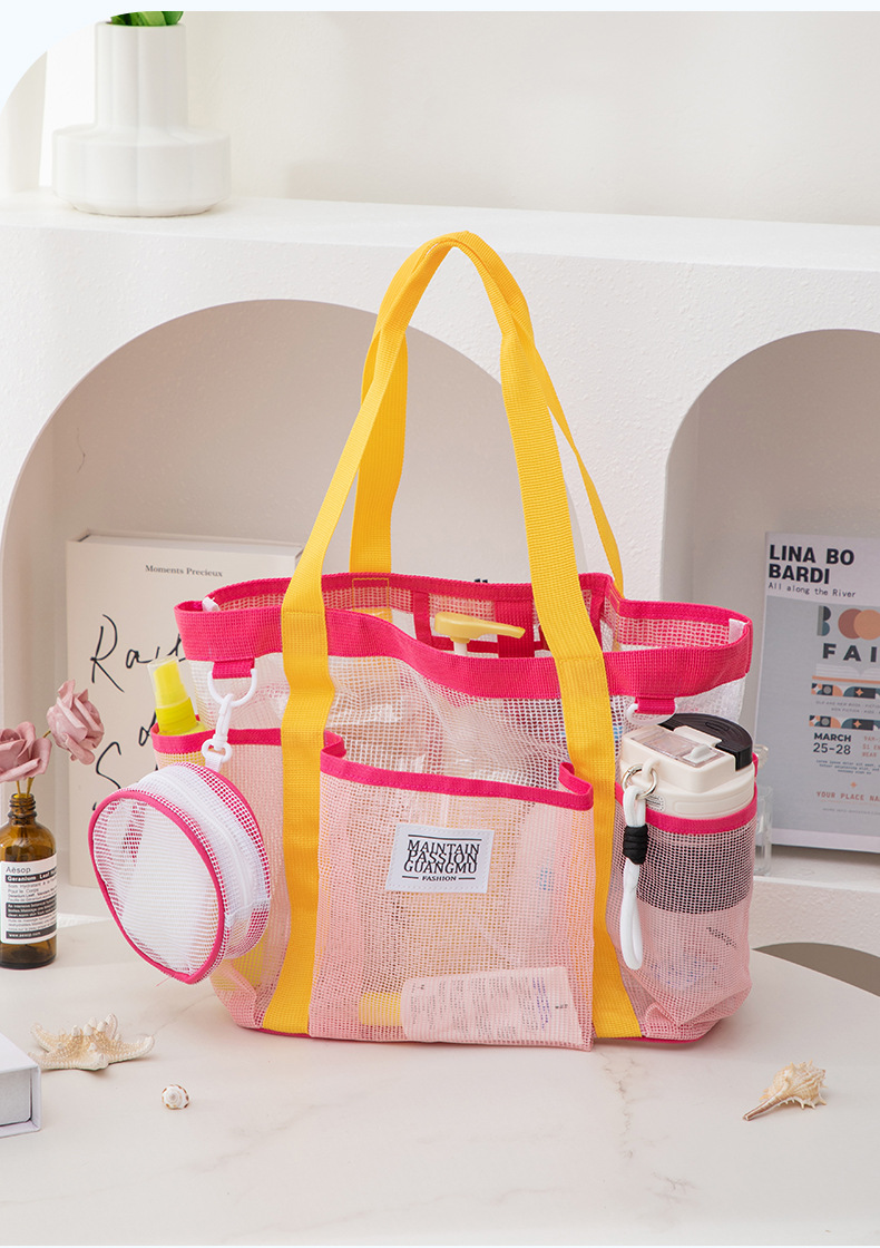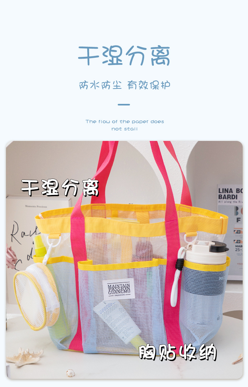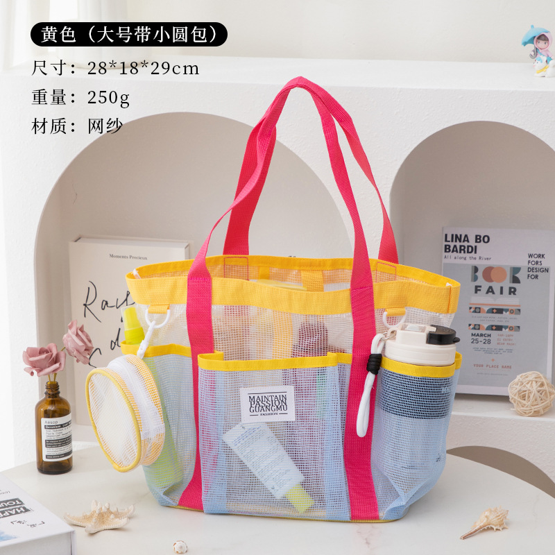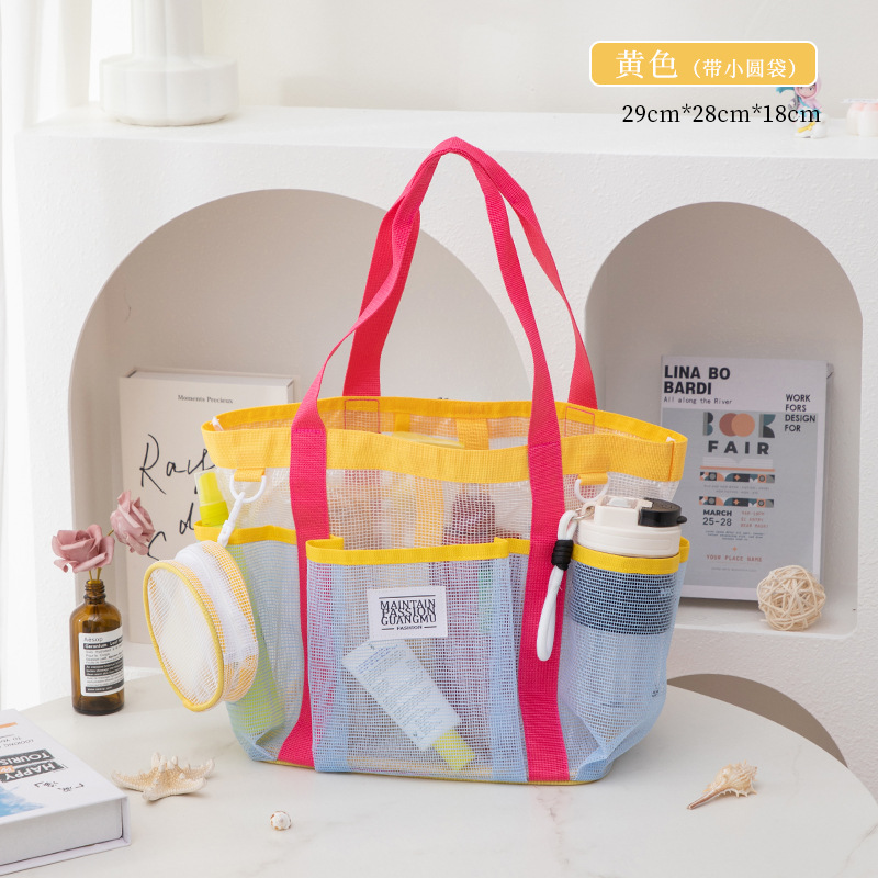 • "노란색 대형 메쉬 화장품 가방 ""습식 및 건식 분리""."