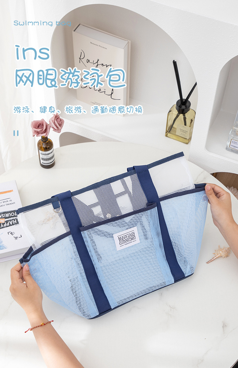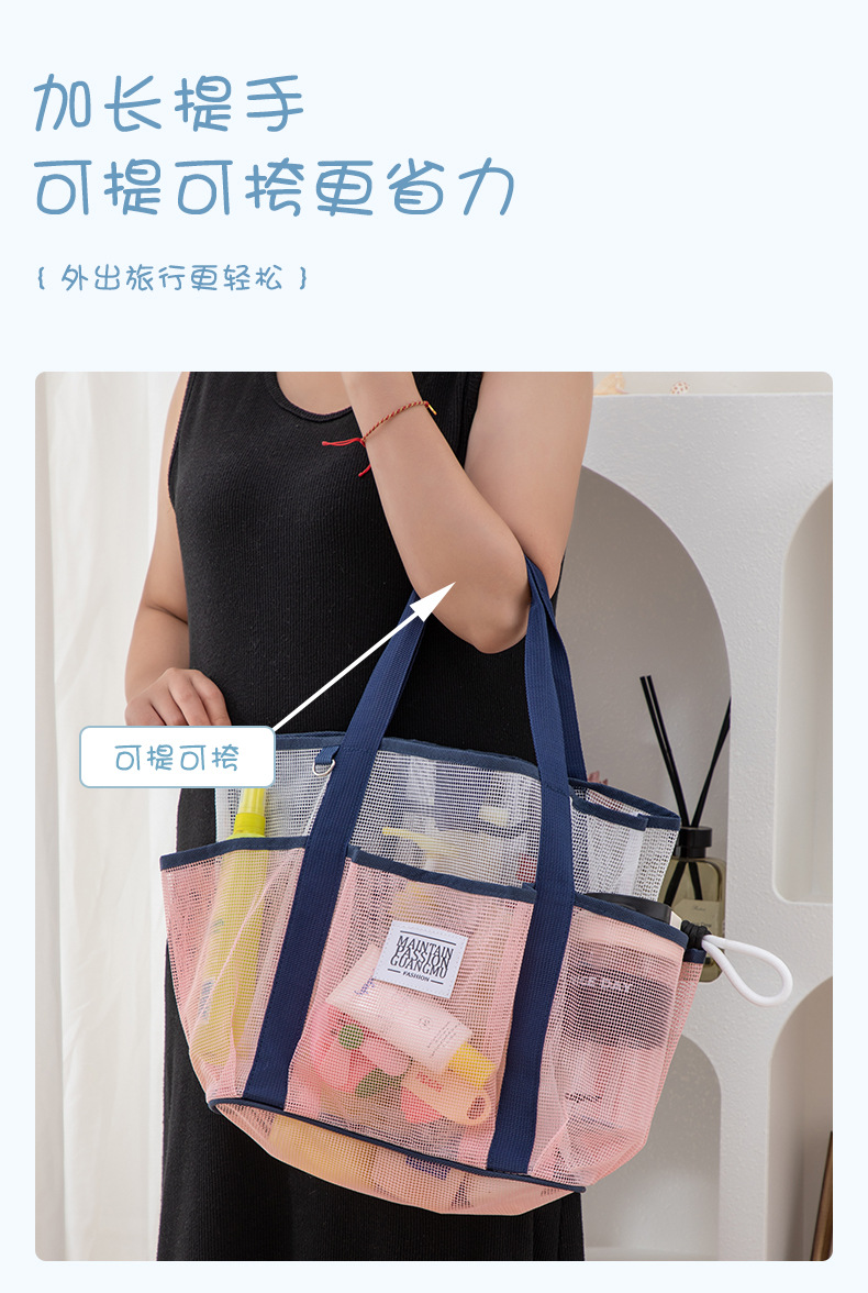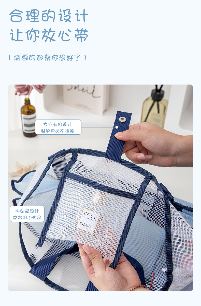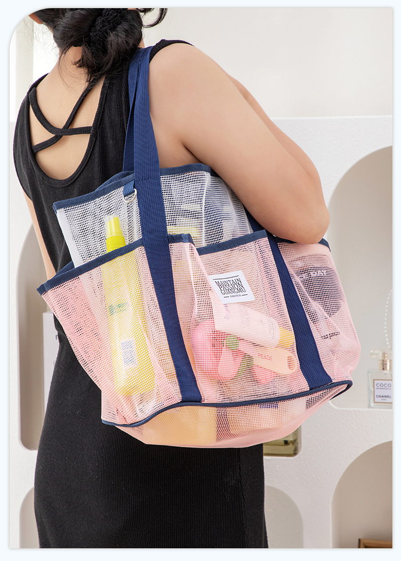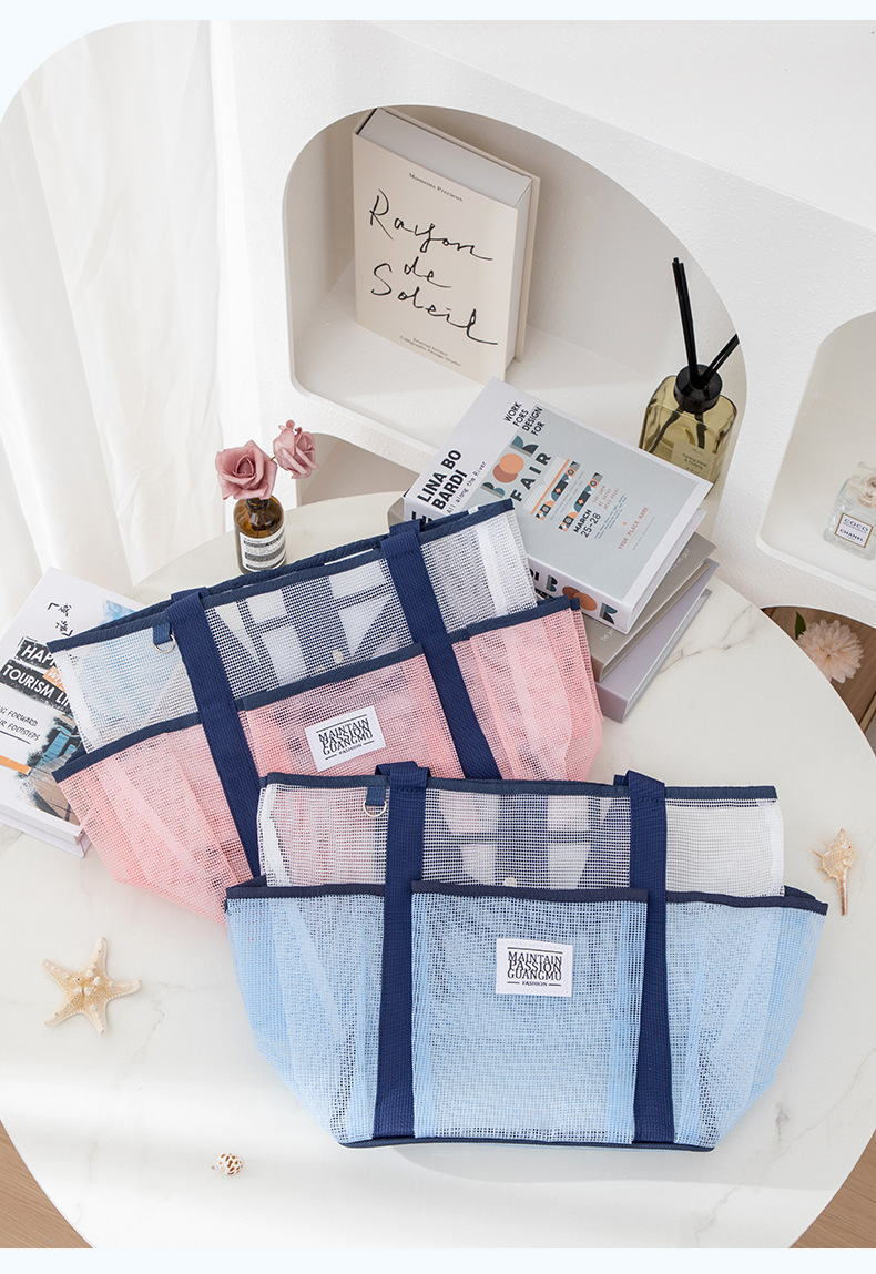 새로운 화장품 가방, 대용량 목욕 및 세면용품 비치백, 여러 개의 포켓이 있는 메쉬 소재의 여행 필수품 수납 가방스토어 가기