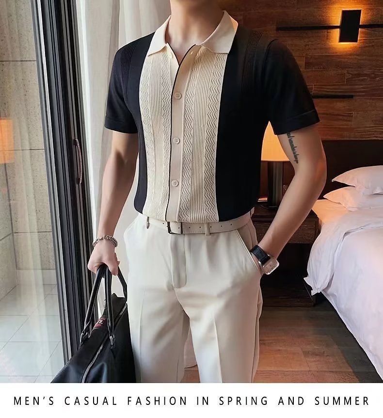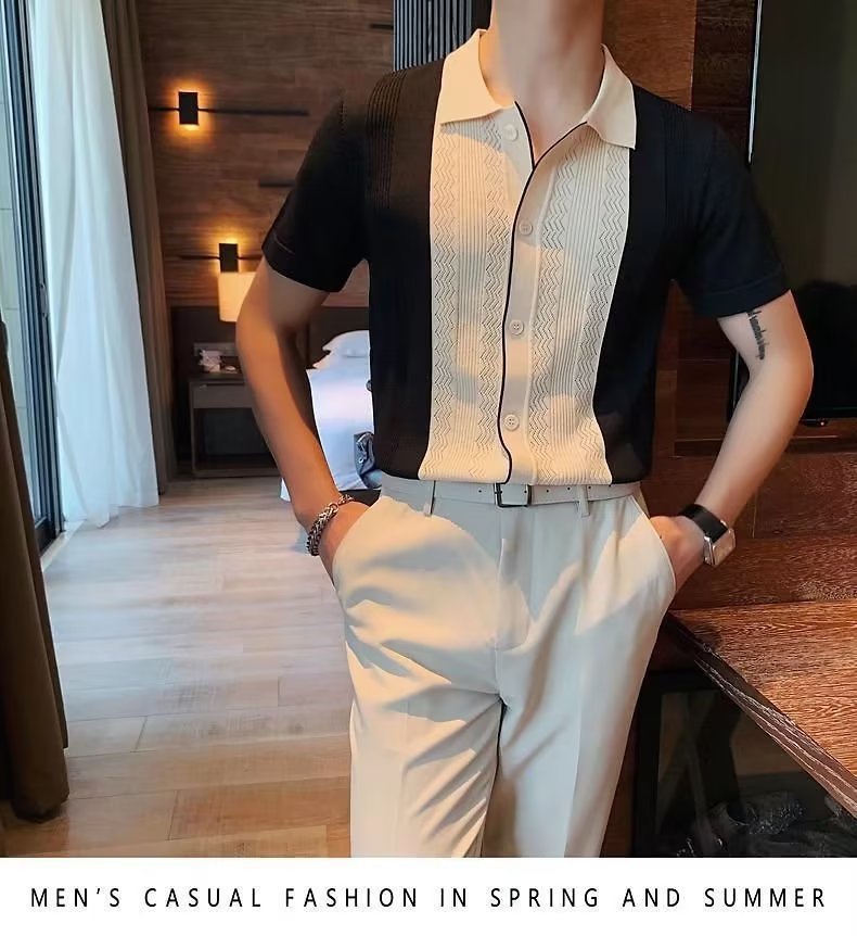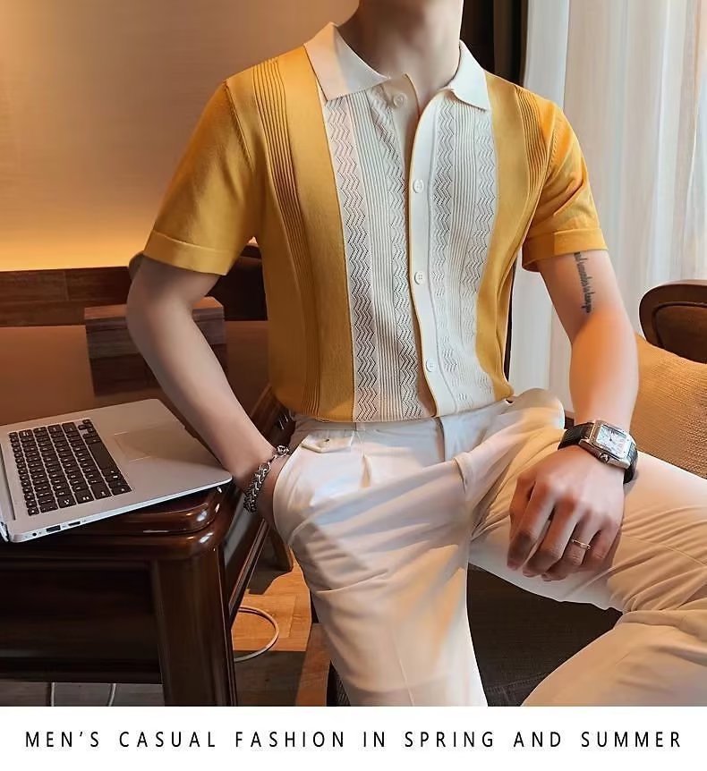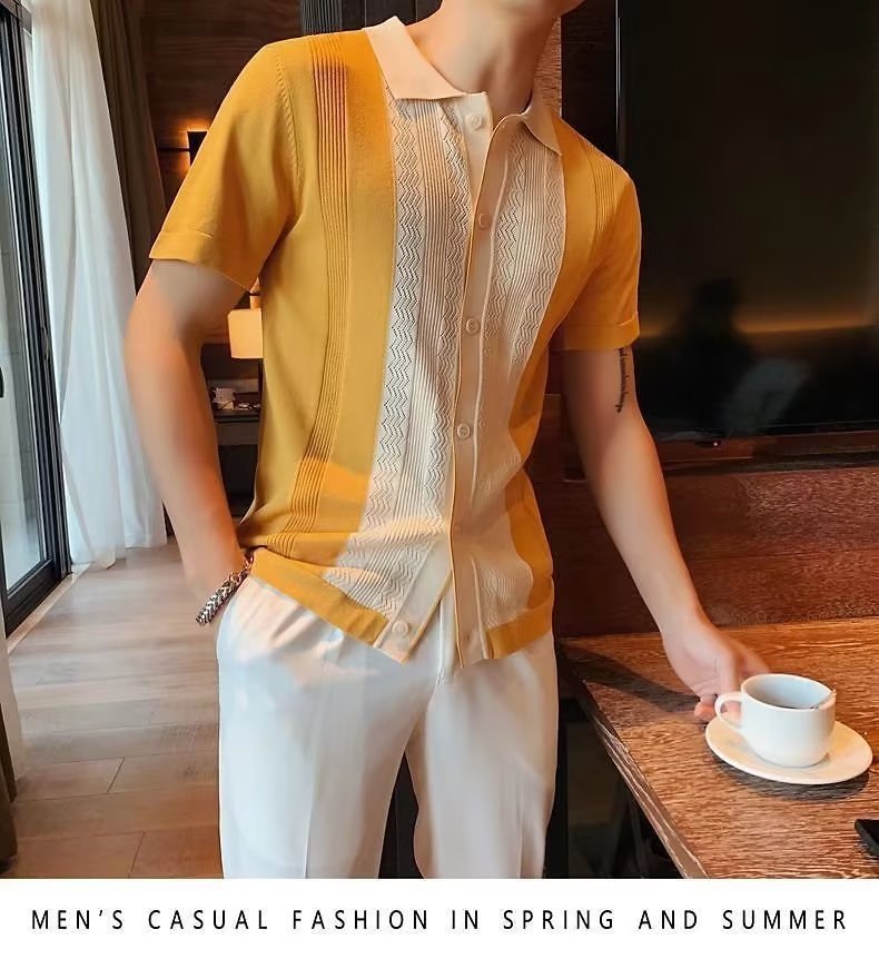 2025 여름 남성 니트 반팔 셔츠 한국 스타일 슬림 솔리드 컬러 아이스 실크 캐주얼 라펠 반소매 셔츠