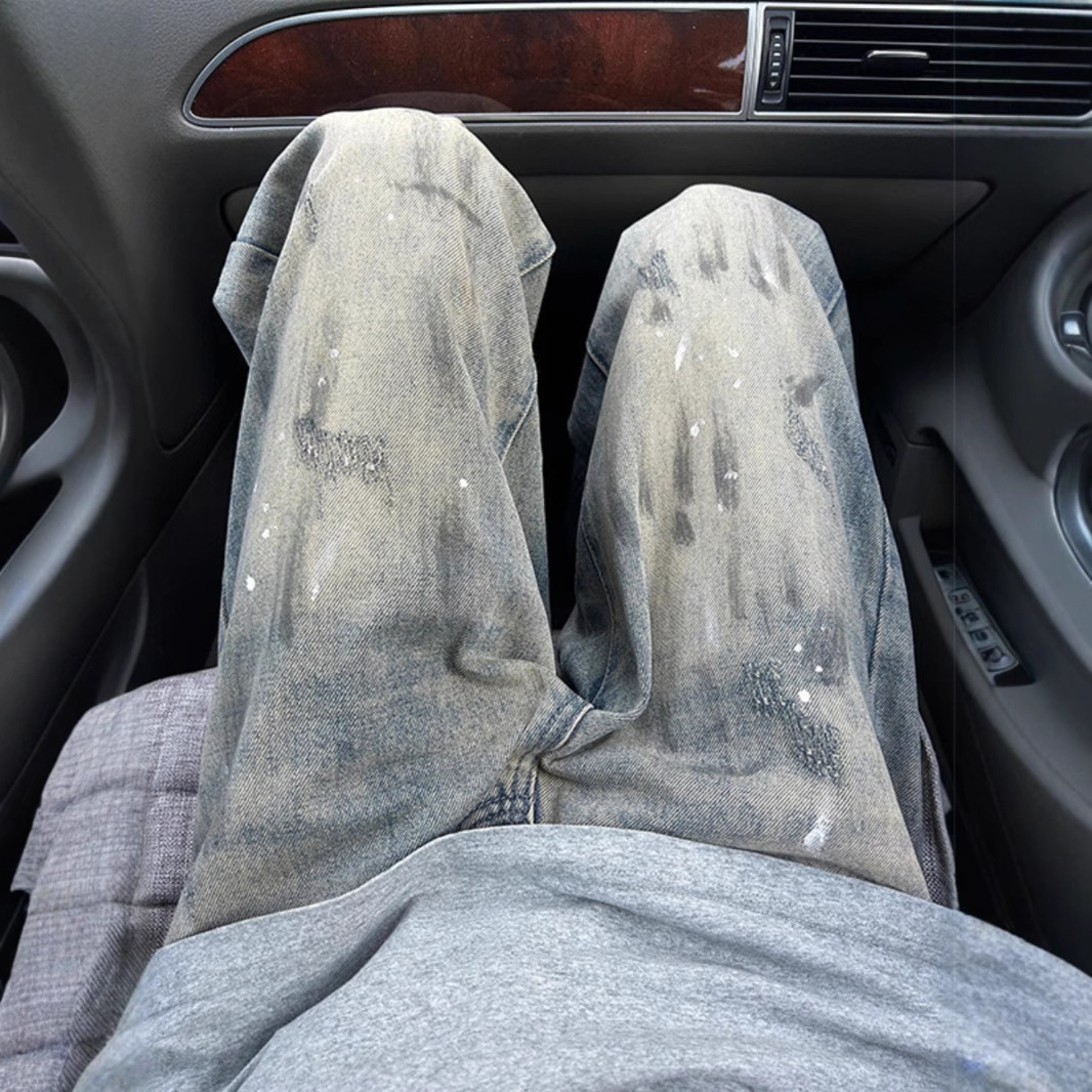 워싱 더티 염색 스플래시 잉크 청바지 남성 트렌디 아메리칸 하이 스트리트 바이브 팬츠 디자인 스트레이트 칼 모양의 부츠컷 팬츠스토어 가기