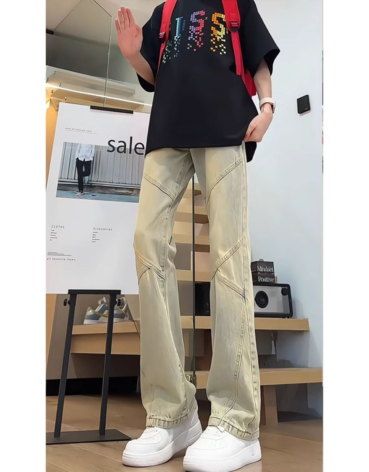 남성용 세이버 마이크로 플레어 청바지 여름 아메리칸 하이 스트리트 틈새 스플라이싱 스트레이트 슬리밍 팬츠스토어 가기